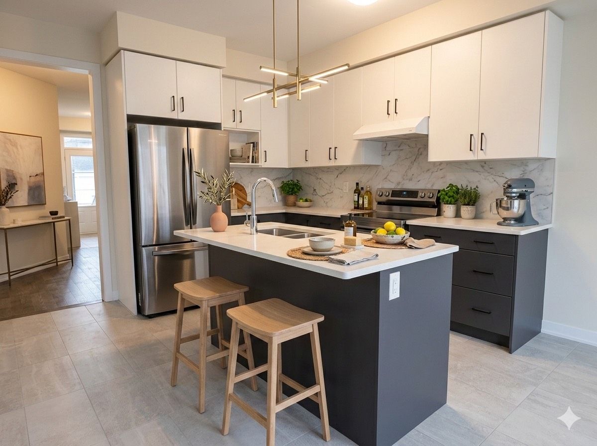 • Modern kitchen features granite countertops and stainless steel appliances.