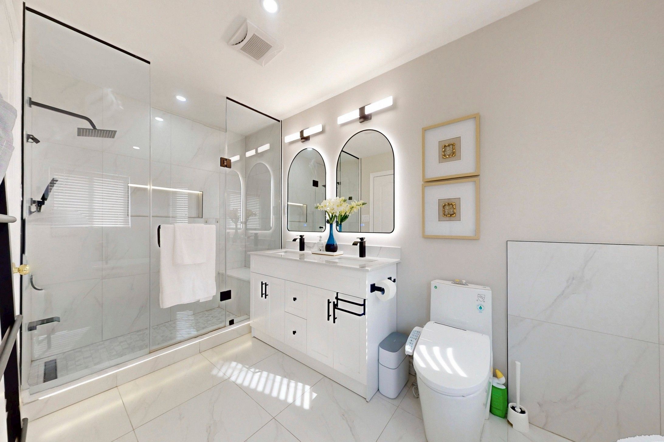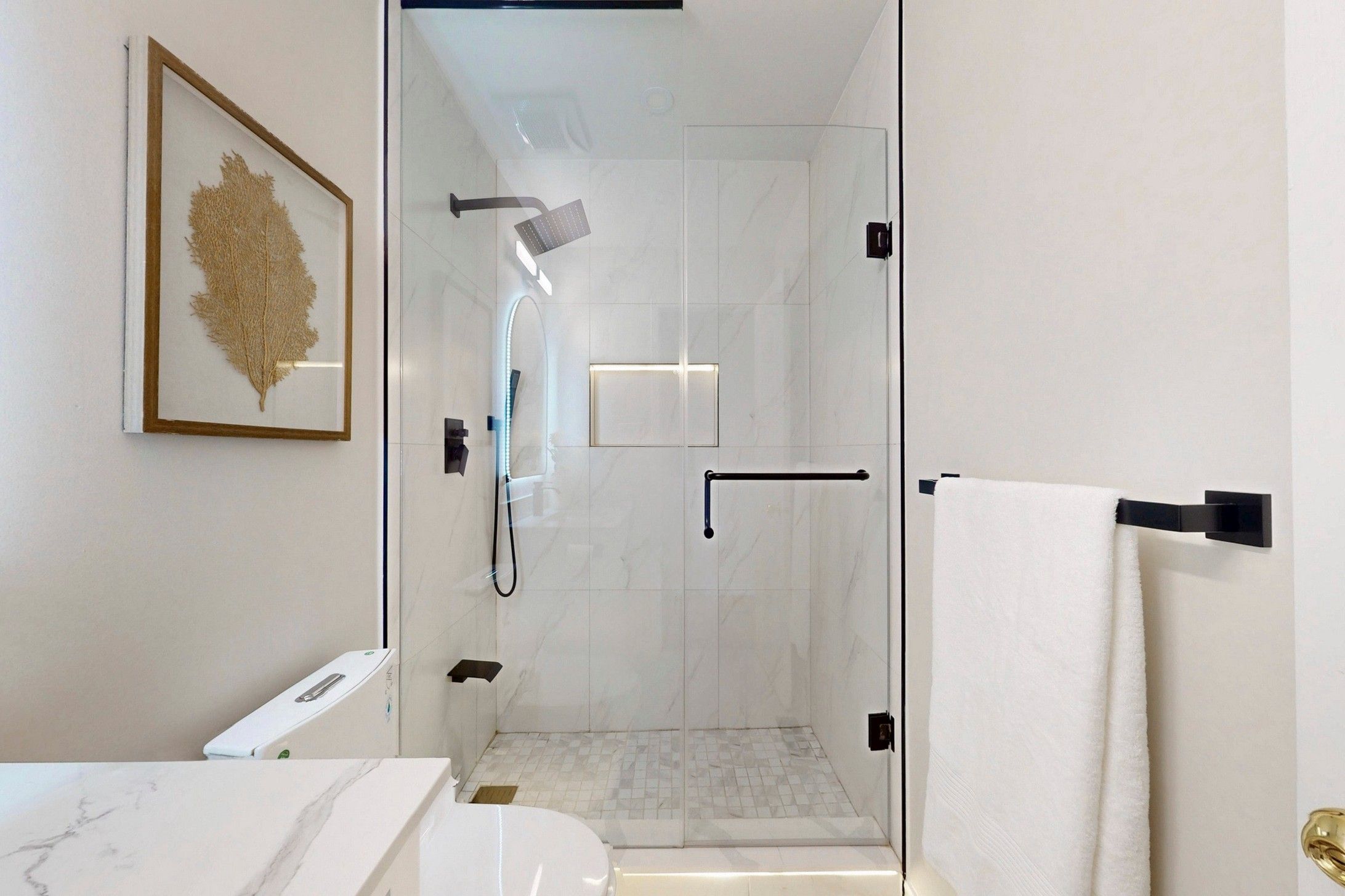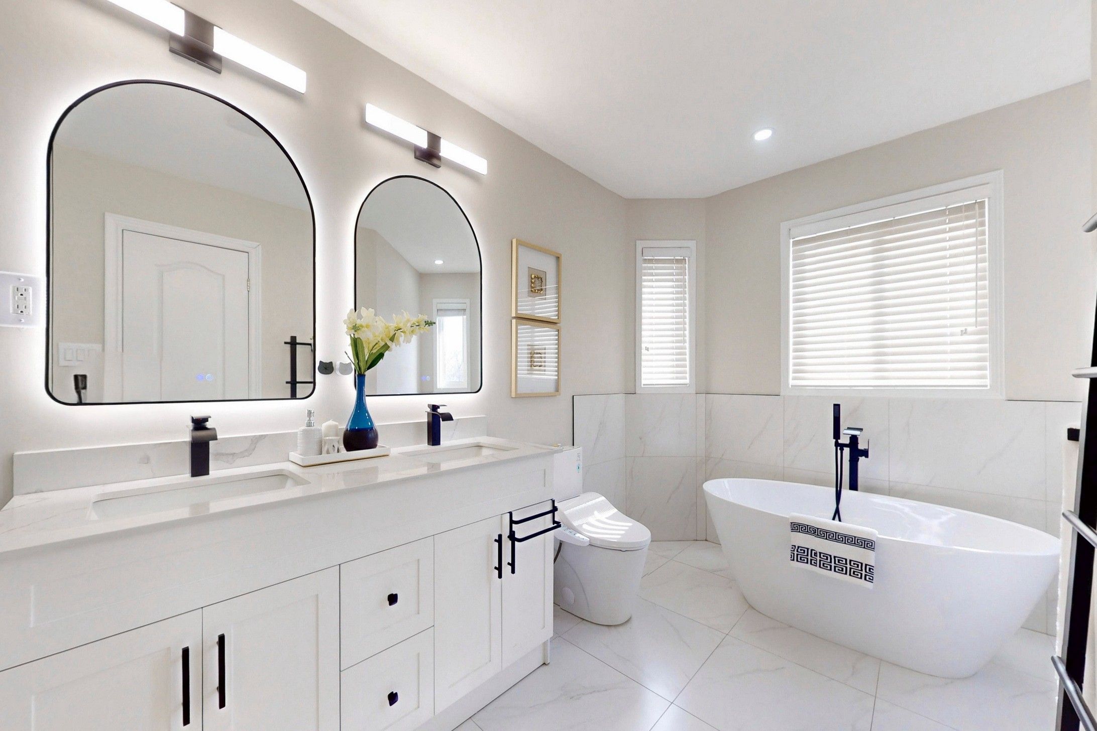 • Modern primary ensuite features upscale finishes and generous lighting.