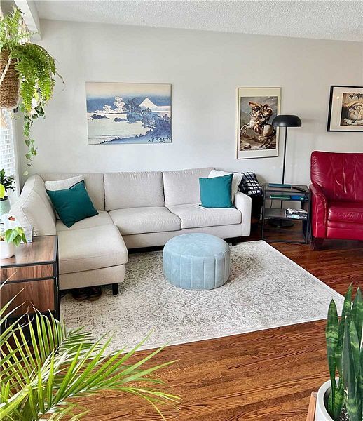 • Bright open-concept living and dining room with large bay window.