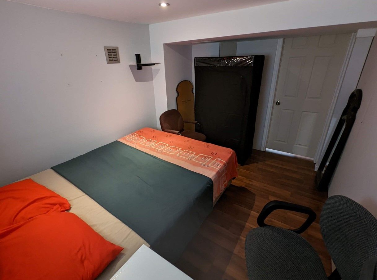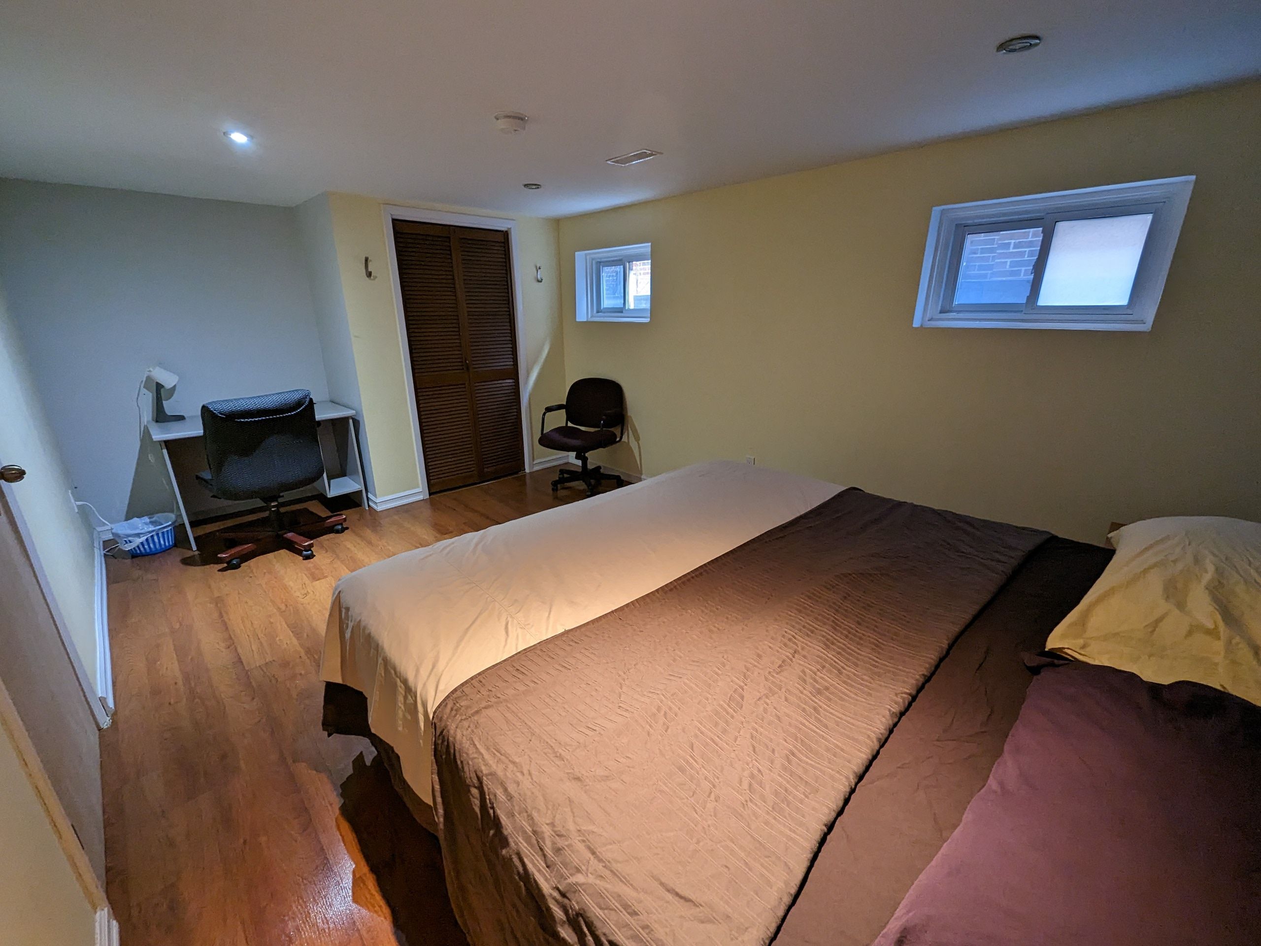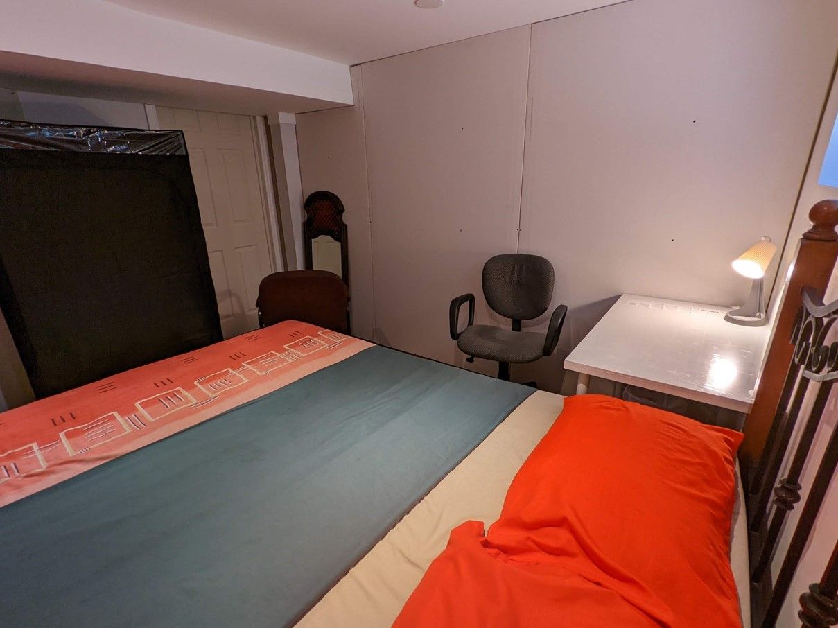 • Fully furnished three-bedroom half basement with ground-level windows.