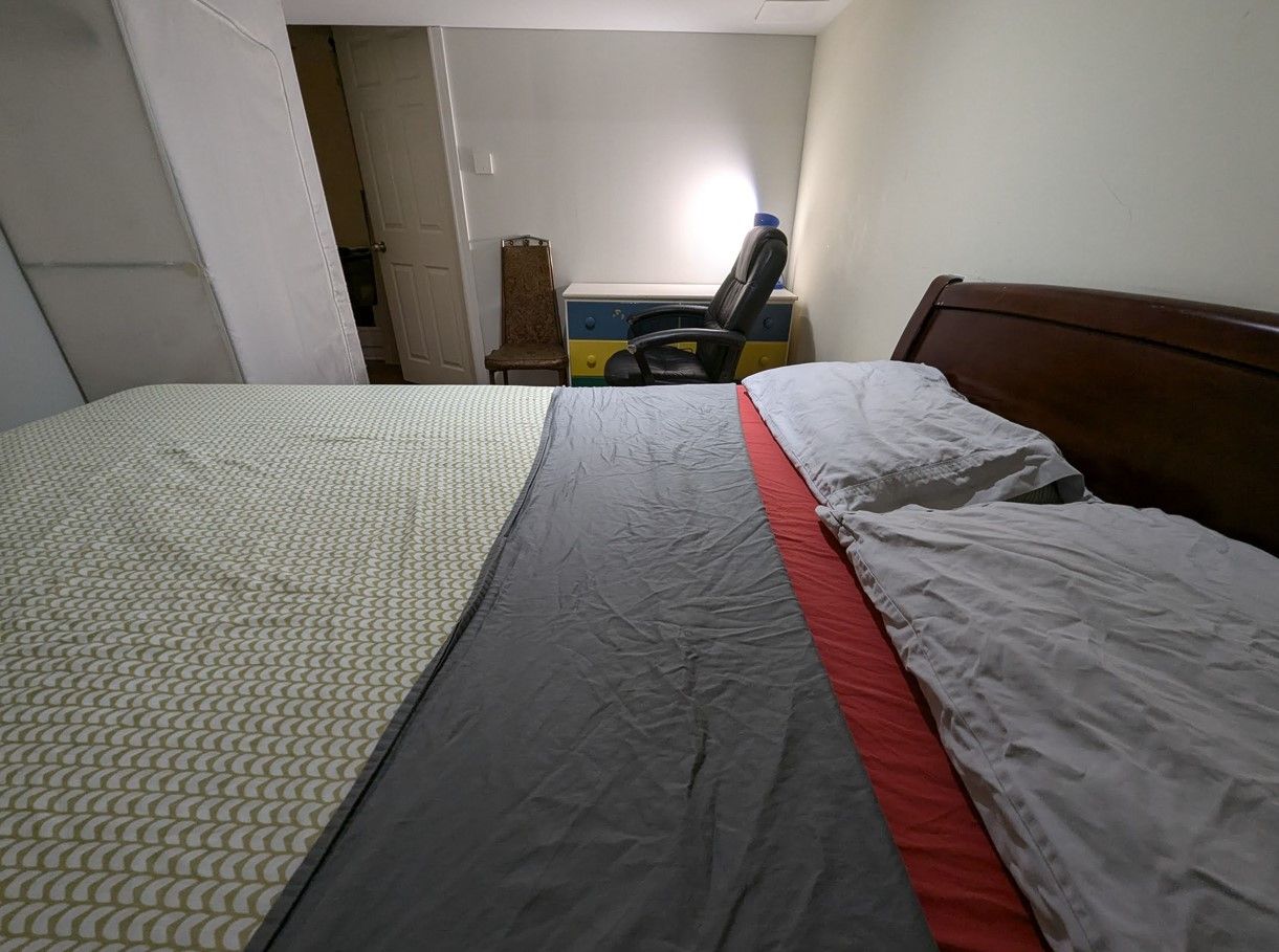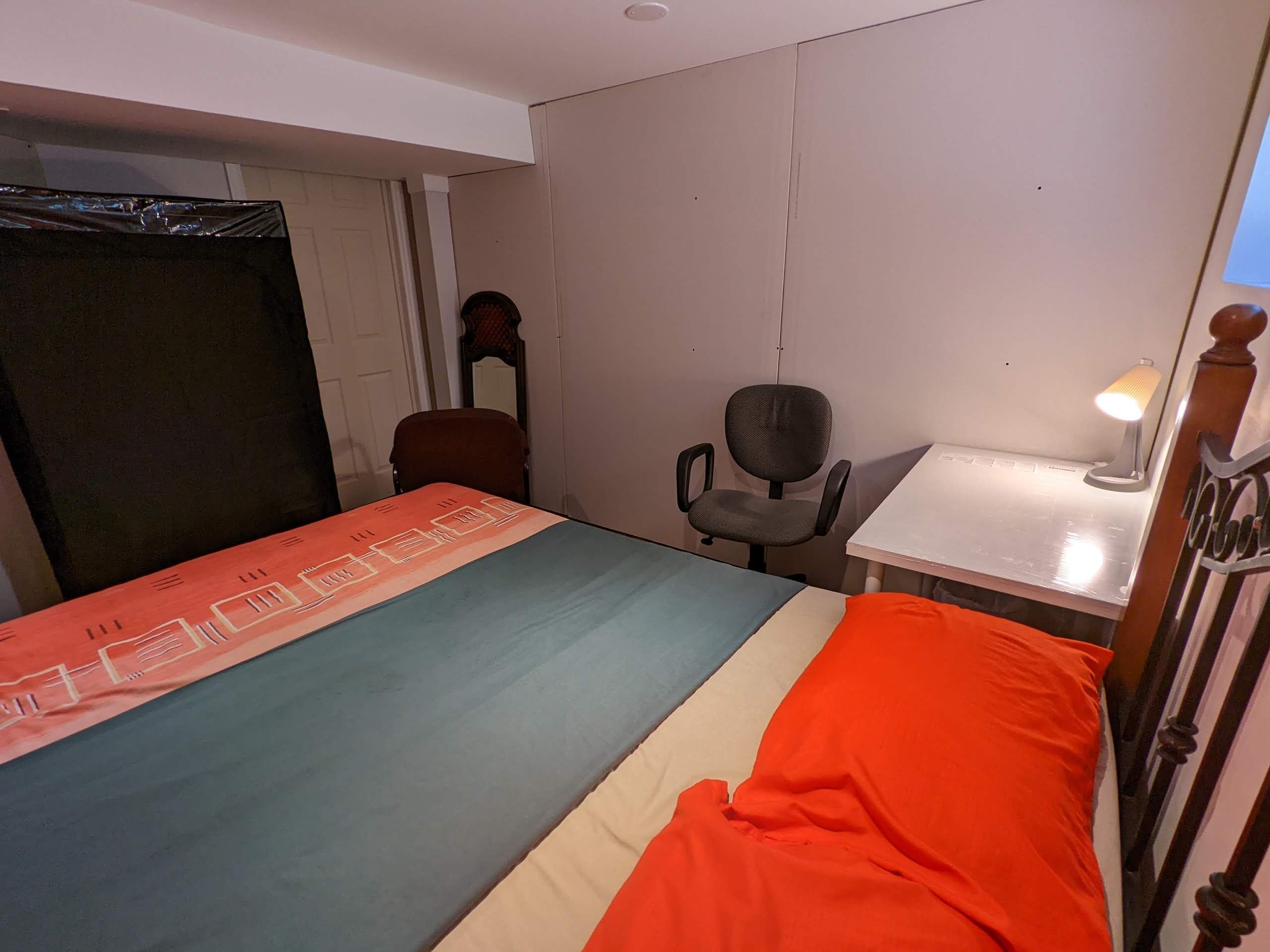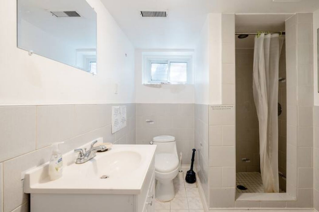 • Fully furnished three-bedroom half basement with ground-level windows.
