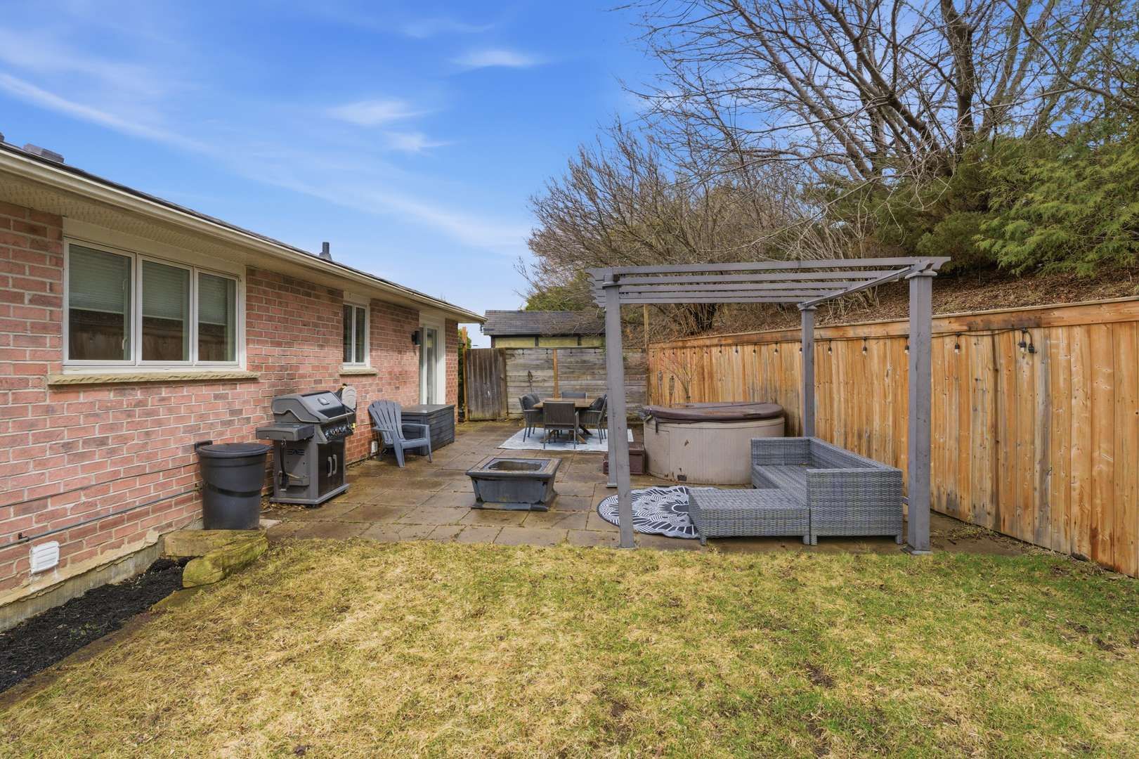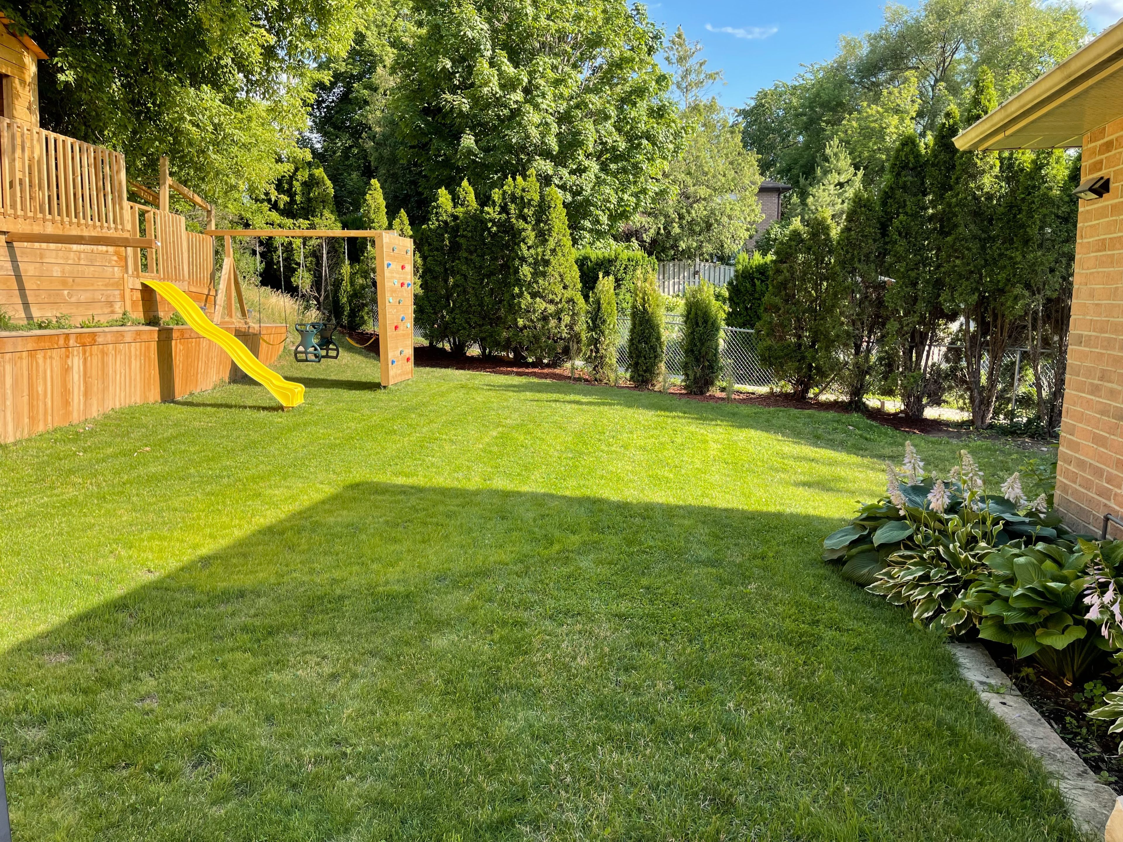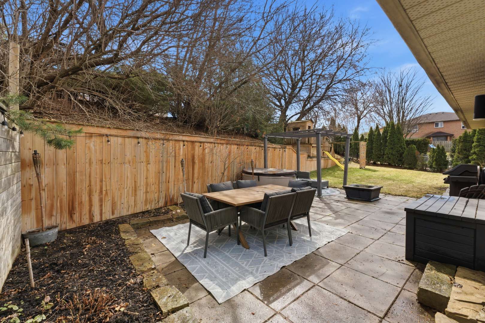 • Private backyard features tree house, swings, and hot tub for relaxation.