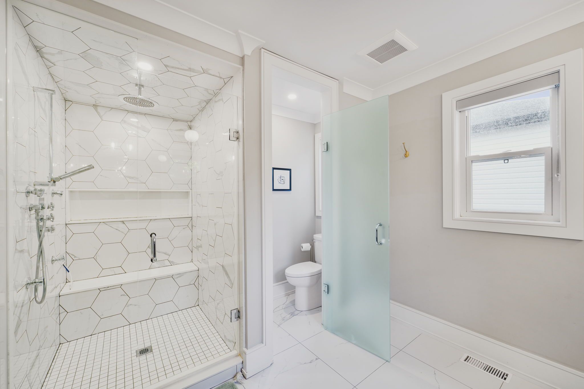 • Cozy bedroom with custom closets and a luxurious spa-like shower.
