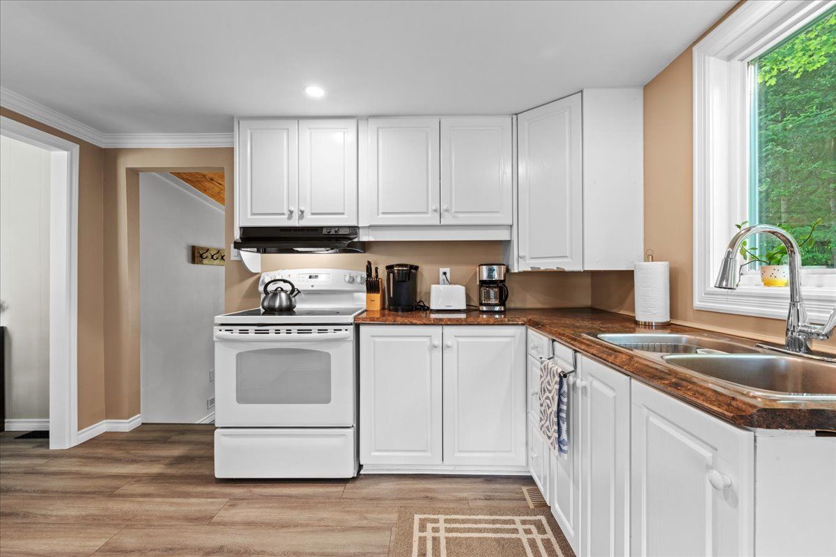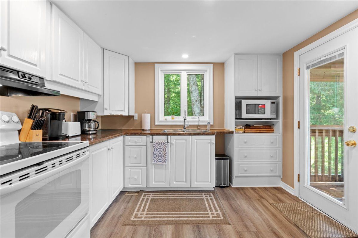 • Functional kitchen with patio doors leading to a screened-in sun-porch.