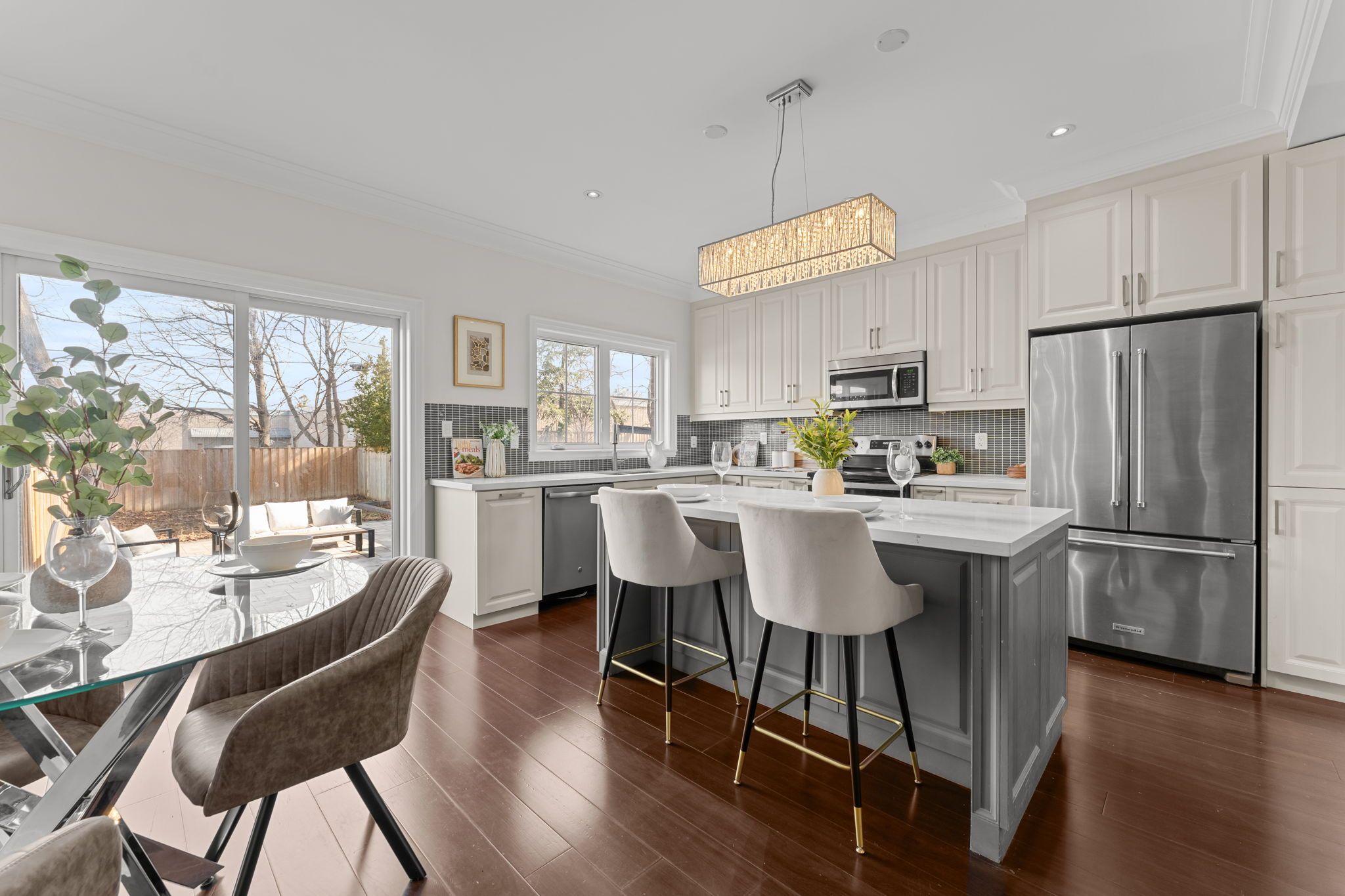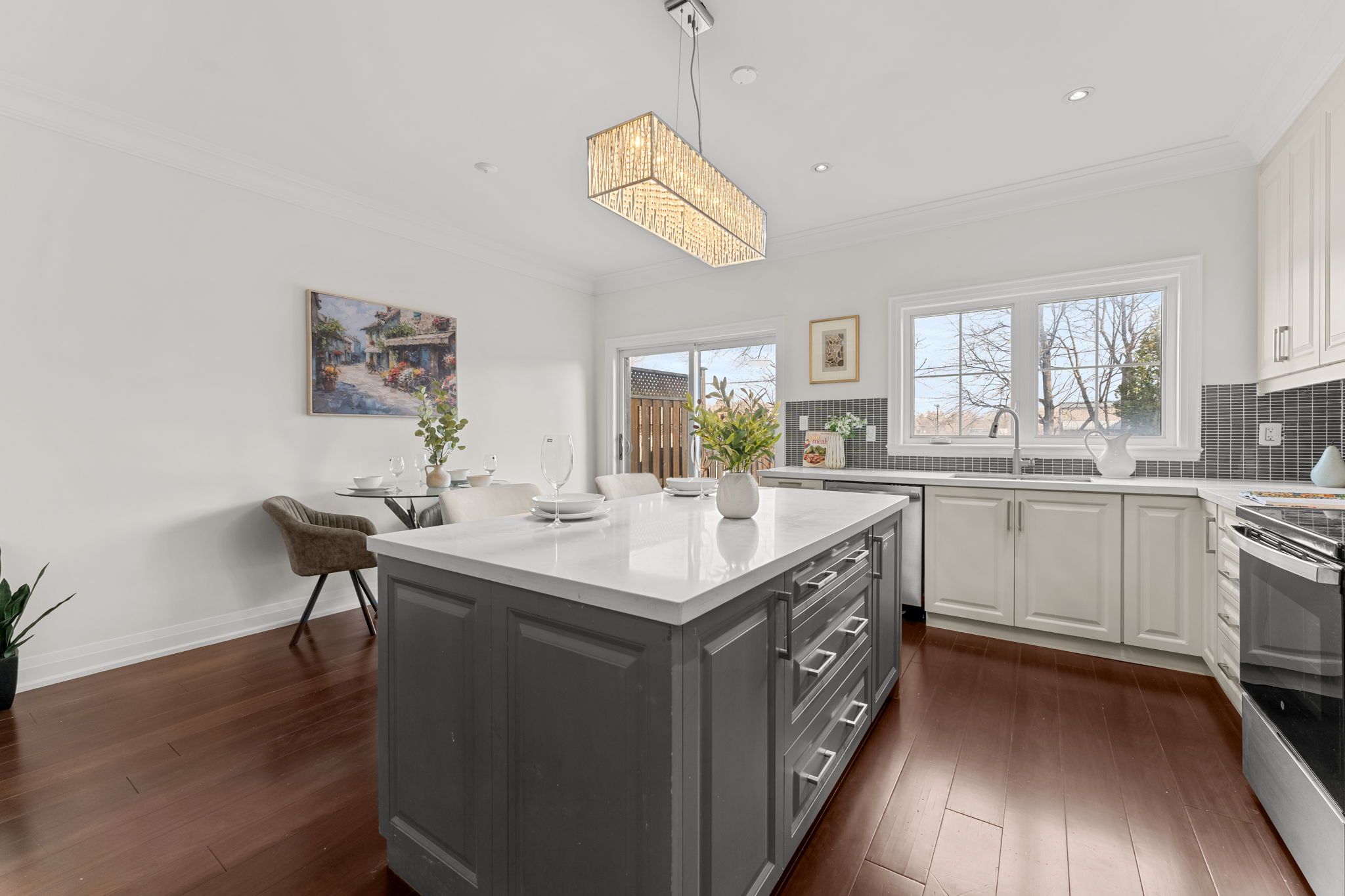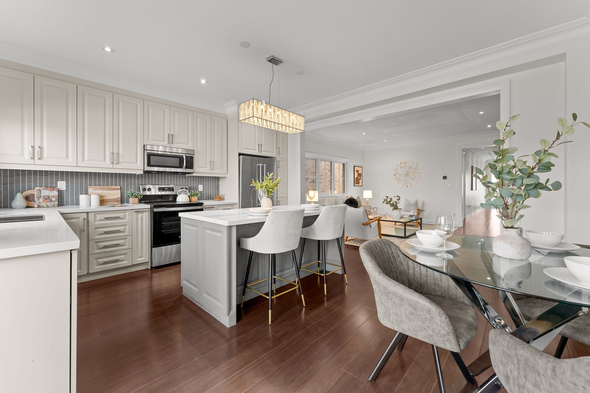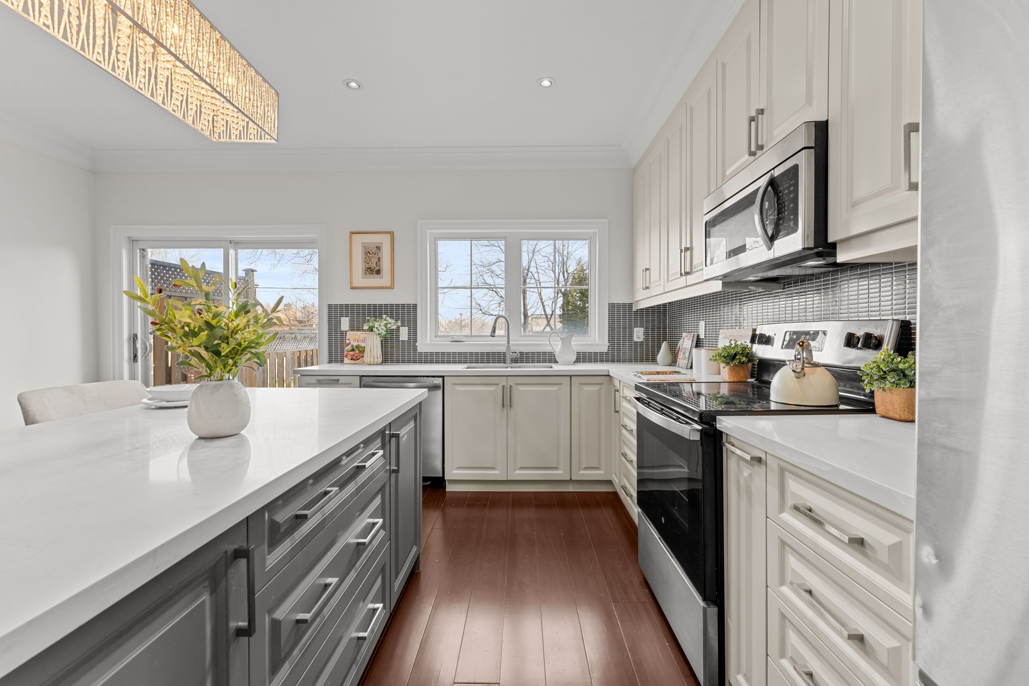 • Gourmet kitchen with stainless steel appliances and a large centre island.