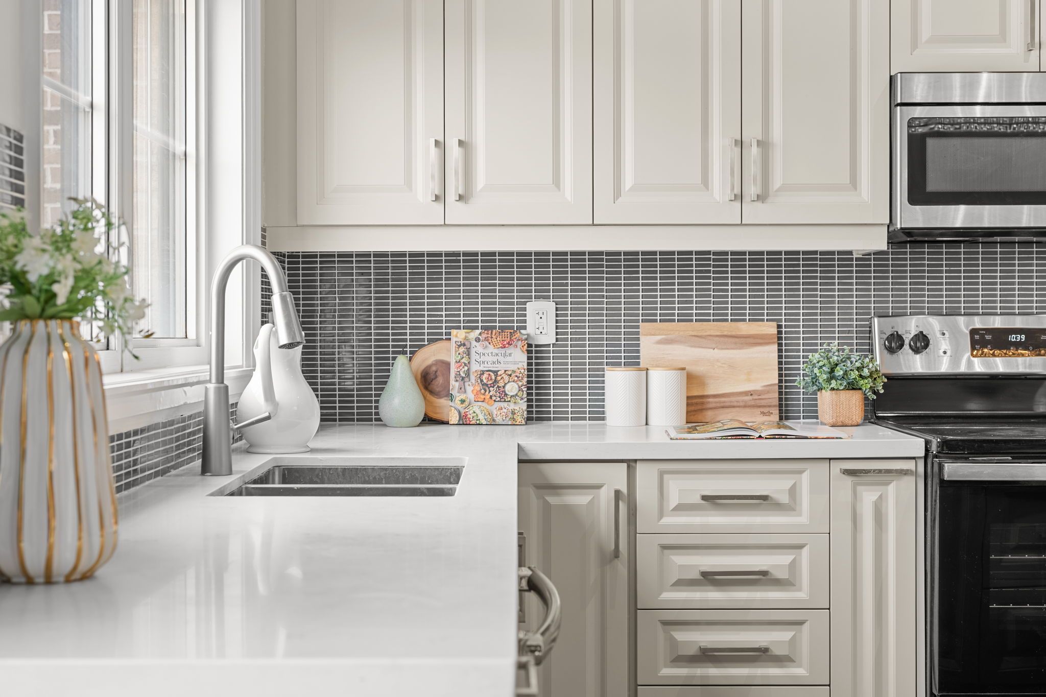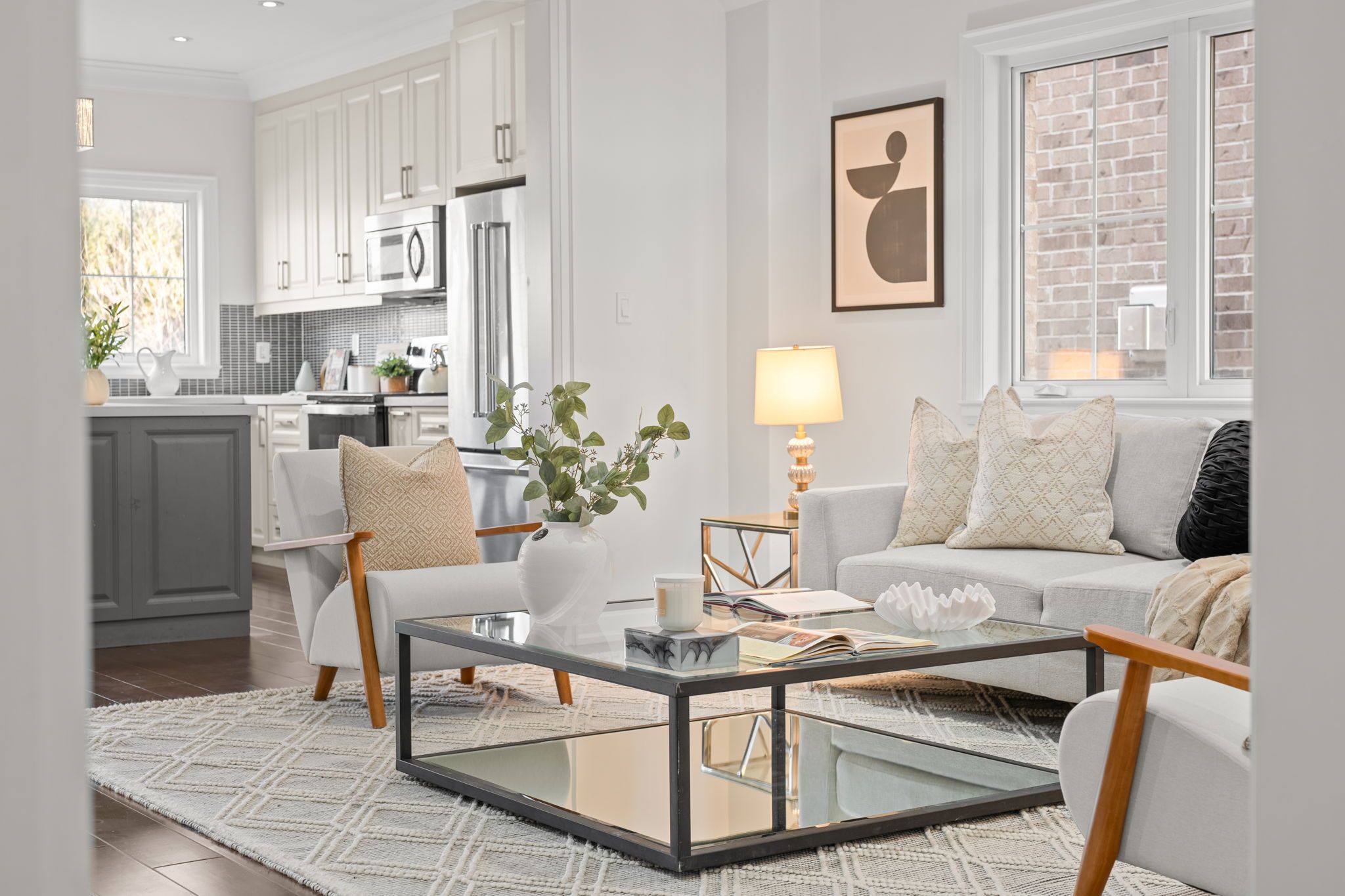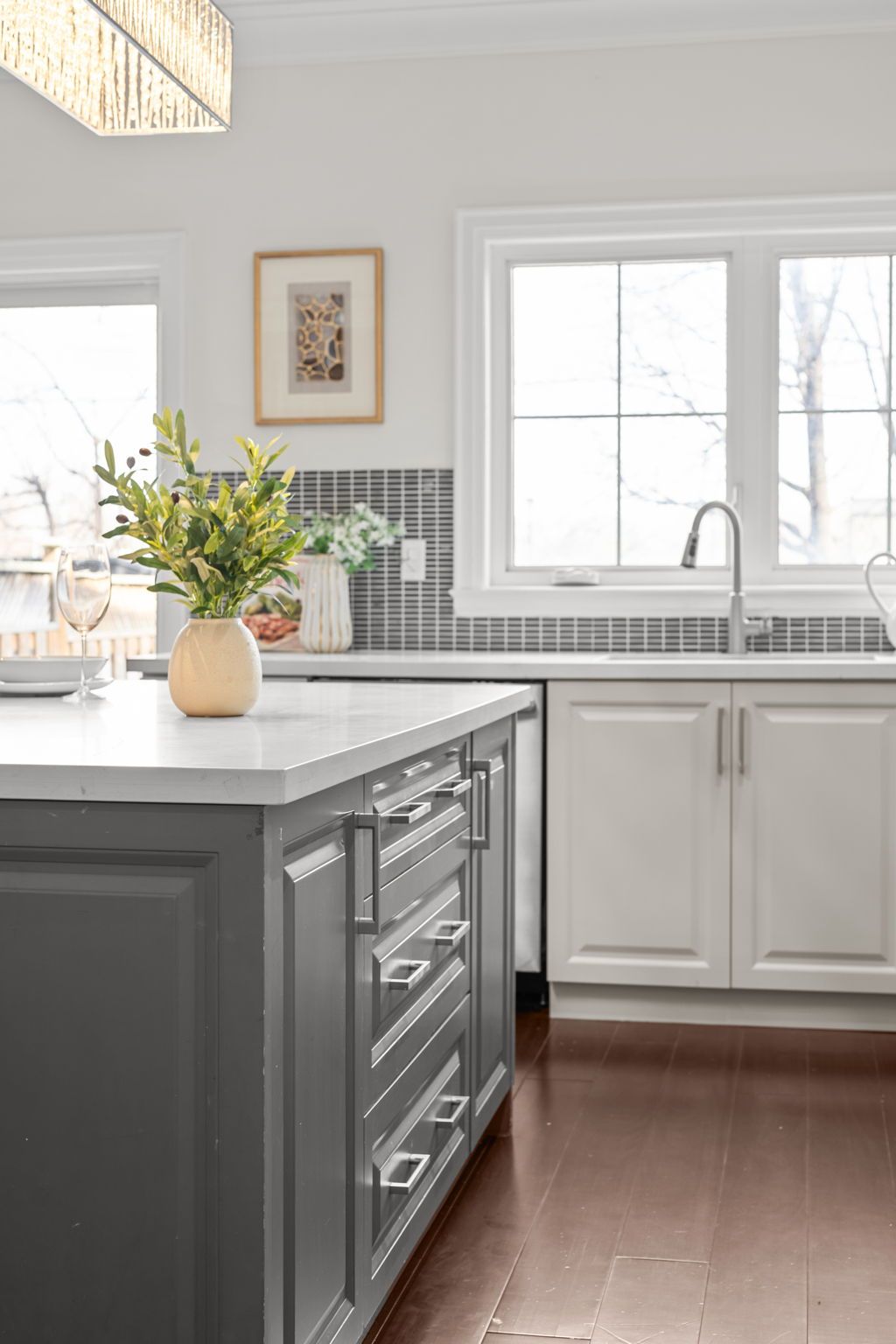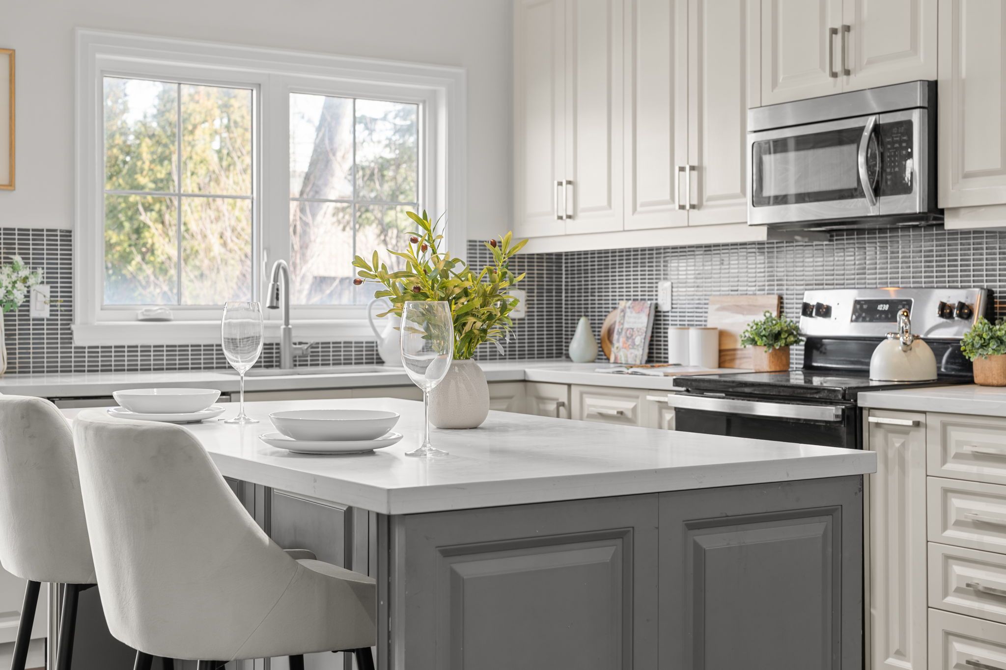 • Gourmet kitchen with stainless steel appliances and a large centre island.