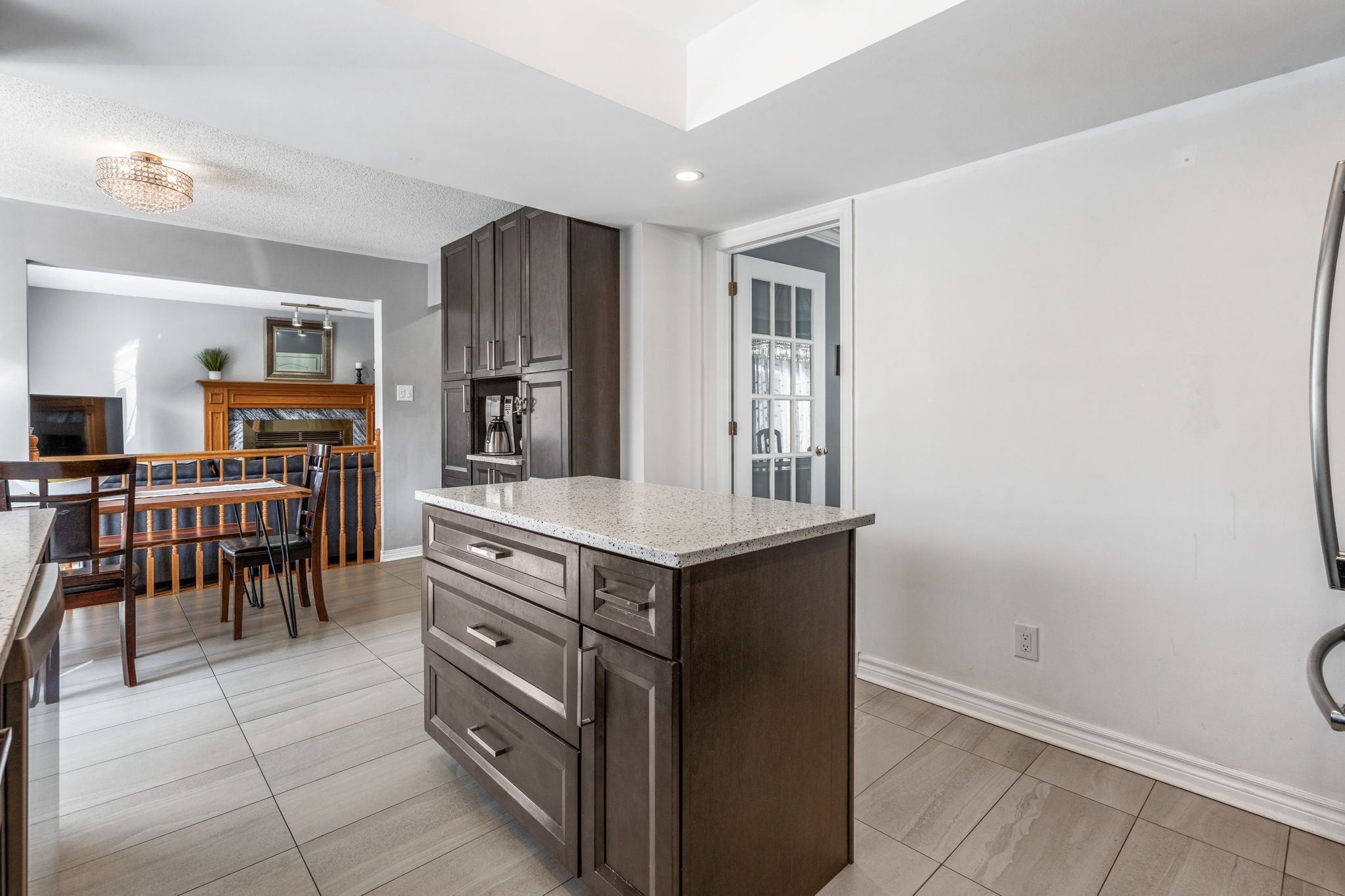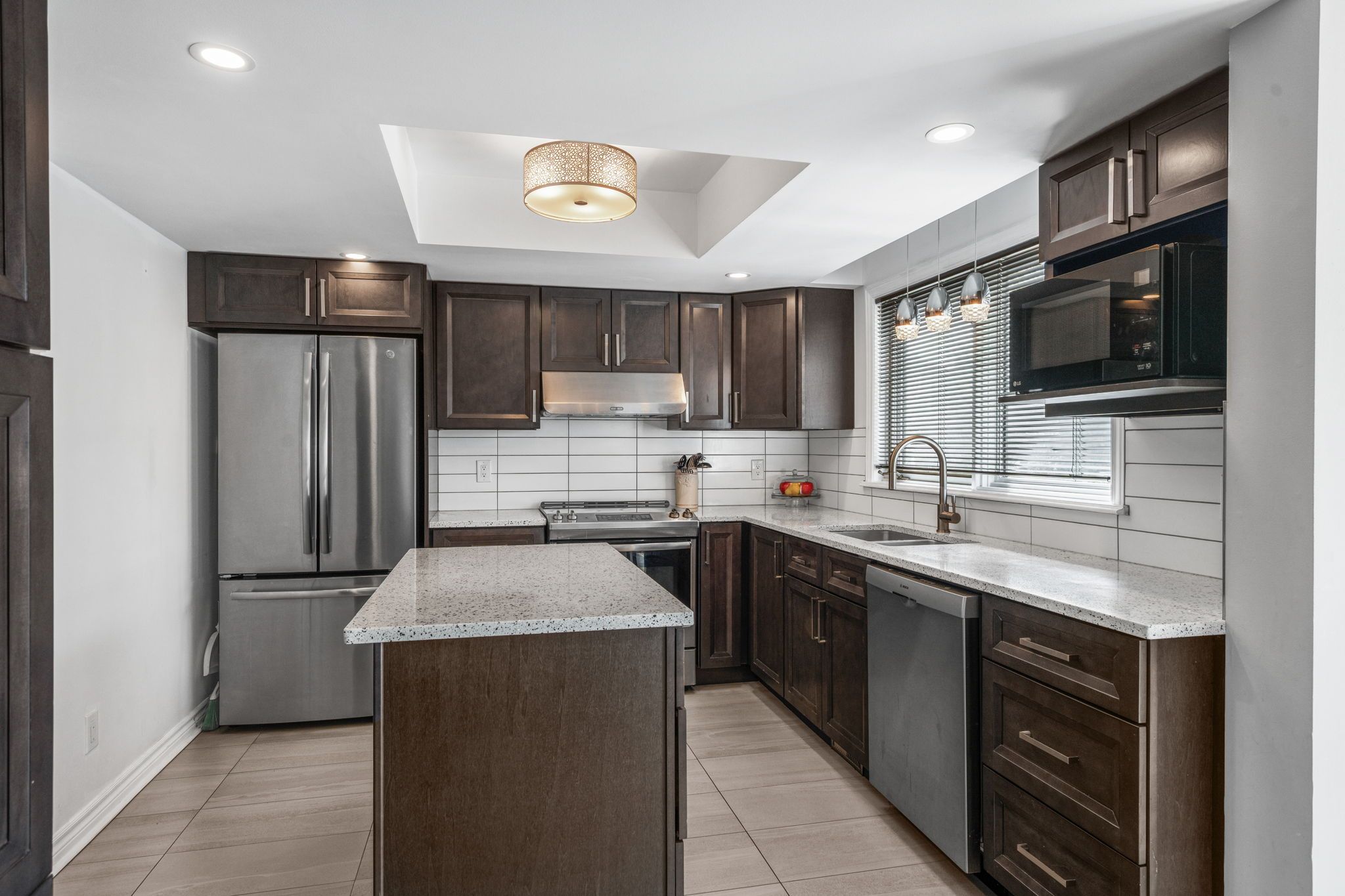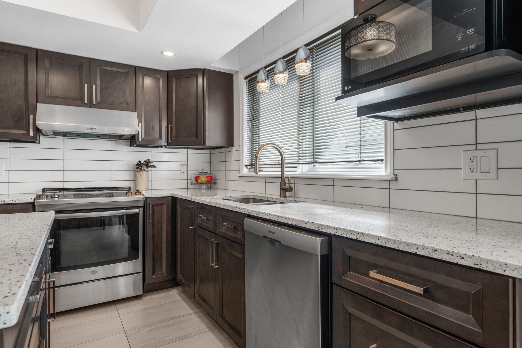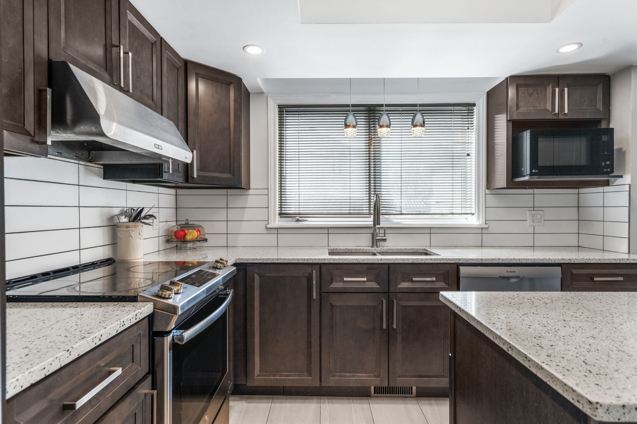 • Renovated chef's kitchen with dark wood cabinetry and quartz countertops.