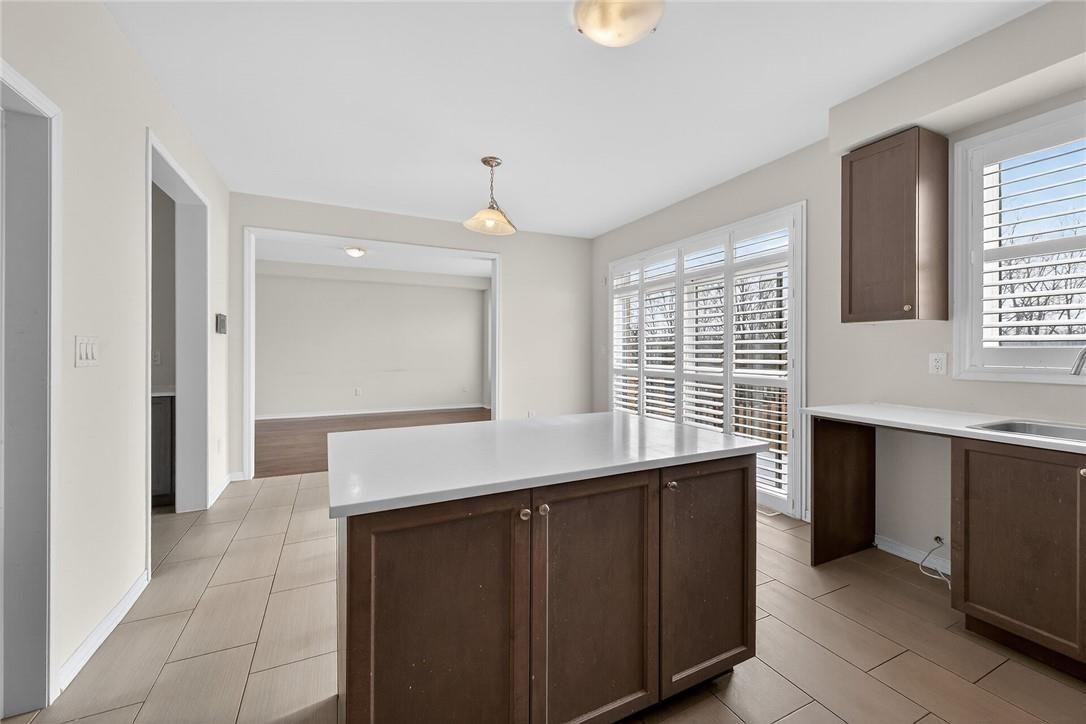 • Eat-in kitchen with tile flooring flows into living and dining areas.
