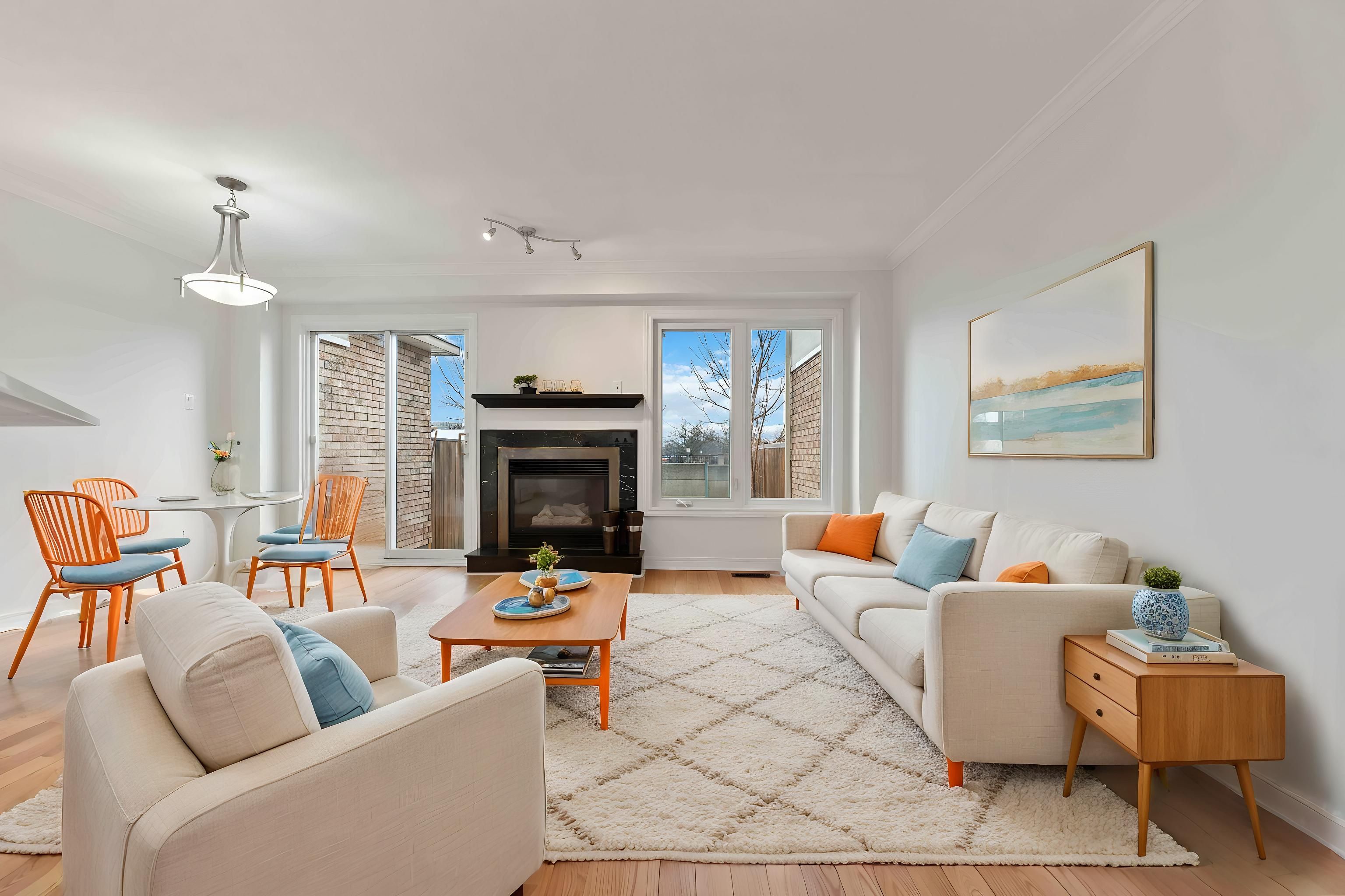 • Bright main level with hardwood floors and cozy fireplace for relaxation.