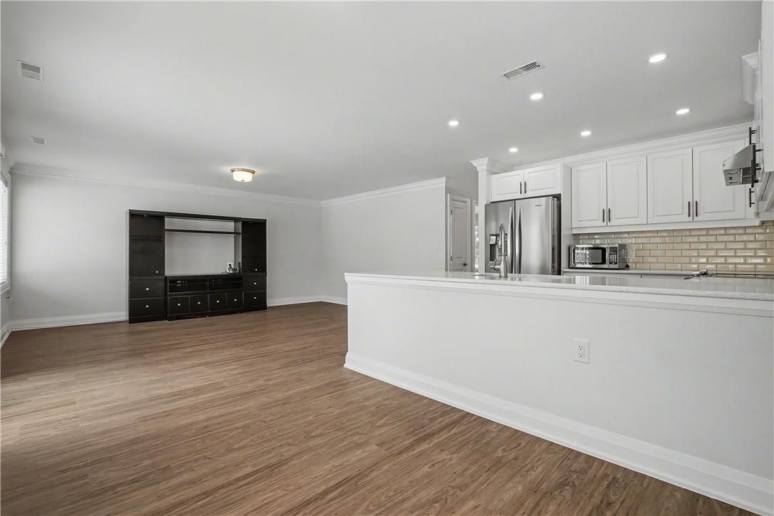 • Spacious kitchen with stainless steel appliances and quartz countertops.