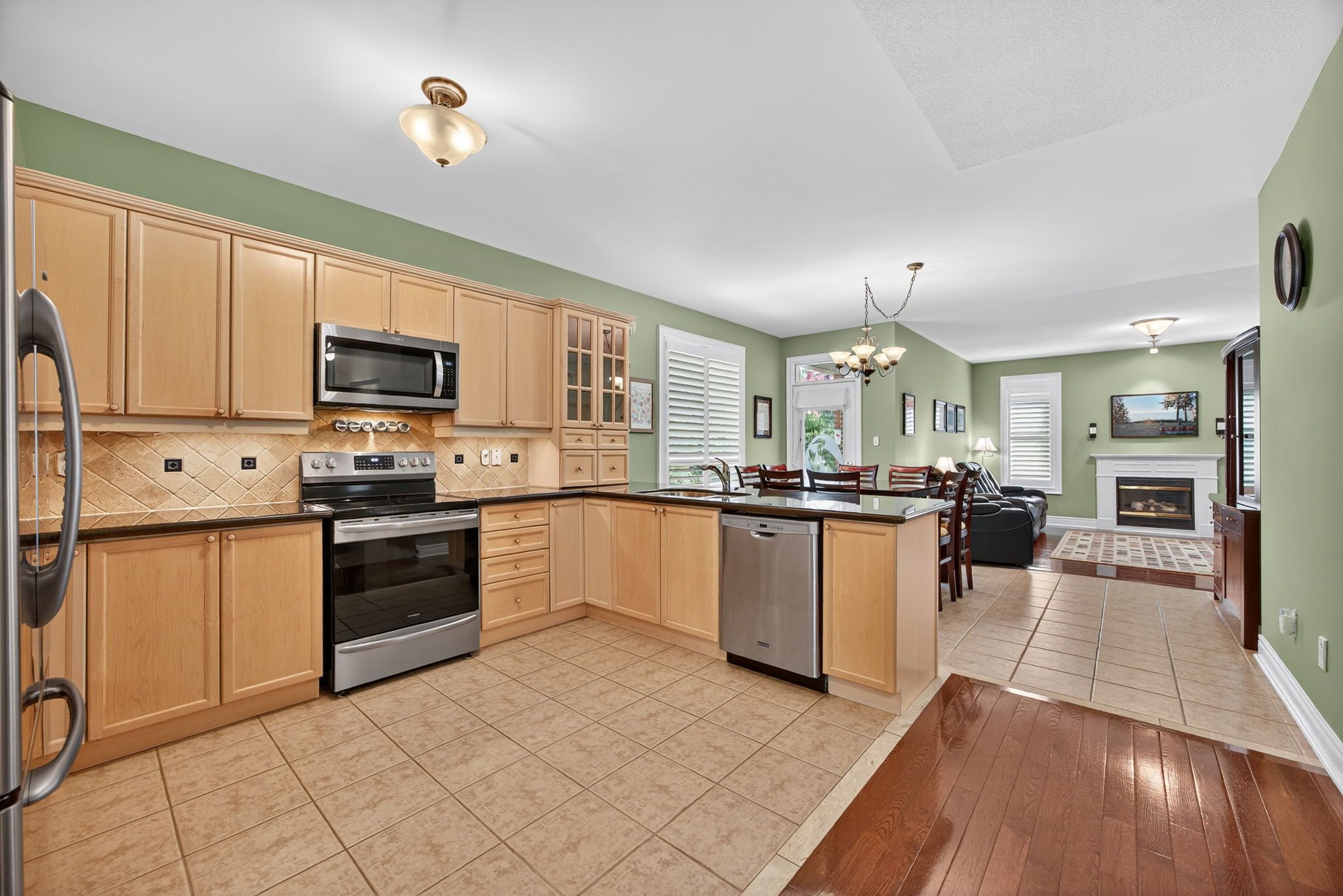 • Open-concept layout featuring hardwood floors and a gas fireplace.