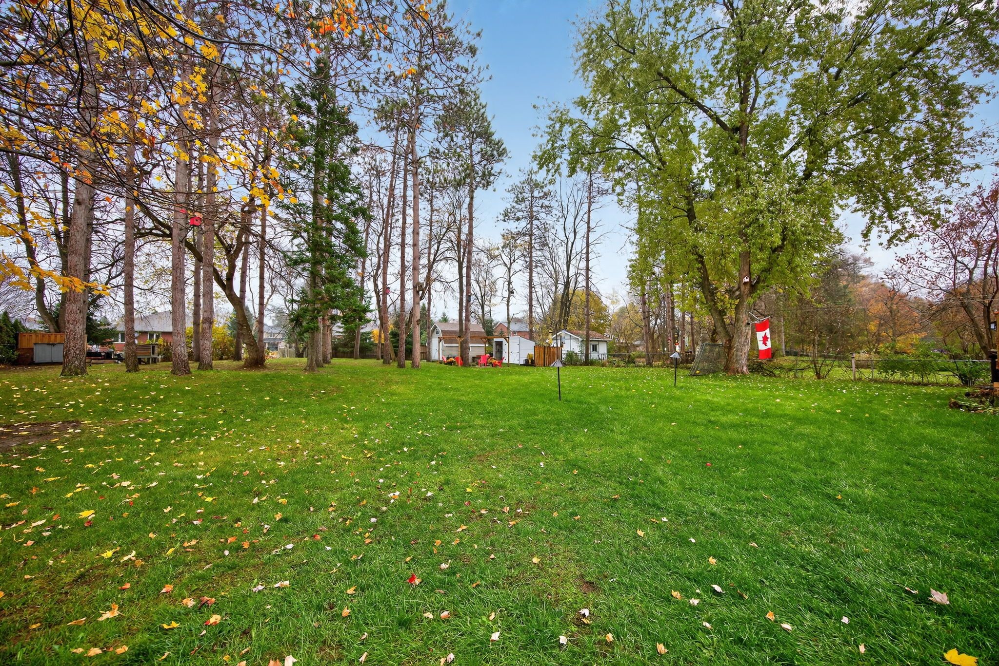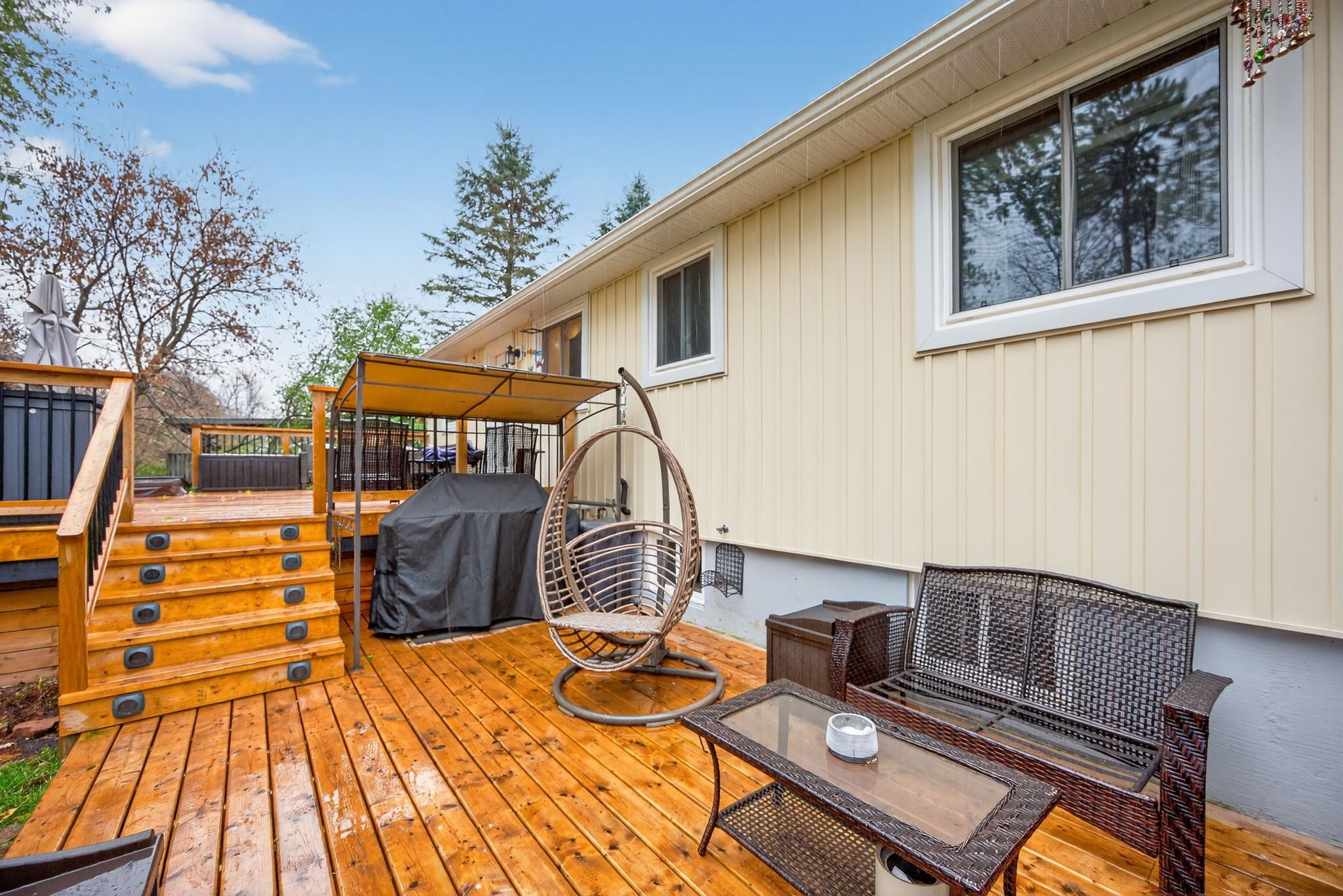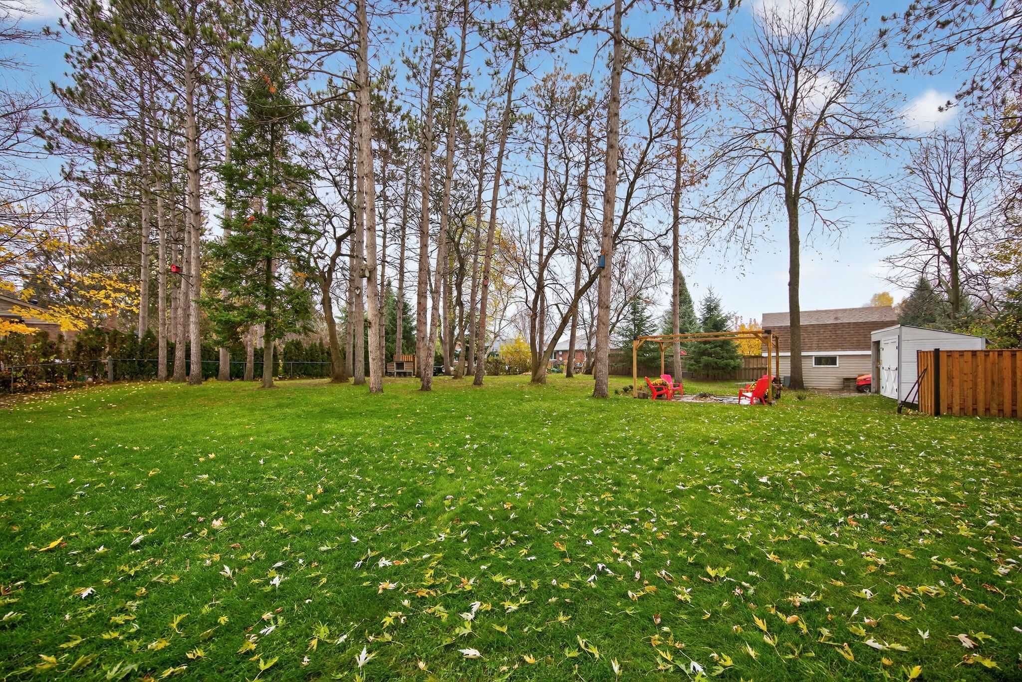 • Private backyard oasis with mature trees for added privacy.