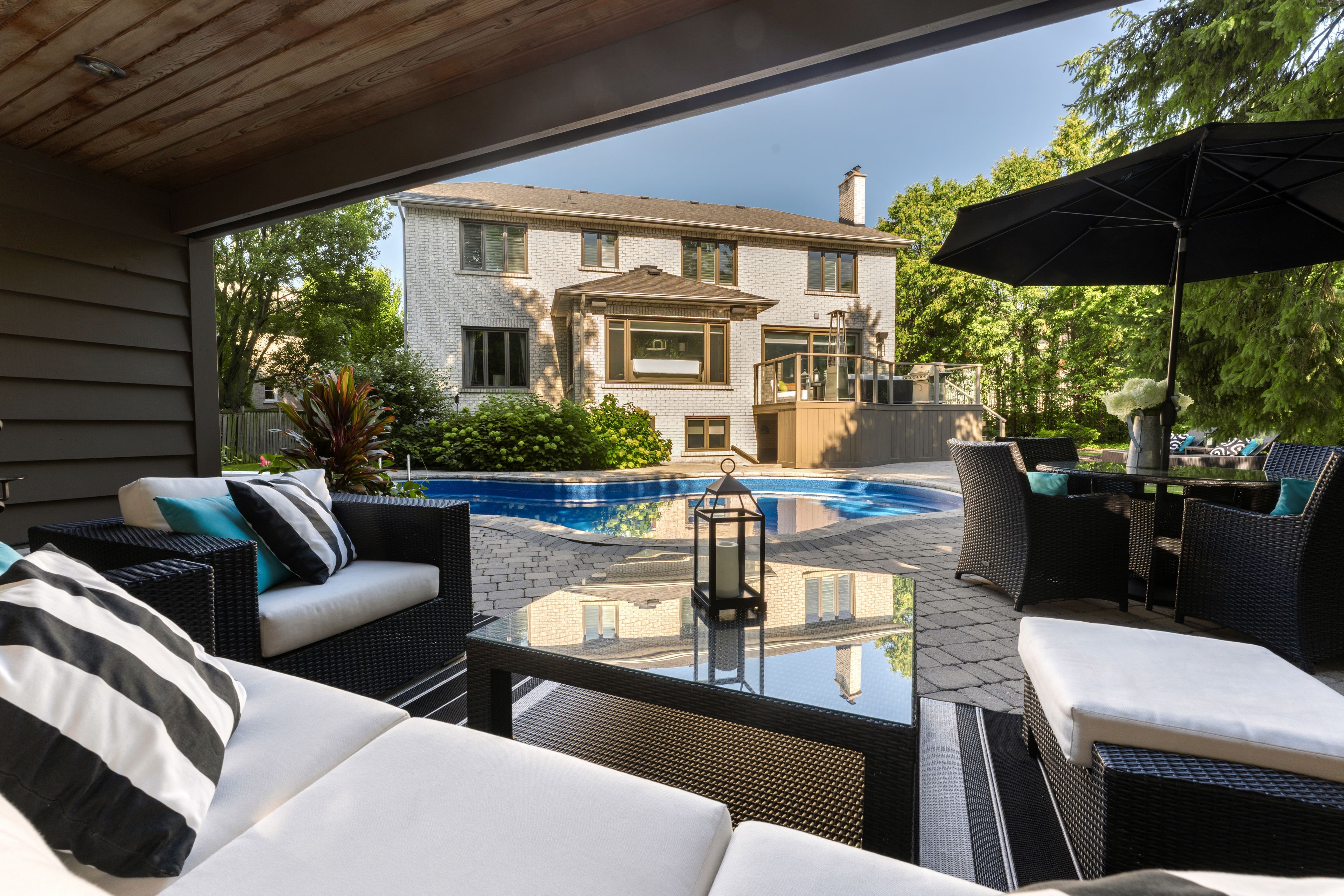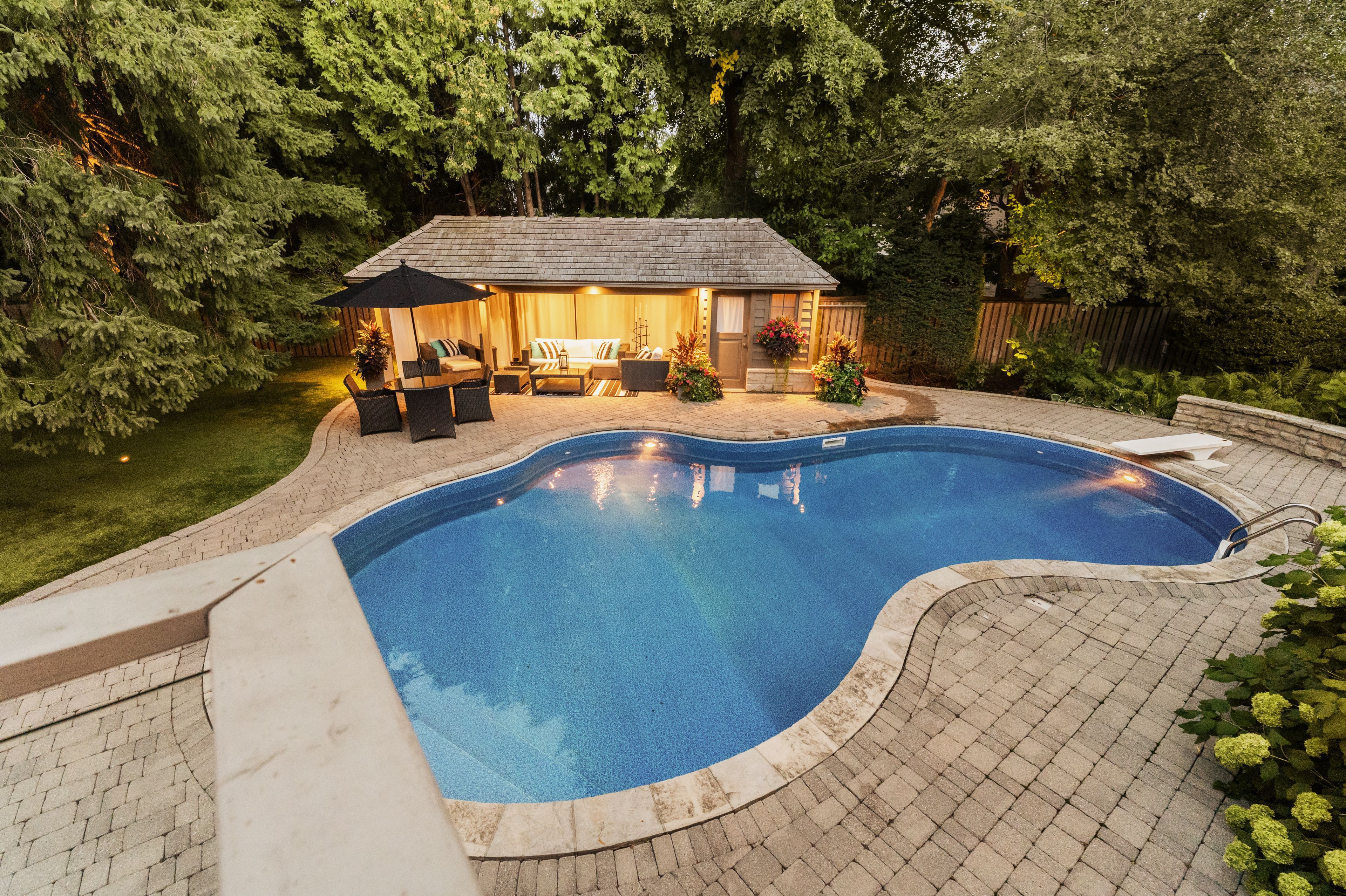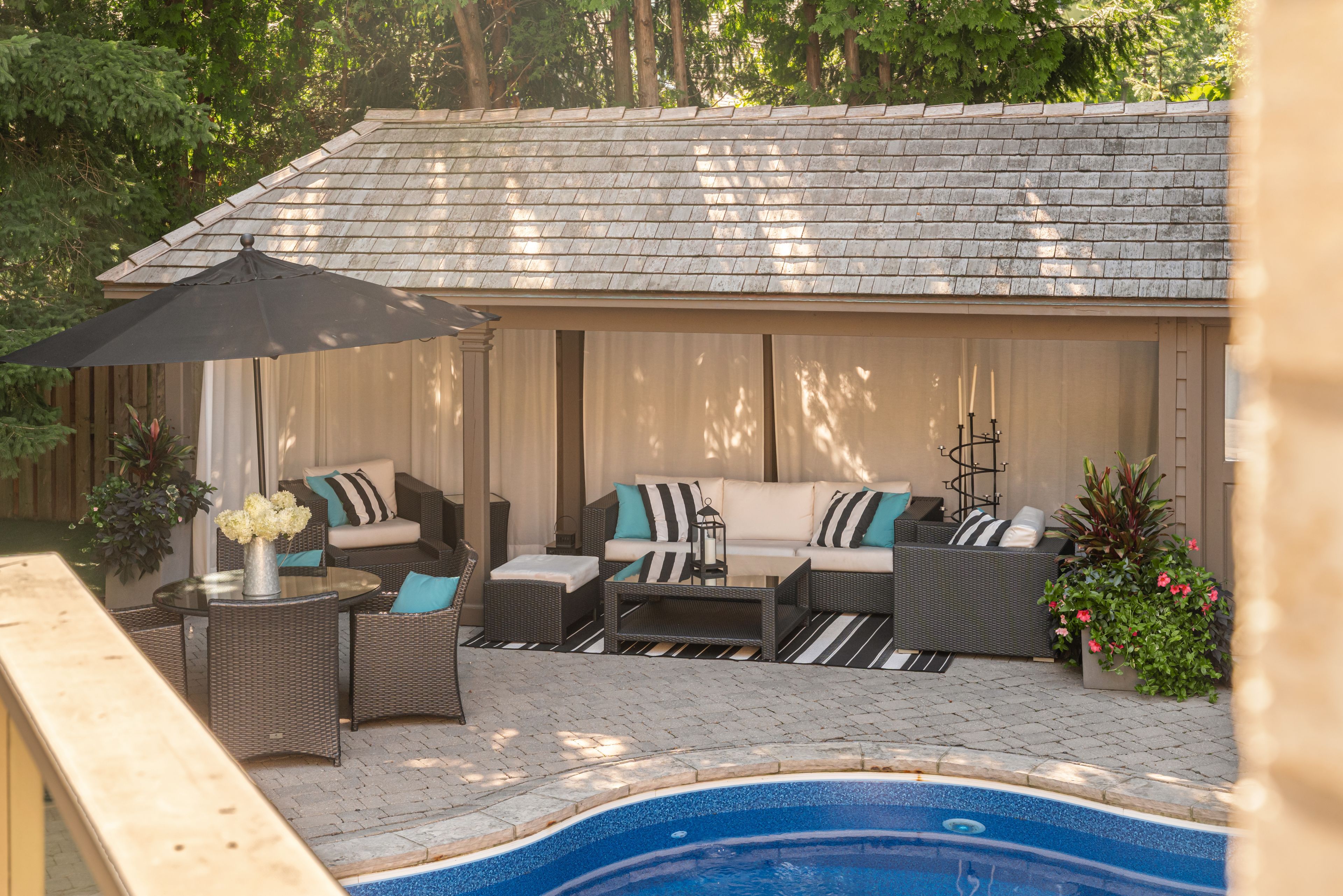 • Private backyard oasis featuring a pool, cabana, and landscaped grounds.