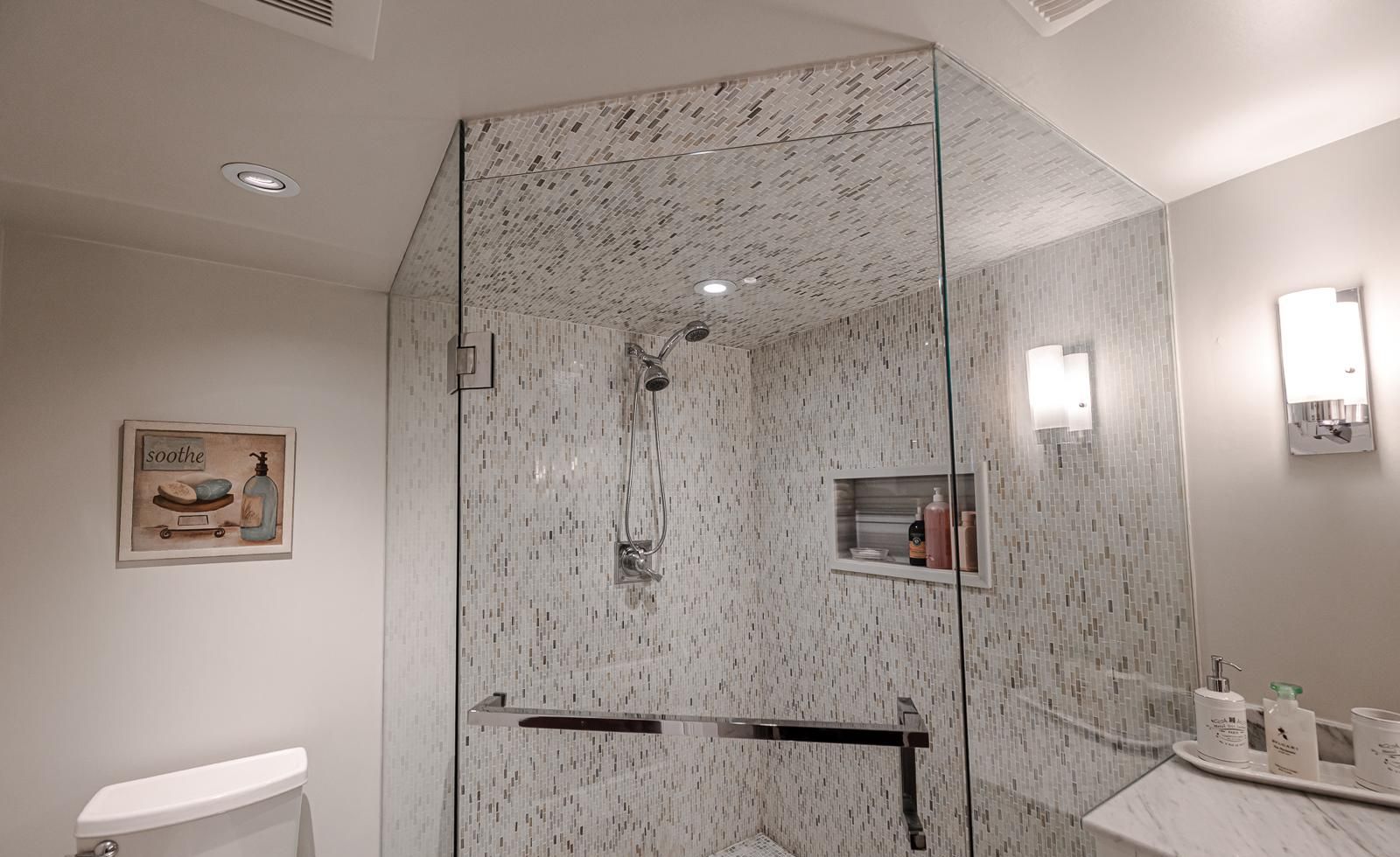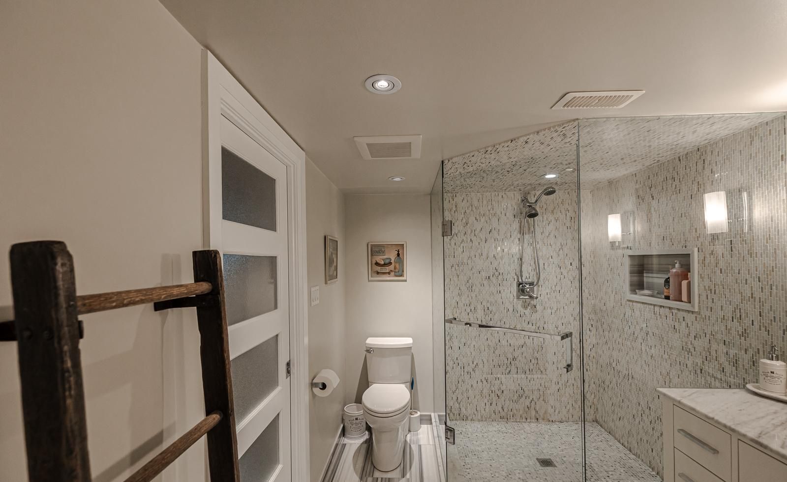 • Lower level features a kitchenette, bedroom, ensuite, and heated floors.