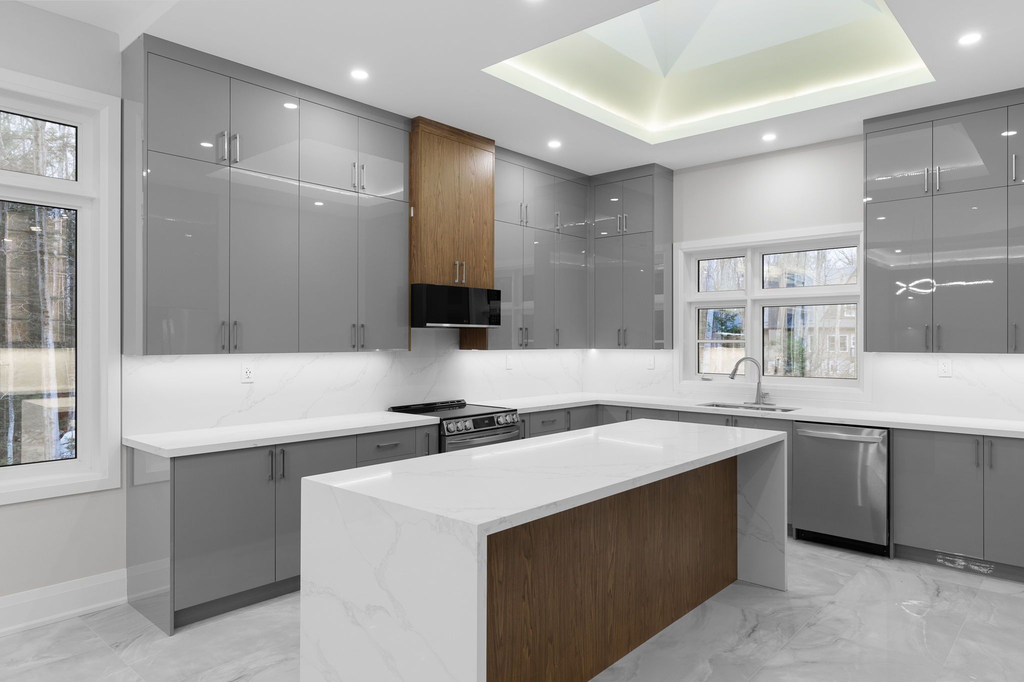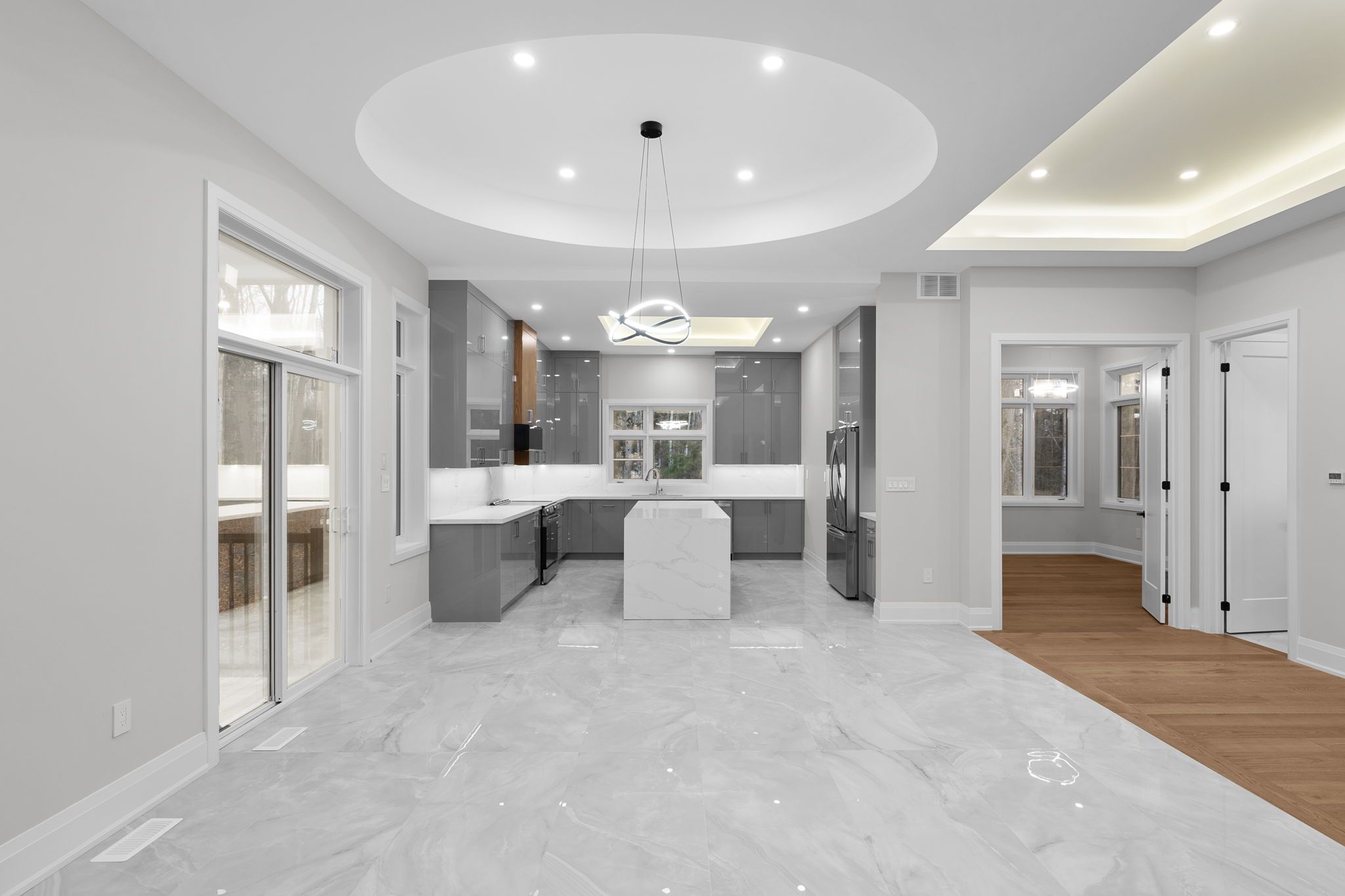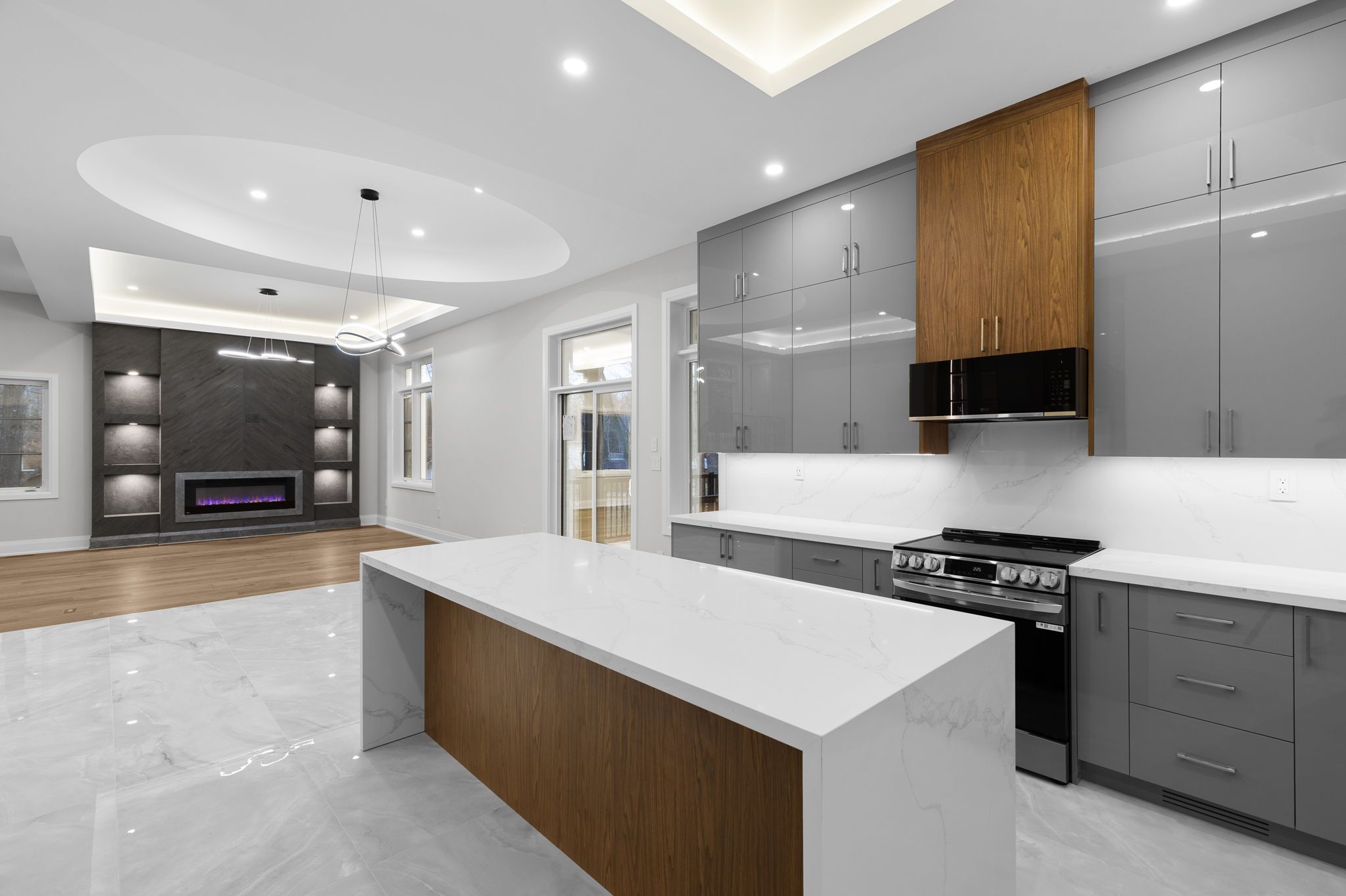 • Open-concept kitchen features a large island and premium appliances.