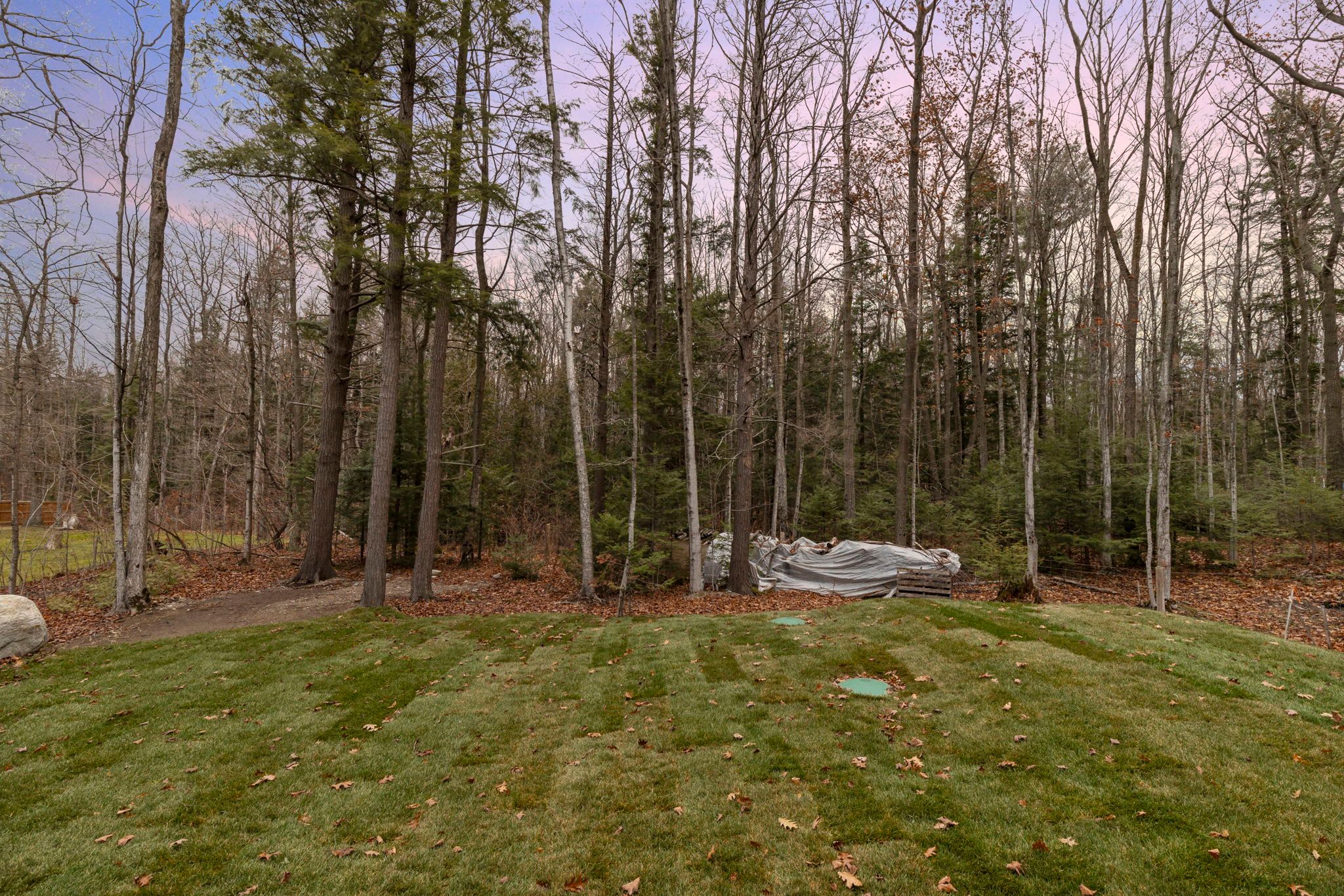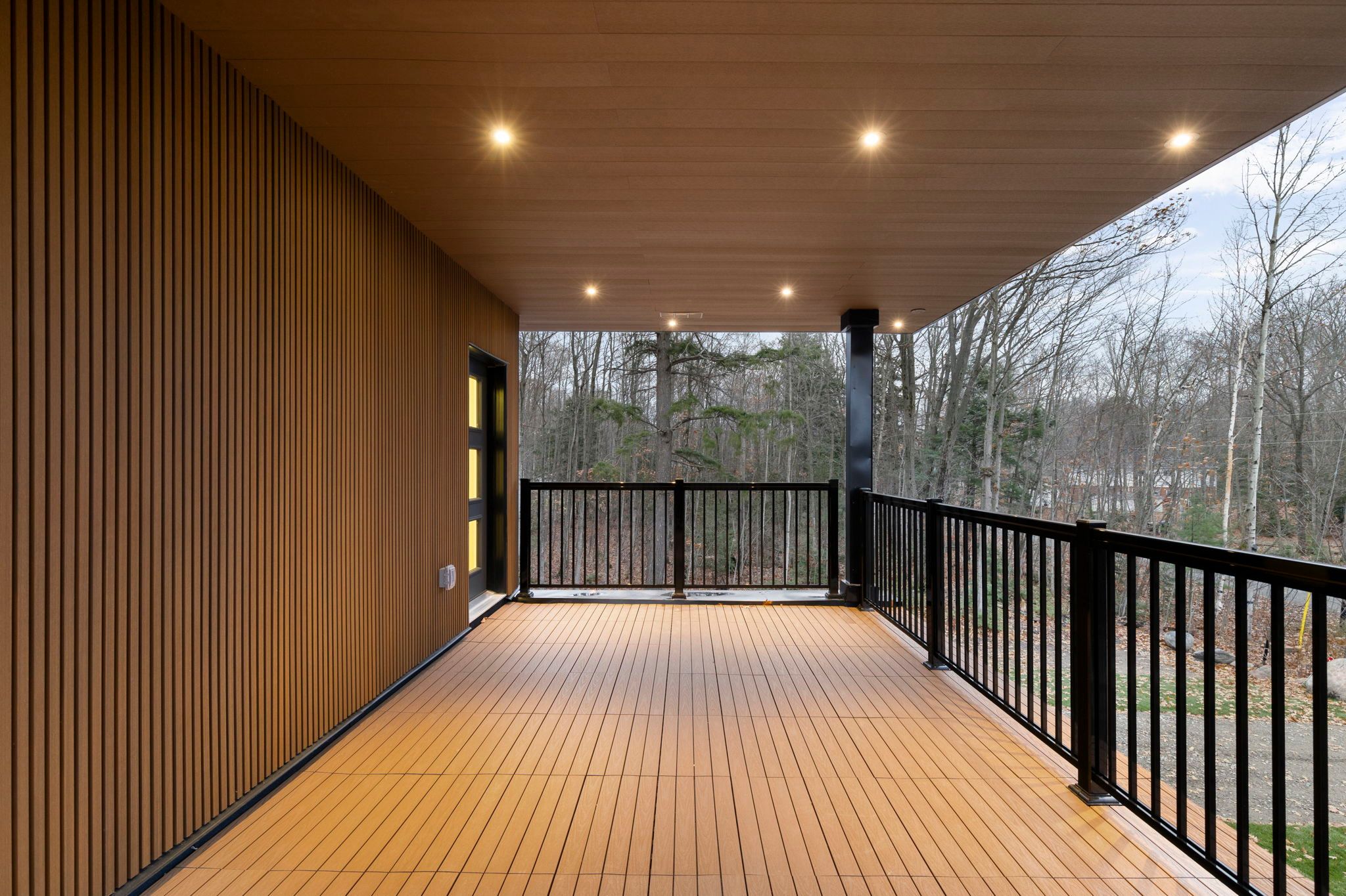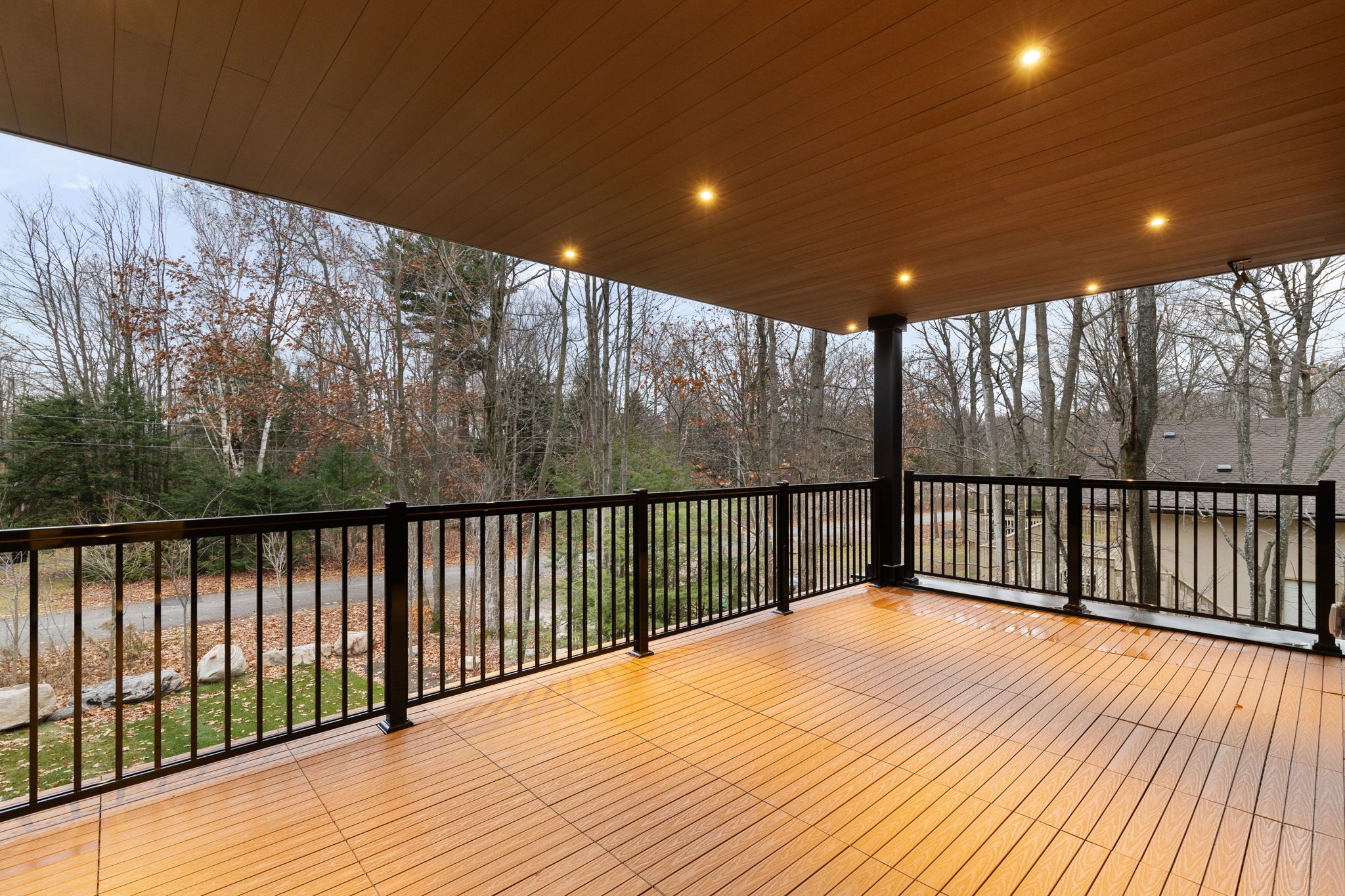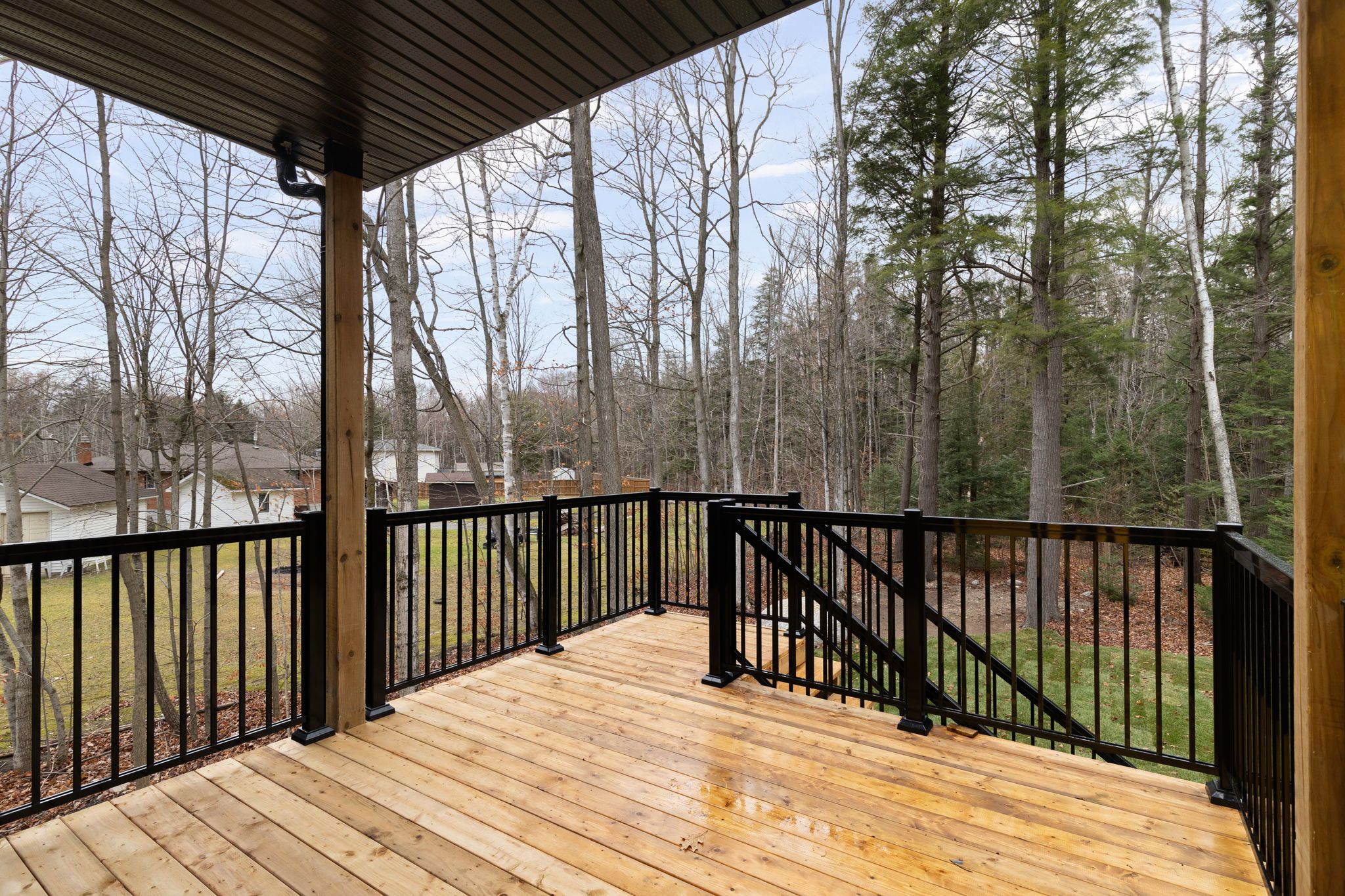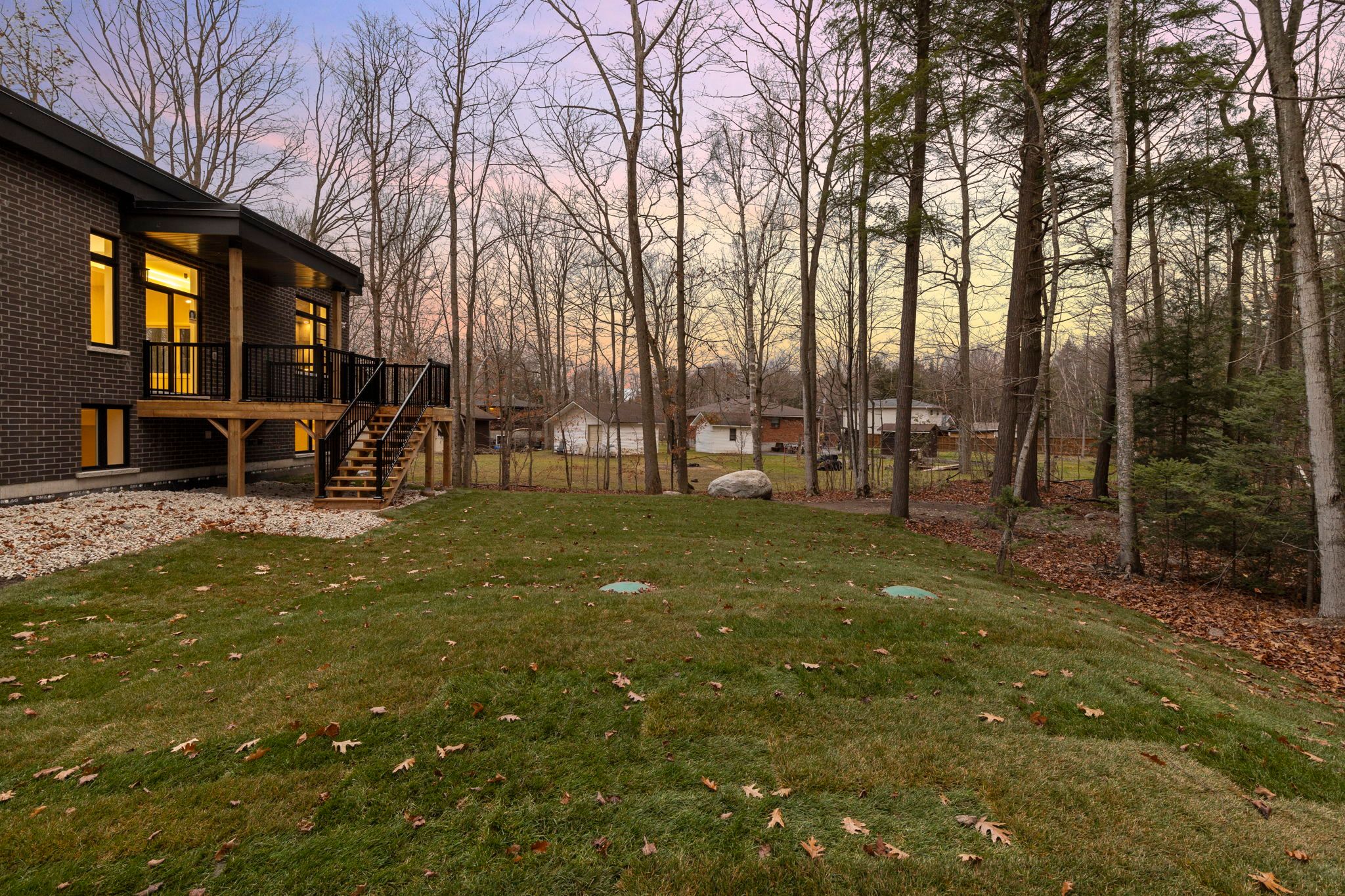 • Beautifully landscaped yard with a covered deck and wooded backdrop.