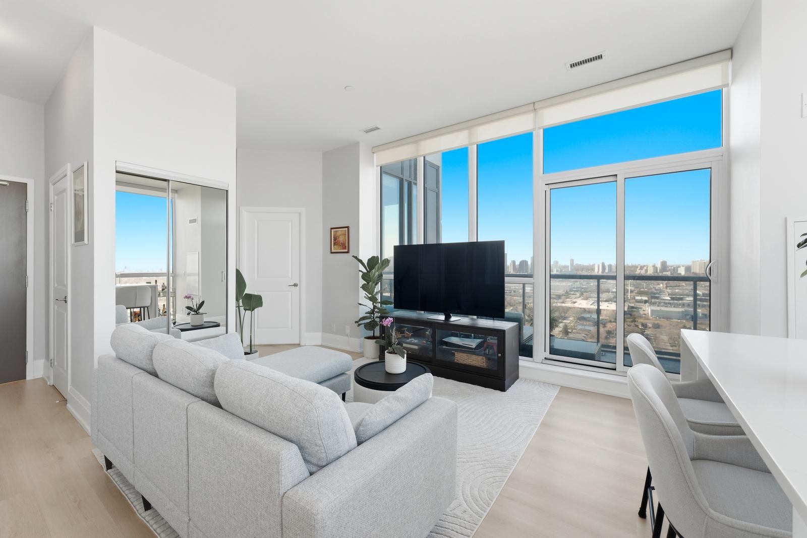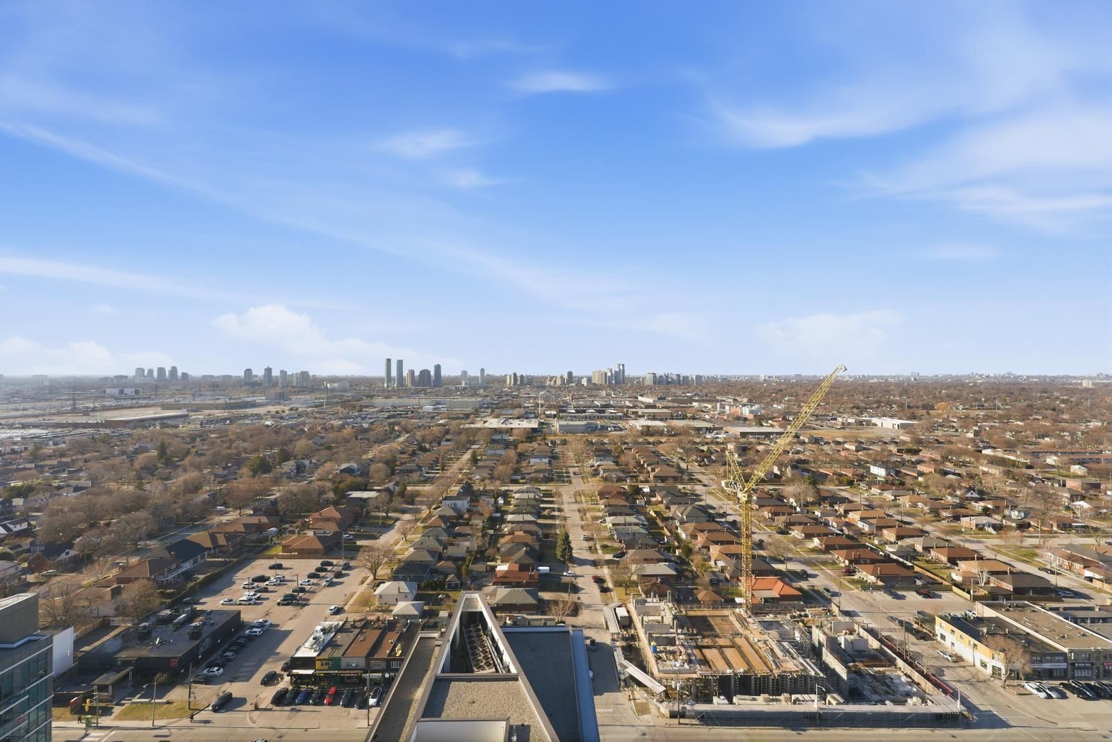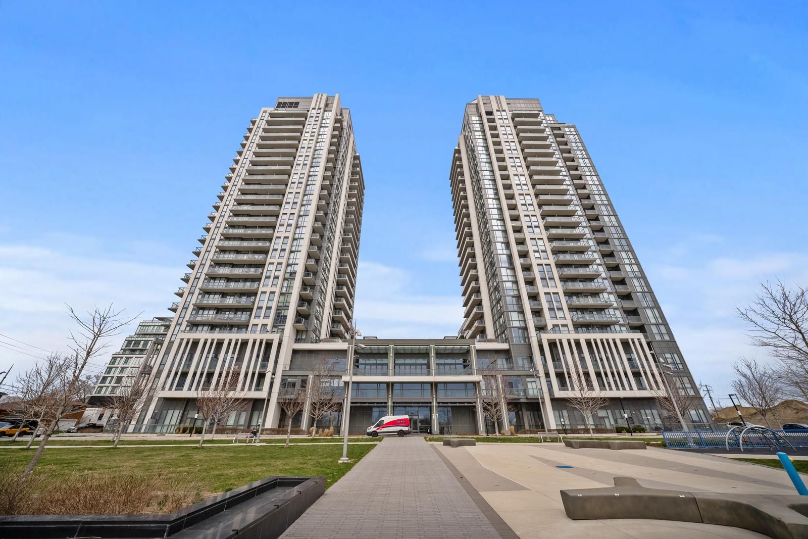 Rarely offered corner penthouse unit. Welcome to modern living at the sought-after iq park towers, designed by the renowned remington group. This exceptional penthouse offers approximately 862 sq ft of thoughtfully designed interior space, complemented by two private balconies with north and east exposures, delivering breathtaking sunsets and panoramic views of the toronto skyline and lake. 862 sq ft interior + 223 sq ft outdoor. Flooded with natural light through expansive floor-to-ceiling windows and enhanced by soaring 10-foot ceilings, this suite offers a bright and airy ambiance throughout. The well-designed split-bedroom layout ensures optimal privacy, featuring 2 bedrooms, 2 full bathrooms, and a versatile den-ideal for a home office or additional living space. Every detail exudes sophistication, with upgraded finishes throughout, making this home perfect for both everyday living and entertaining. Residents of iq park towers enjoy an impressive collection of amenities, including a fitness centre, pool, party room, lounge areas, and games room. One parking space and one locker included. Recent updates & improvements: new flooring (sept 2024); kitchen island (oct 2024); kitchen countertops replaced (oct 2024); fridge (oct 2022); dryer (july 2023).