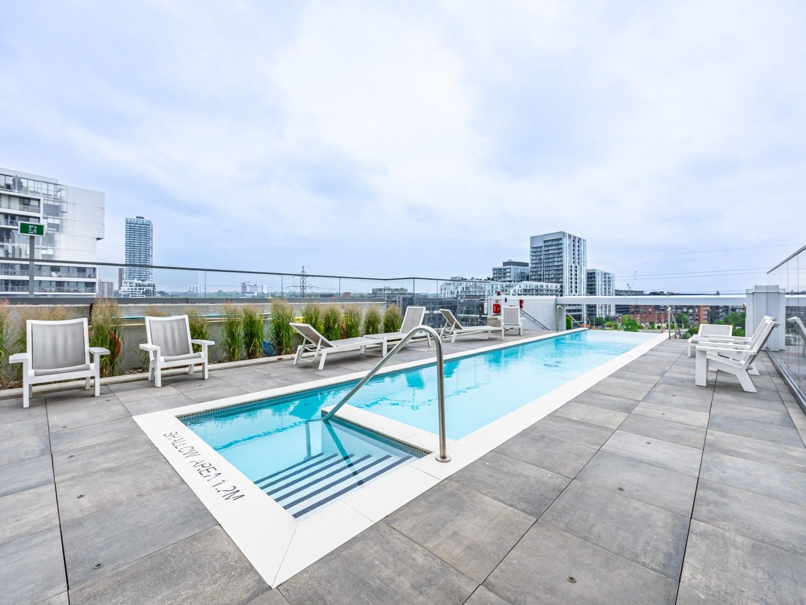 Modern 1-bedroom 1 bathroom suite in l. E. E. D energy saving green building across from corktown common! 556 sq. Ft. Of loft-inspired living featuring 15 ft concrete ceilings, engineered hardwood floors & floor-to-ceiling windows. Open concept kitchen with integrated appliances & ample storage. Spacious bedroom with large closet. 4-piece modern bath. Owned locker included. Premium amenities: 24 hr concierge, gym, yoga studio, outdoor pool, party room & guest suites. Steps to ttc, distillery district, trails & easy access to gardiner.