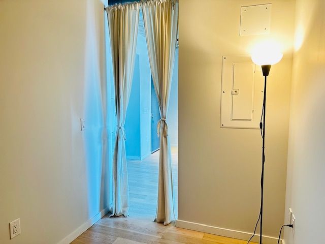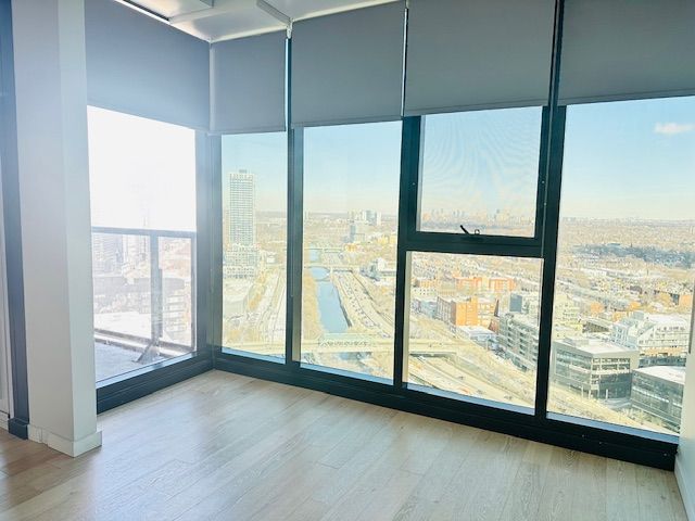 Enjoy 570 sq. Ft. Of modern loft-style living in this beautifully designed suite featuring a combined living and kitchen area with integrated appliances, exposed concrete ceilings, and ductwork for an urban aesthetic. Step out onto your private balcony from the 27th floor and take in unobstructed east-facing views overlooking corktown common park. The spacious bedroom includes a triple-door closet system, while the semi-enclosed den perfect for guests or a home office. Floor-to-ceiling windows fill the living space and bedroom with natural light, complete with roll-down blinds for privacy. The sleek 4-piece bathroom offers generous storage and includes a bidet. Located in a quiet corner of the city, this energy-efficient building features leed gold certification and a green roof deck. Within walking todistance to ttc, restaurants, newly built ymca, shops, distillery district, riverdale. Building amenities: 24 hr concierge, gym, yoga rm, outdoorlap pool, guest suites and party room. *rent control building*