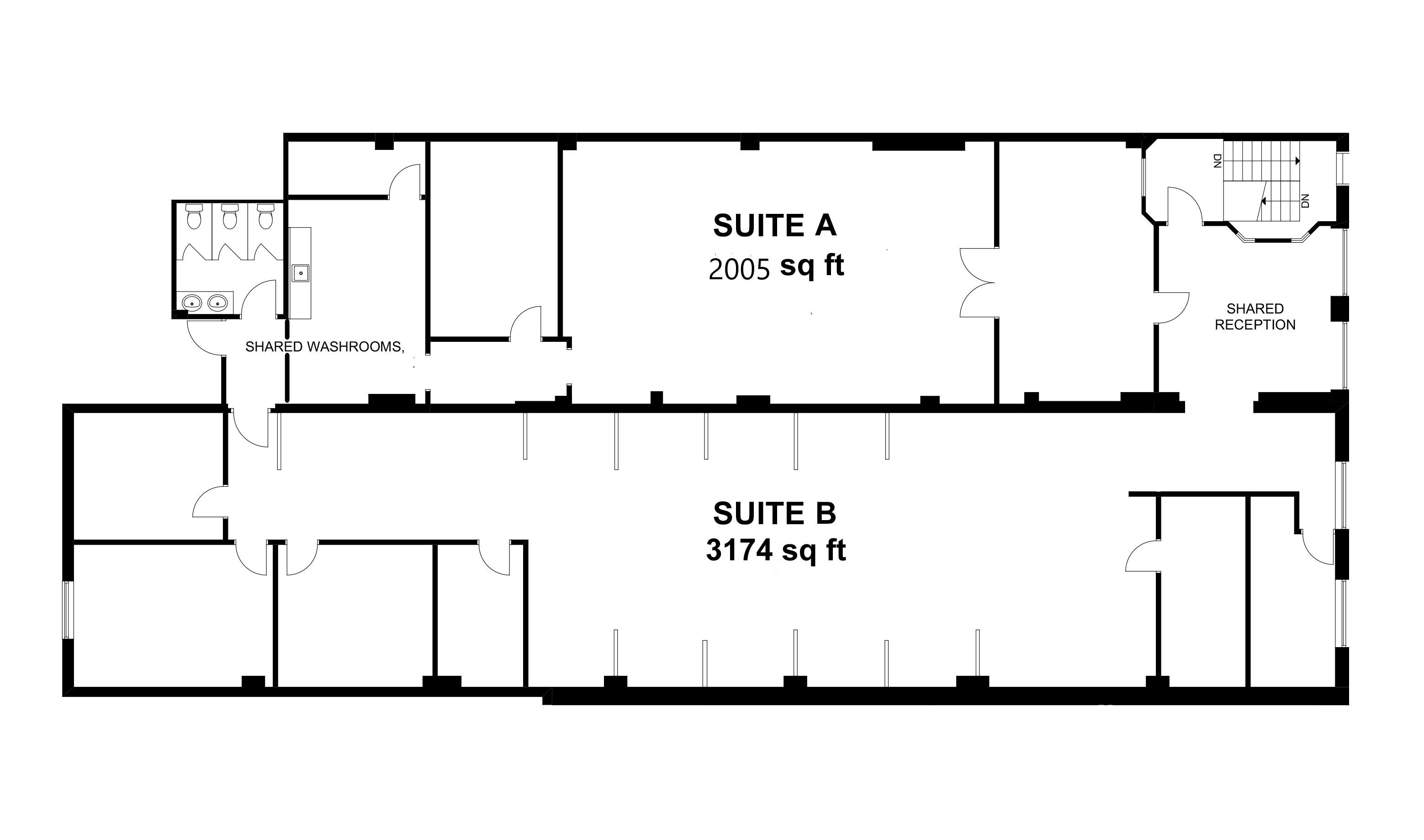 • Includes reception area, kitchenette, boardroom, and open workspace.