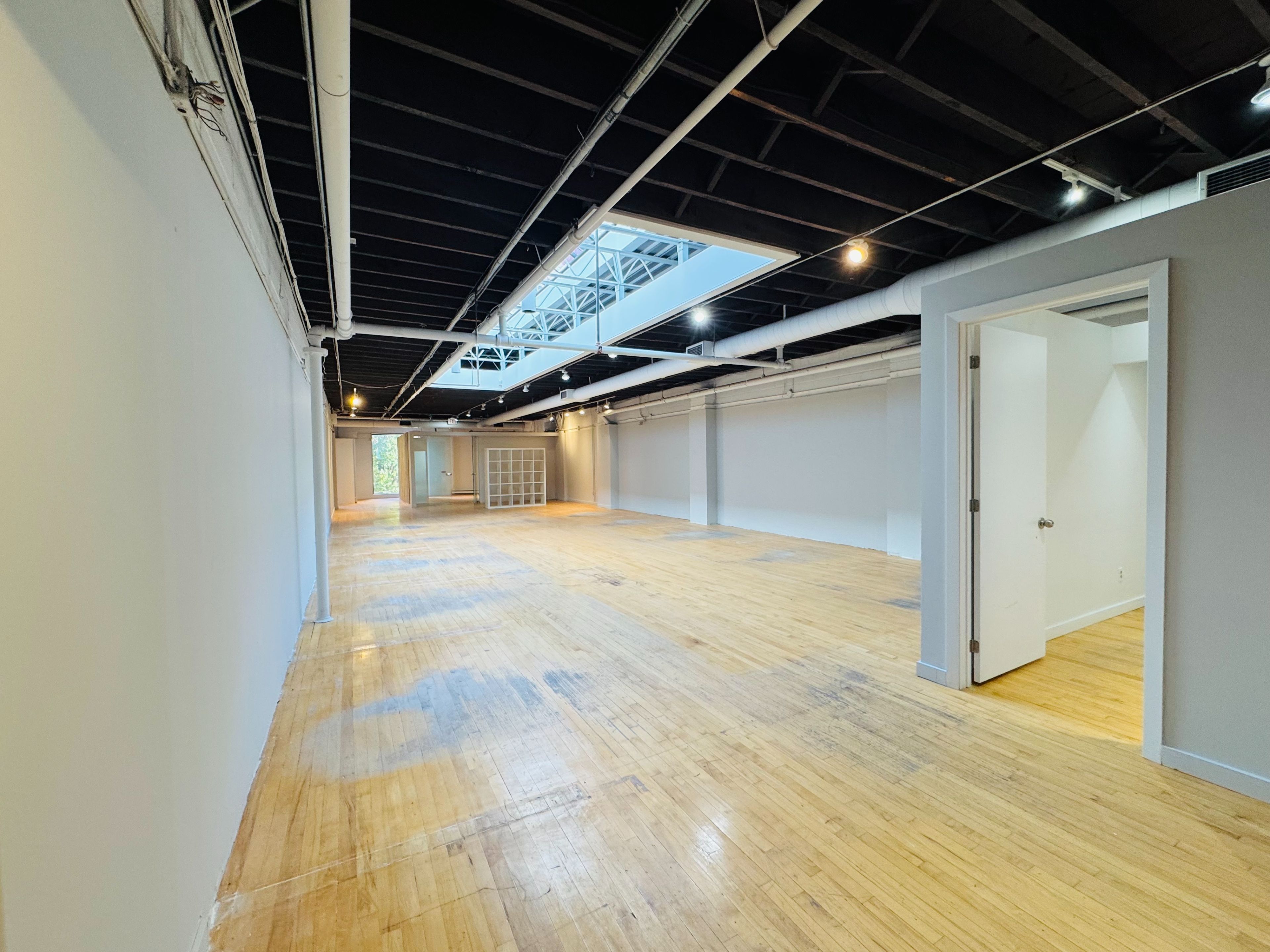 • Bright space featuring soaring ceilings, skylights, and industrial windows.