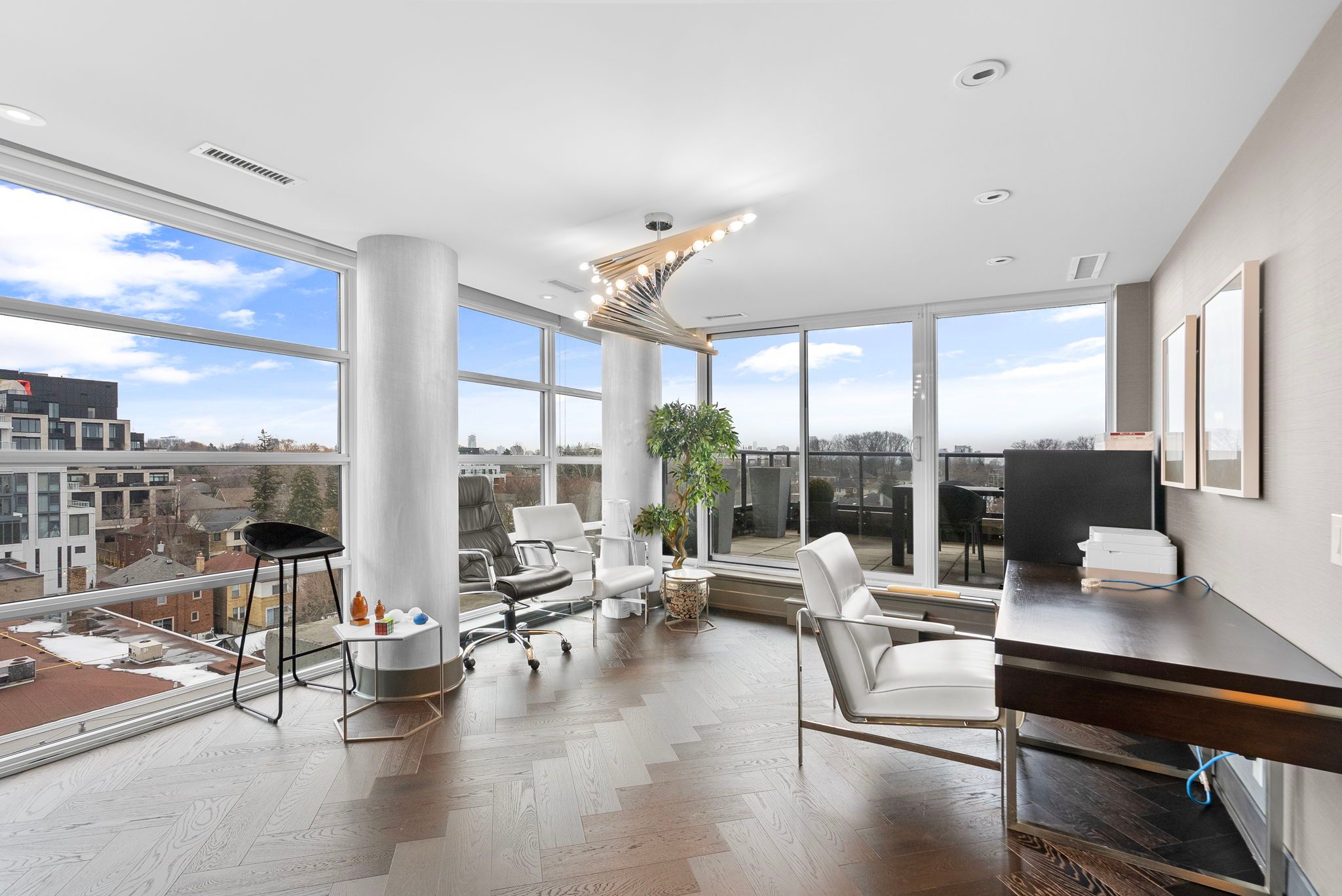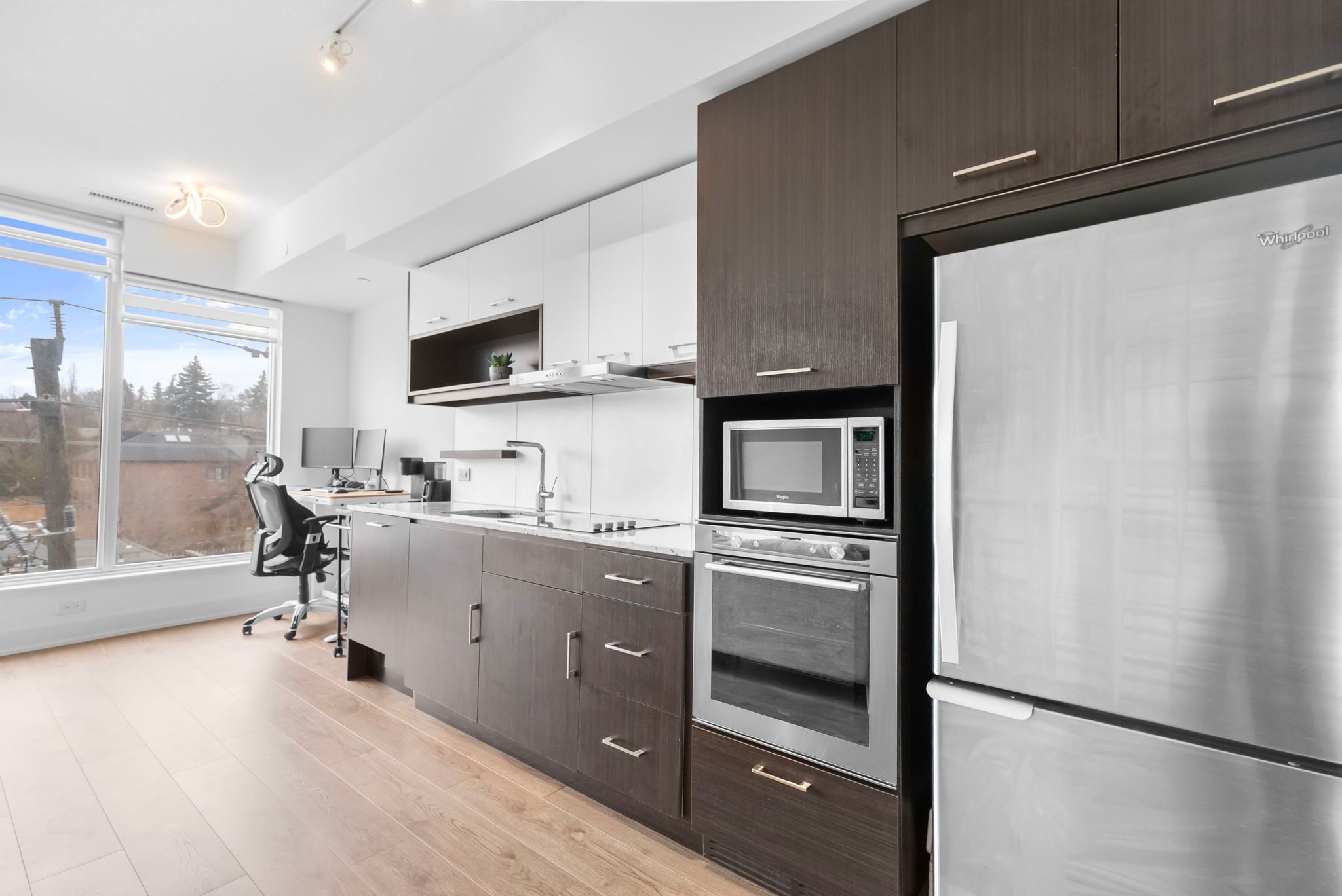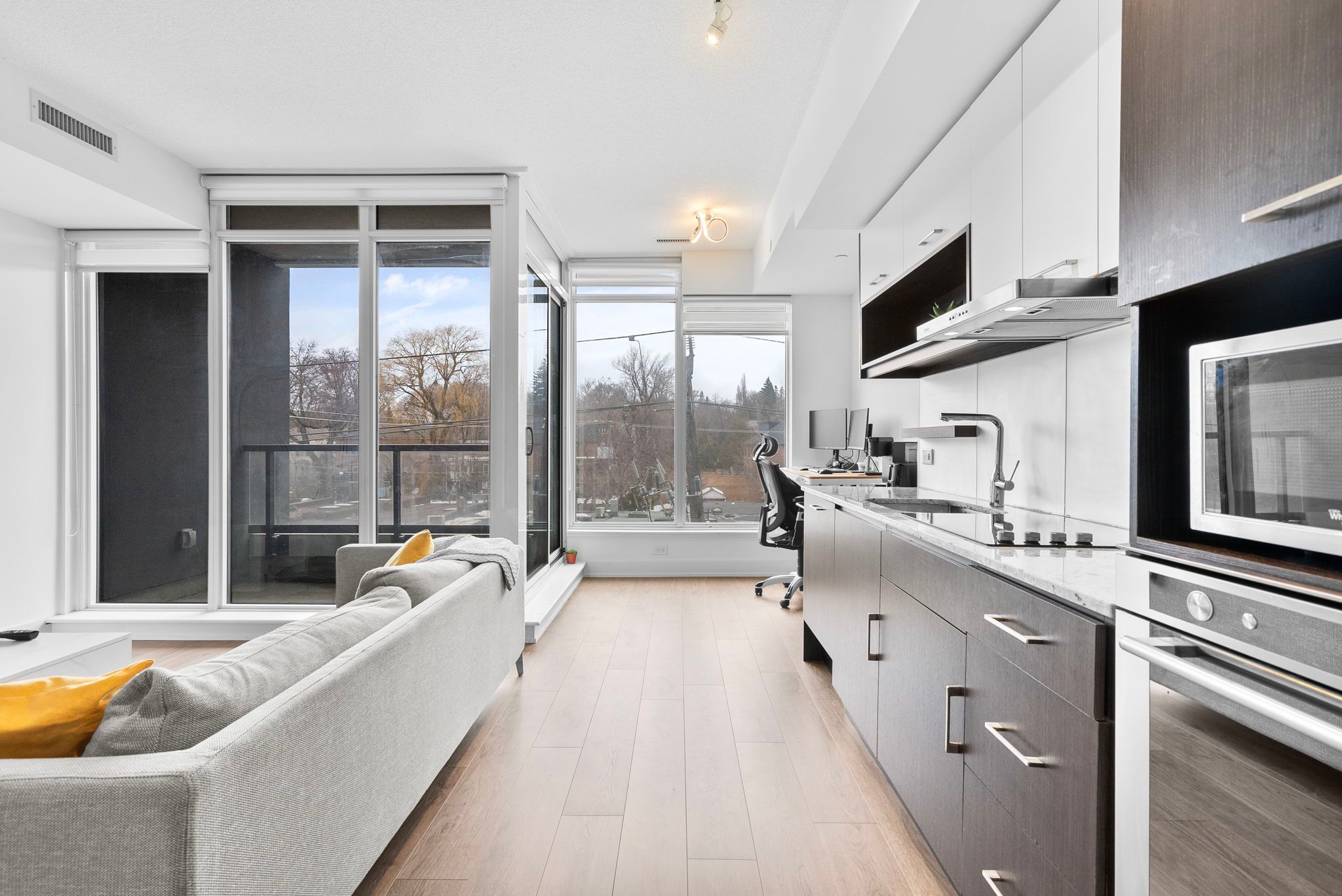 A bright and perfectly situated suite in the heart of forest hill's upper village! This 1-bedroom plus den unit offers a sophisticated open-concept design with floor-to-ceiling windows overlooking a serene backdrop of mature trees. The kitchen features granite countertops, a glass backsplash, and stainless steel appliances, flowing seamlessly into the living area with a private balcony. The primary bedroom is a true highlight, offering a rare walk-in closet and a convenient semi-ensuite. A versatile den serves as the perfect home office or dining area, while the functional layout makes the entire space feel open and inviting. Building residents enjoy amenities, including 24/7 concierge, a gym, guest suite, party room, dining room, billiards room, and a rooftop terrace. The location is unbeatable: steps to the new eglinton crosstown lrt (cedarvale & forest hill stations) and immediate access to allen rd and the 401. Minutes to grocery stores, boutique shopping, cafes, restaurants, and cedarvale park. Modern comfort meets total connectivity, your peaceful retreat in the heart of the city.
