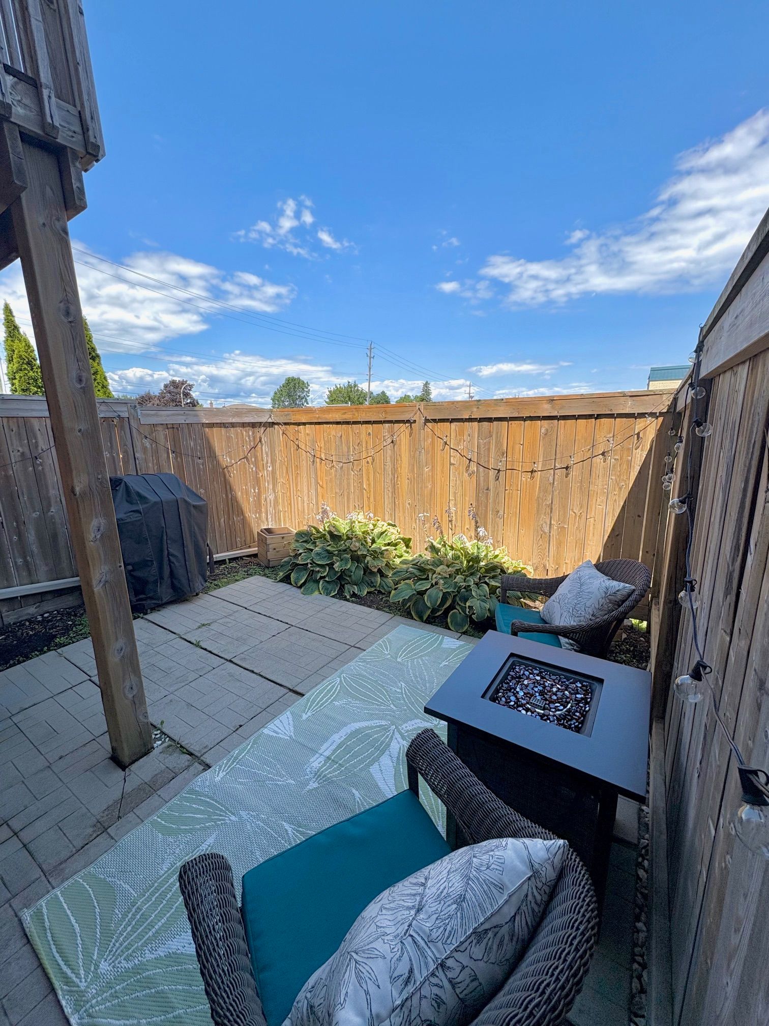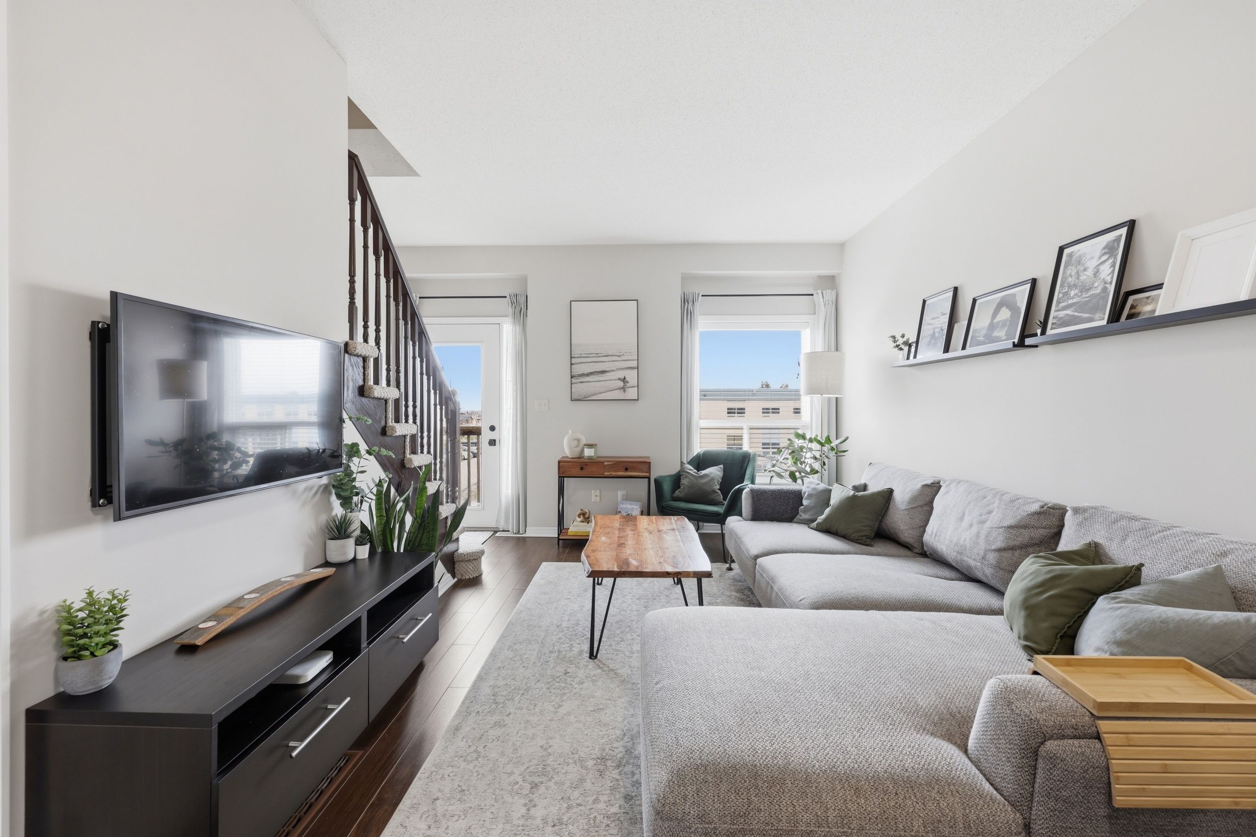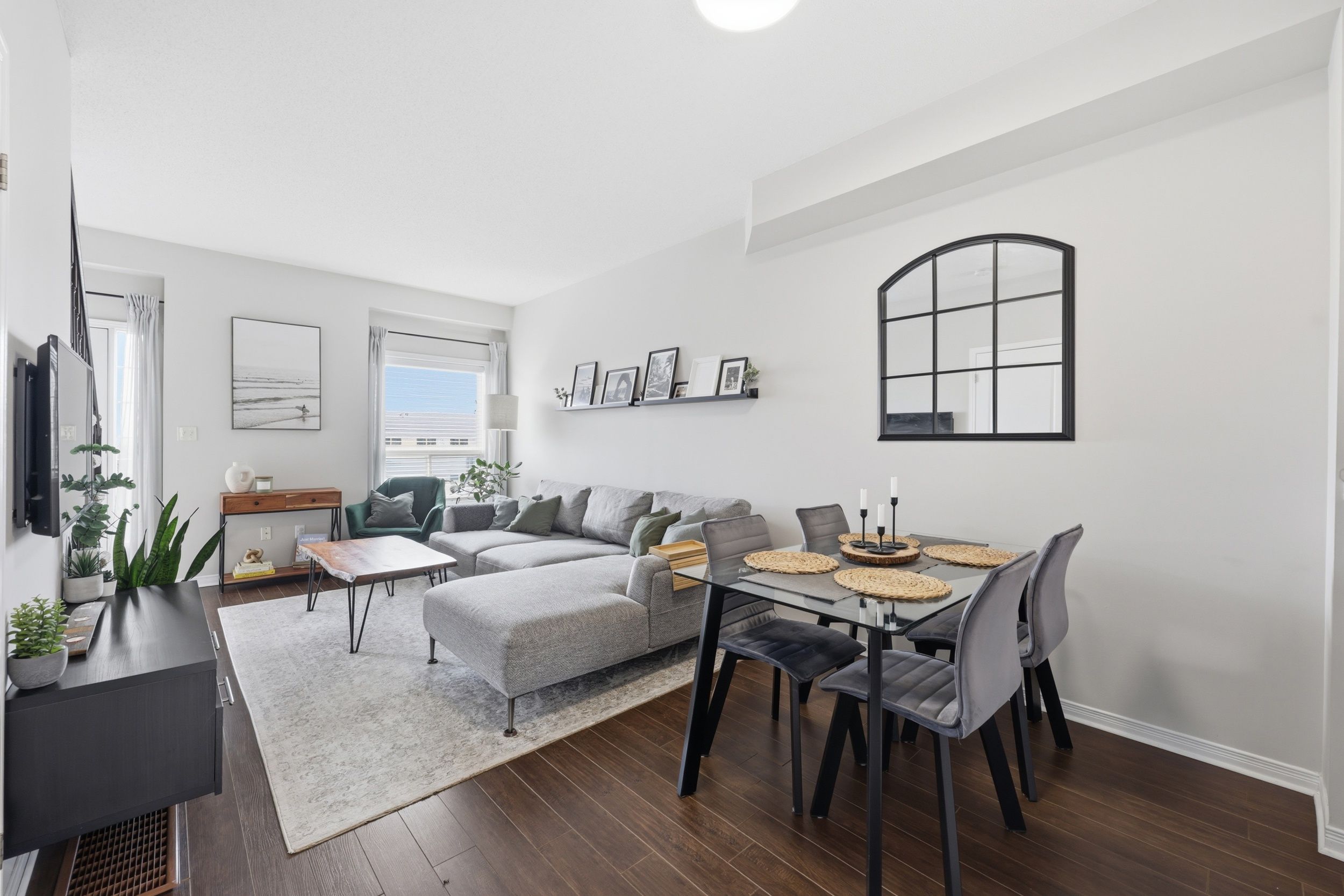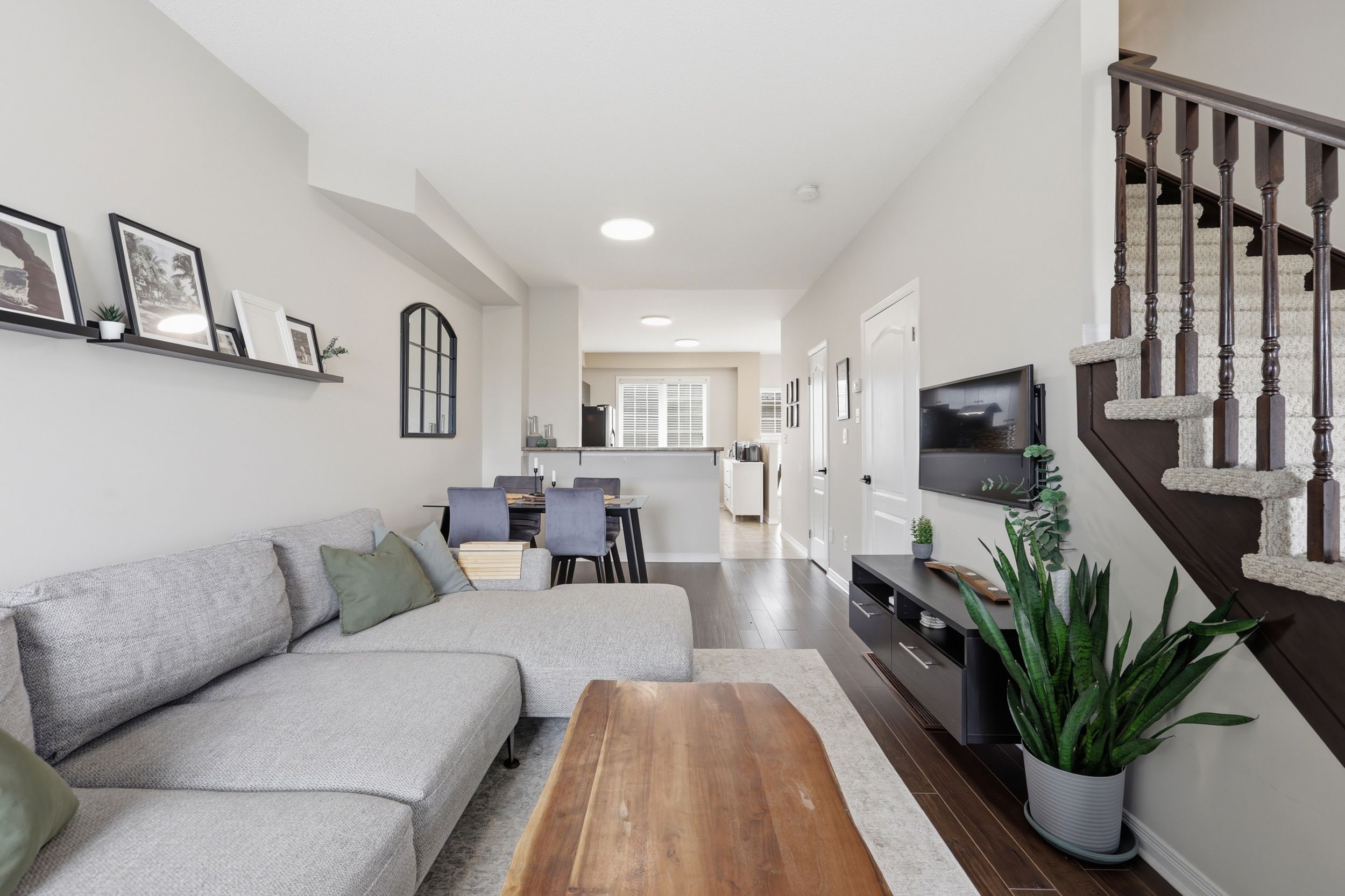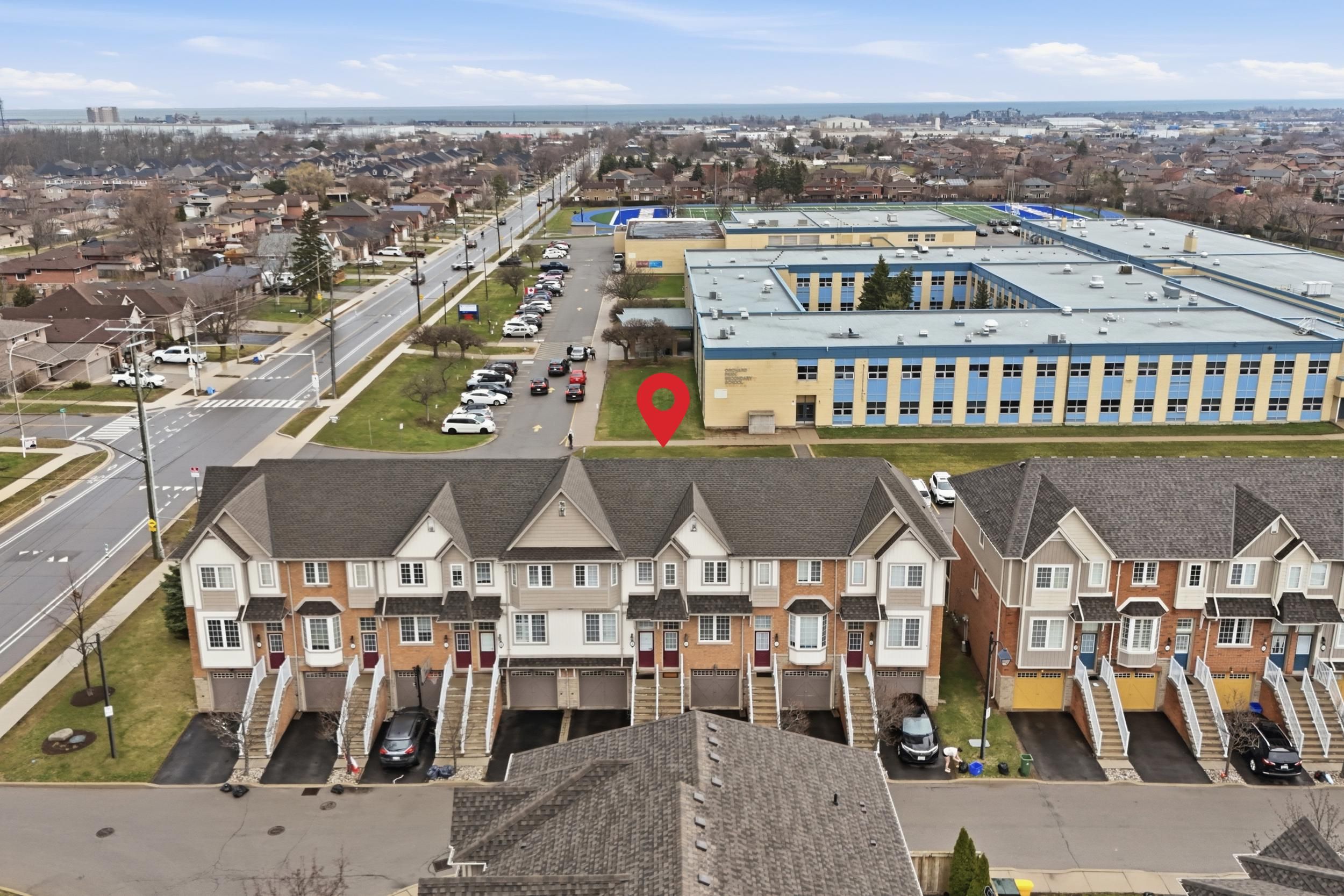 Welcome to this beautifully maintained 3-storey condo townhouse in stoney creek's sought-after east village. A home that offers comfort, function, and easy everyday living. Fully open-concept main floor. Large kitchen with stainless steel appliances & breakfast bar. Living & dining areas featuring laminate flooring in a way that feels both practical and inviting. Large windows bring in plenty of natural light, creating a warm and welcoming space with private balcony access. A recently updated main floor powder room with granite countertops. Upstairs, you'll find generous bedrooms, along with the convenience of a second-floor laundry. The finished lower level provides additional living space with a walk-out to a fully fenced backyard, offering an opportunity for outdoor privacy in condo living. The oversized garage adds valuable space for parking, storage, or both. Ideally located close to shopping, schools, amenities & easy highway access to the qew as well as a 10 minute drive from the new confederation go station (perfect for the commuter). Not to mention close to the lake, nearby conservation areas and trails (for those nature lovers), this is a home that offers both convenience and connection. Move-in ready and easy to enjoy living your life.