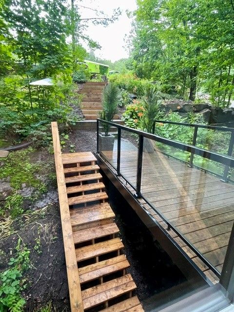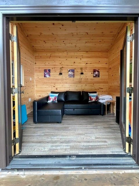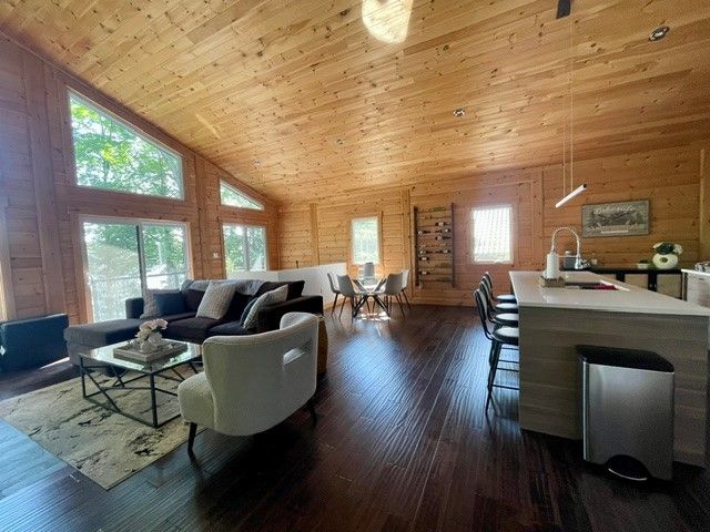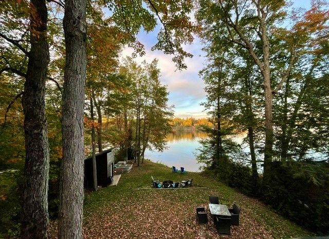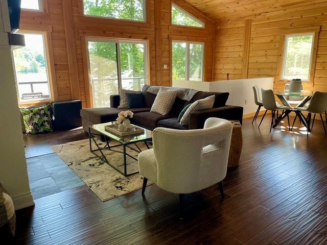 Offering 3+1 bedrooms & 2 bathrooms, the interior is highlighted by a bright, open-concept layout with impressive 22-foot ceilings & expansive windows that frame stunning lake views & fill the space with natural light. The kitchen is thoughtfully designed for both everyday living & entertaining, featuring granite surfaces, stainless steel appliances, & a large island with plenty of seating. A wood-burning fireplace anchors the main living space, creating a warm & inviting atmosphere throughout the seasons. Upstairs, a private composite balcony with glass railings provides a quiet place to unwind & take in the surrounding landscape. The primary bedroom includes a walkout to the rear deck & a rough-in for a future ensuite. Recent updates completed in 2024 add even more value, including a newly finished bathroom on the ground level & a newly installed steel staircase, offering both function & a modern aesthetic. The outdoor setting has been extensively enhanced with professionally designed landscaping by a top-tier firm, creating a polished yet natural environment. Multiple stone patio areas & a fire pit provide ideal spaces for entertaining or relaxing outdoors, all surrounded by mature trees for added privacy. The waterfront is exceptionally user-friendly, with a shallow sandy entry ideal for families, along with a dock-in-a-box system for convenient access to lake muskoka & its vast boating network. A matching bunkie at the water's edge offers additional space for guests or a quiet escape. Located just minutes from muskoka bay resort, as well as the shops, dining, & waterfront attractions of gravenhurst, this property offers both seclusion & convenience-an ideal setting to enjoy everything muskoka has to offer.