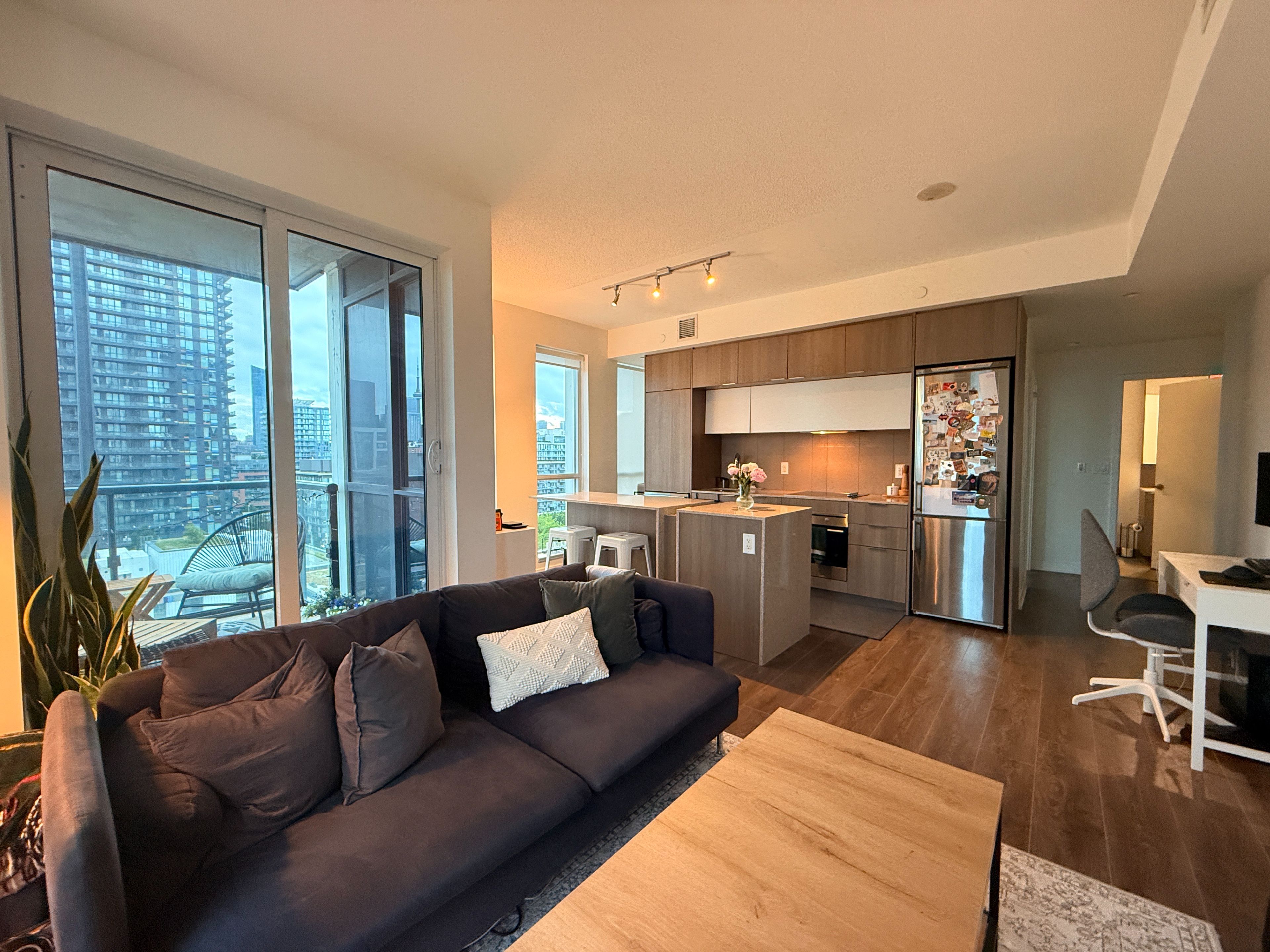 Beautiful sun filled large 1 bedroom corner unit. South west view with large living & dining space. Kitchen with island. 1 parking & 1 locker. 692sqft+59sqft balcony=751sqft. Close to public transit, u of t, ryerson, financial district. Visitor & public parking for your guests! Close to dvp.