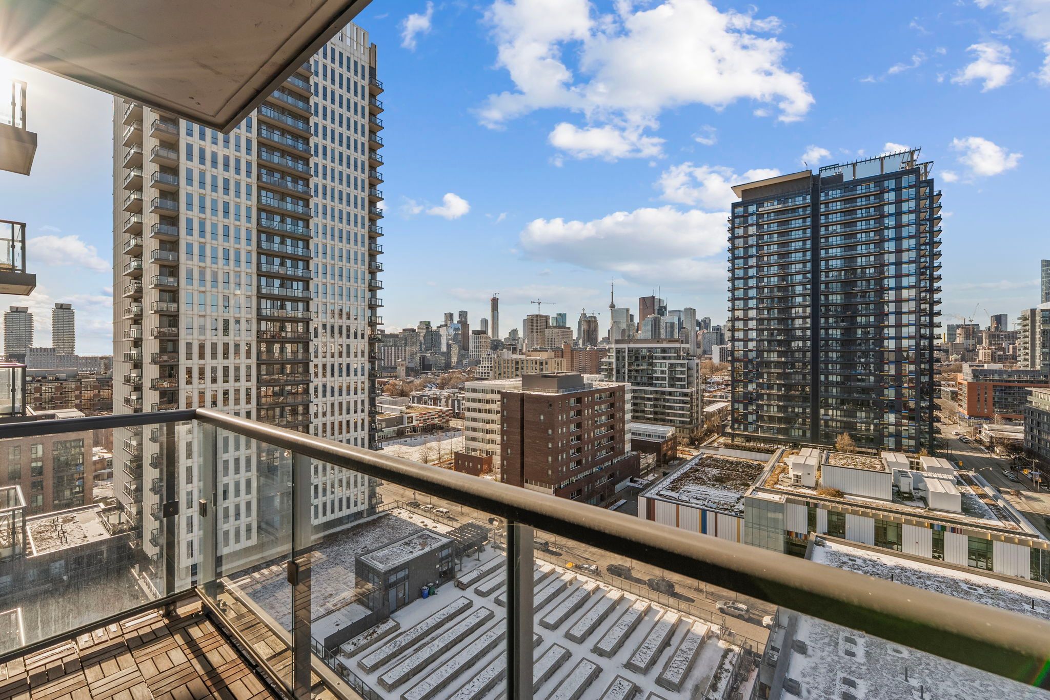 Welcome to this brilliantly bright west-facing residence, where a private balcony frames sweeping, unobstructed city views and unforgettable skyline sunsets. Thoughtfully designed with a functional split two-bedroom, two-bath layout, both bedrooms comfortably accommodate queen-size beds and feature generous closets. The open-concept living space is anchored by a modern kitchen with an eat-in island, flowing seamlessly into a spacious living and dining area ideal for everyday living and entertaining. Step outside and immerse yourself in one of toronto's most dynamic neighbourhoods. Enjoy immediate access to world-class recreational amenities, vibrant dining and café scenes, weekend market strolls, scenic parks, and effortless connectivity across the city. With transit at your doorstep, quick highway access, and nearby trail systems, commuting and exploring are equally convenient. The building offers an impressive suite of amenities including a fully equipped gym, basketball and squash courts, yoga room, steam room, visitor parking, and more. One parking space and one locker are included. An exceptional opportunity for end-users and investors alike, offering lifestyle, location, and long-term value.