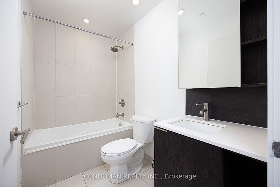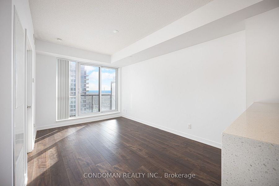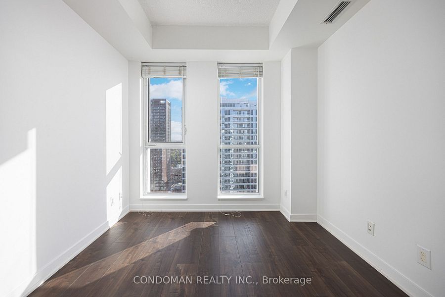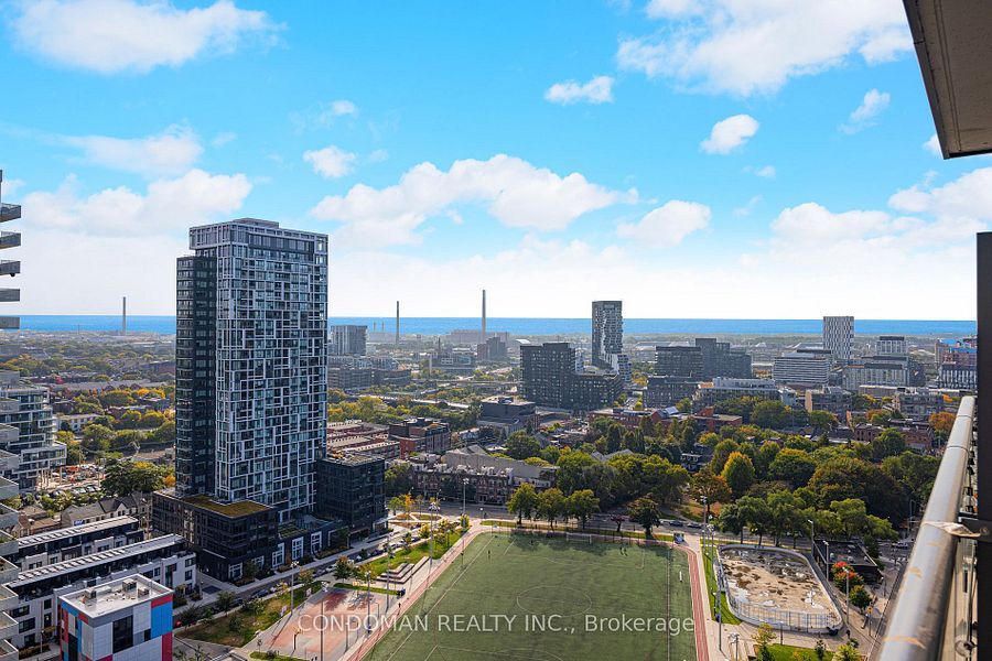 Beautiful, open view from the 23rd floor & perfect rectangular layout! Enjoy gorgeous open city view from your large balcony. Sleek, dark finishes including built in high-tech appliances, wide-plank cocoa flooring& waterfall quartz island!! Ideal layout w living&dining area, window in bedroom & fits queen, balcony fits table/chairs. Includes one parking & locker. Shows like a model suite in the sky! Amenities include: half-court basketball, gym, squash courts, fitness ctr, steam room, party room, rooftop terrace. Close to the eaton centre, ryerson, ttc, highways, athletic grounds, aquatic centre & all that downtown has to offer.
