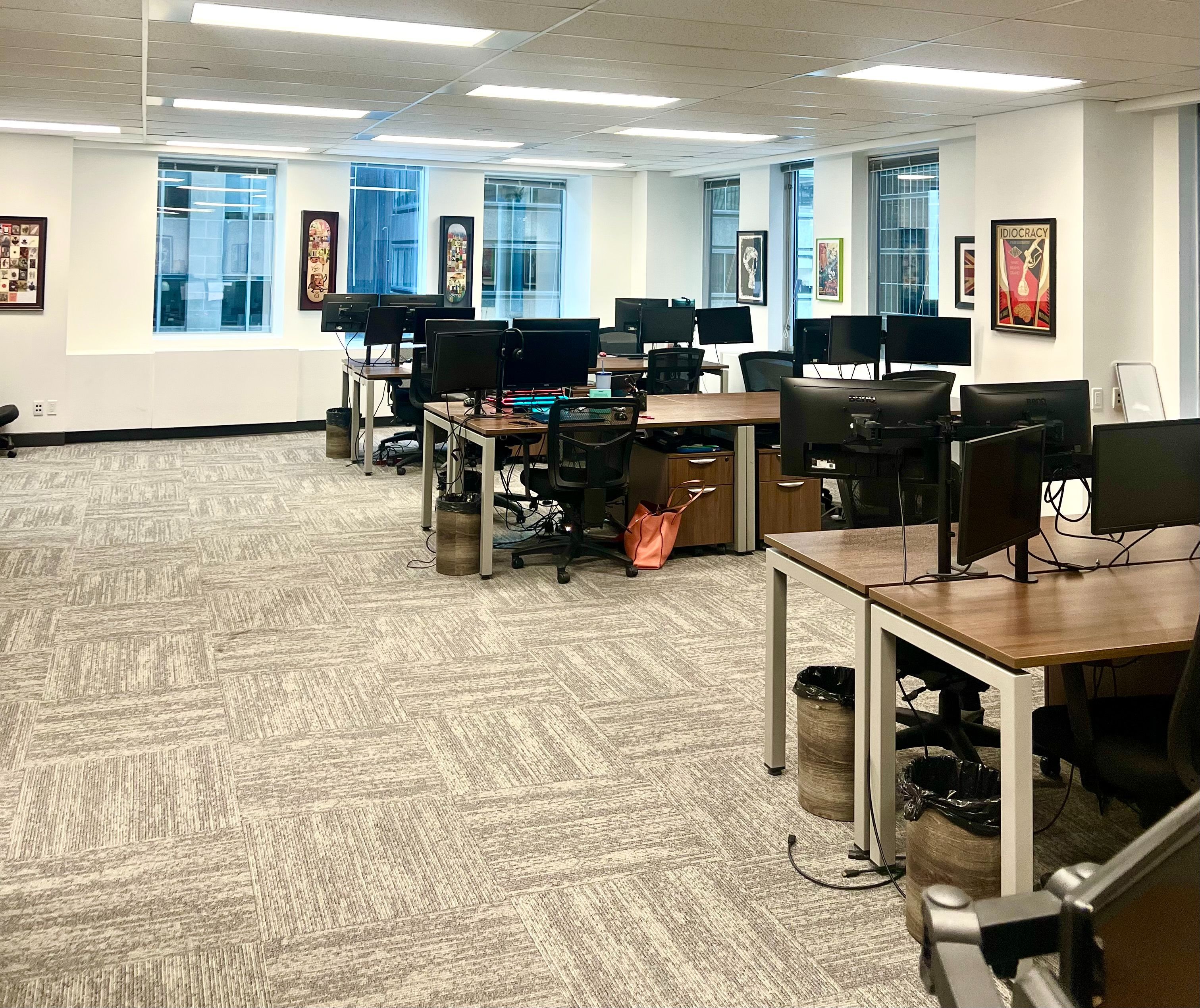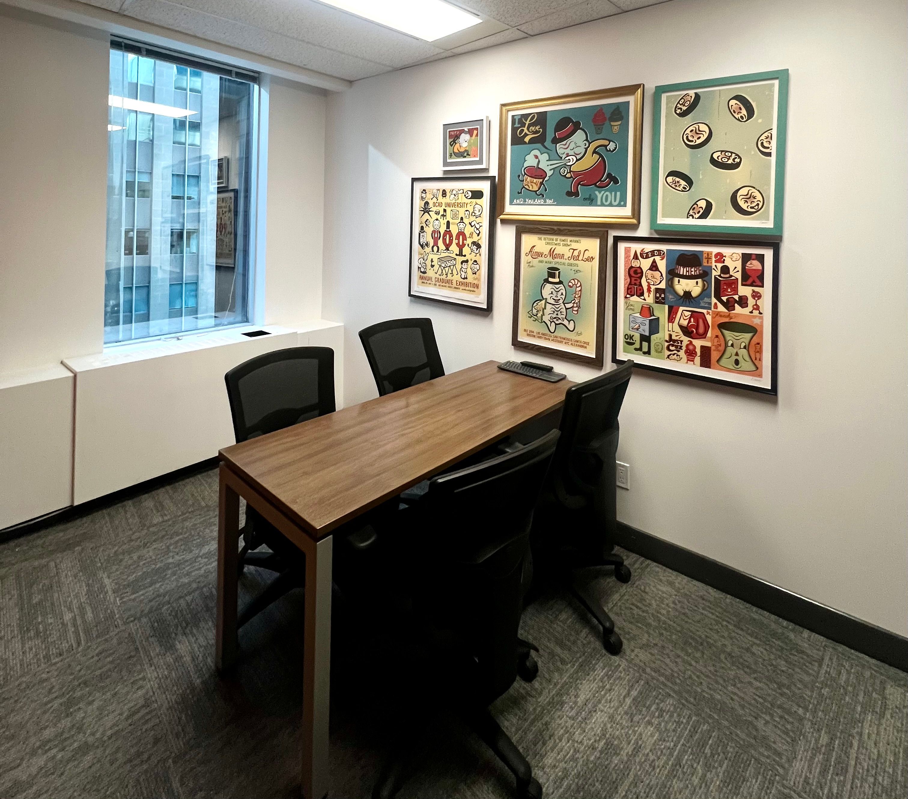 • Open-concept work area with two breakout rooms and a private boardroom.