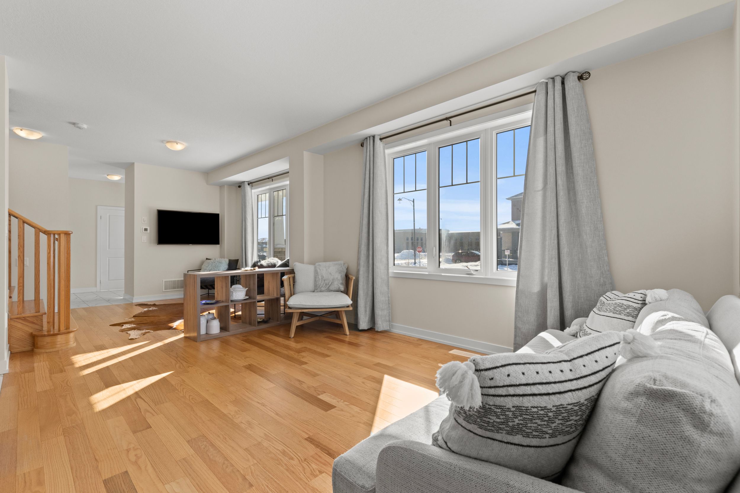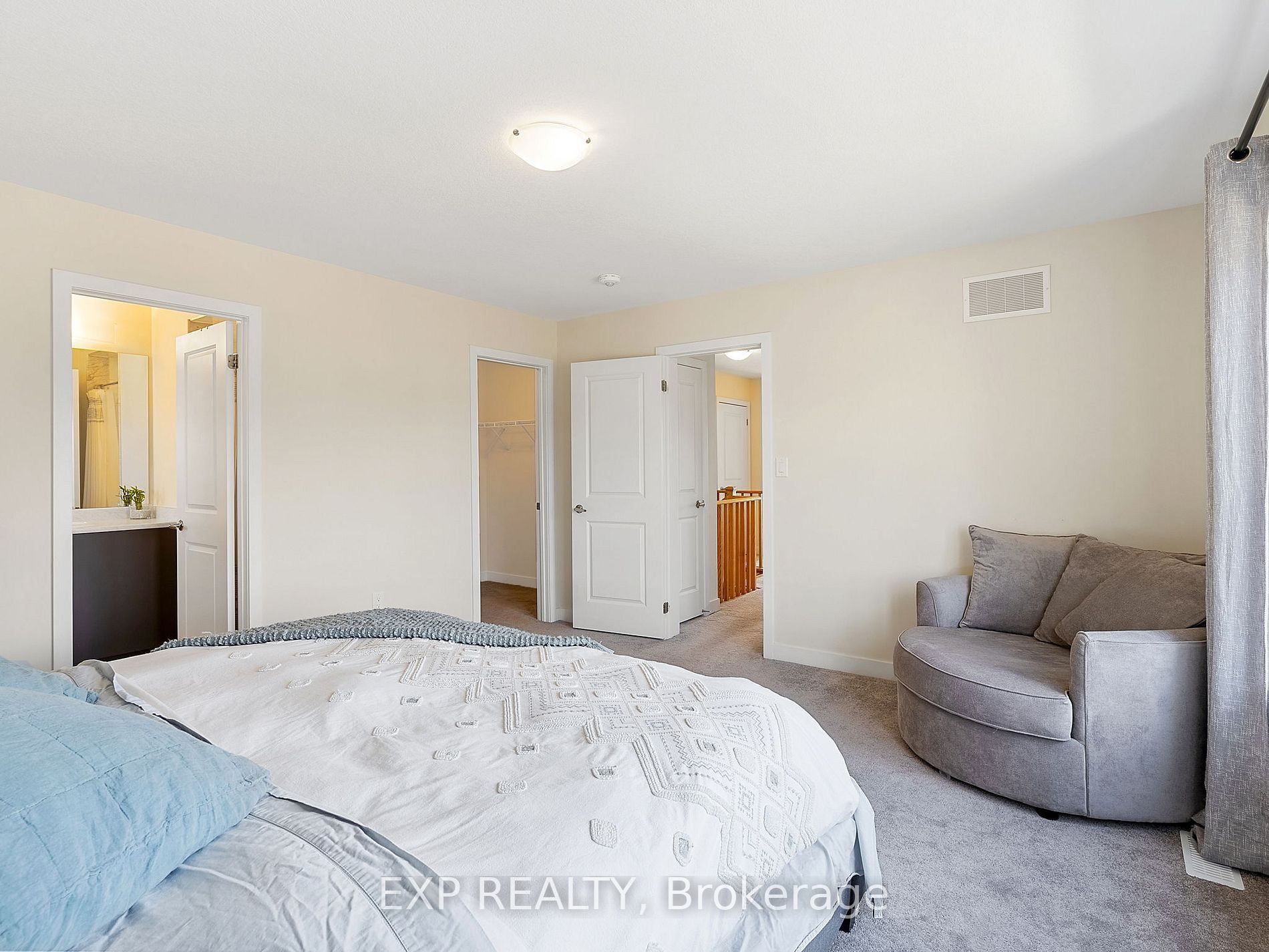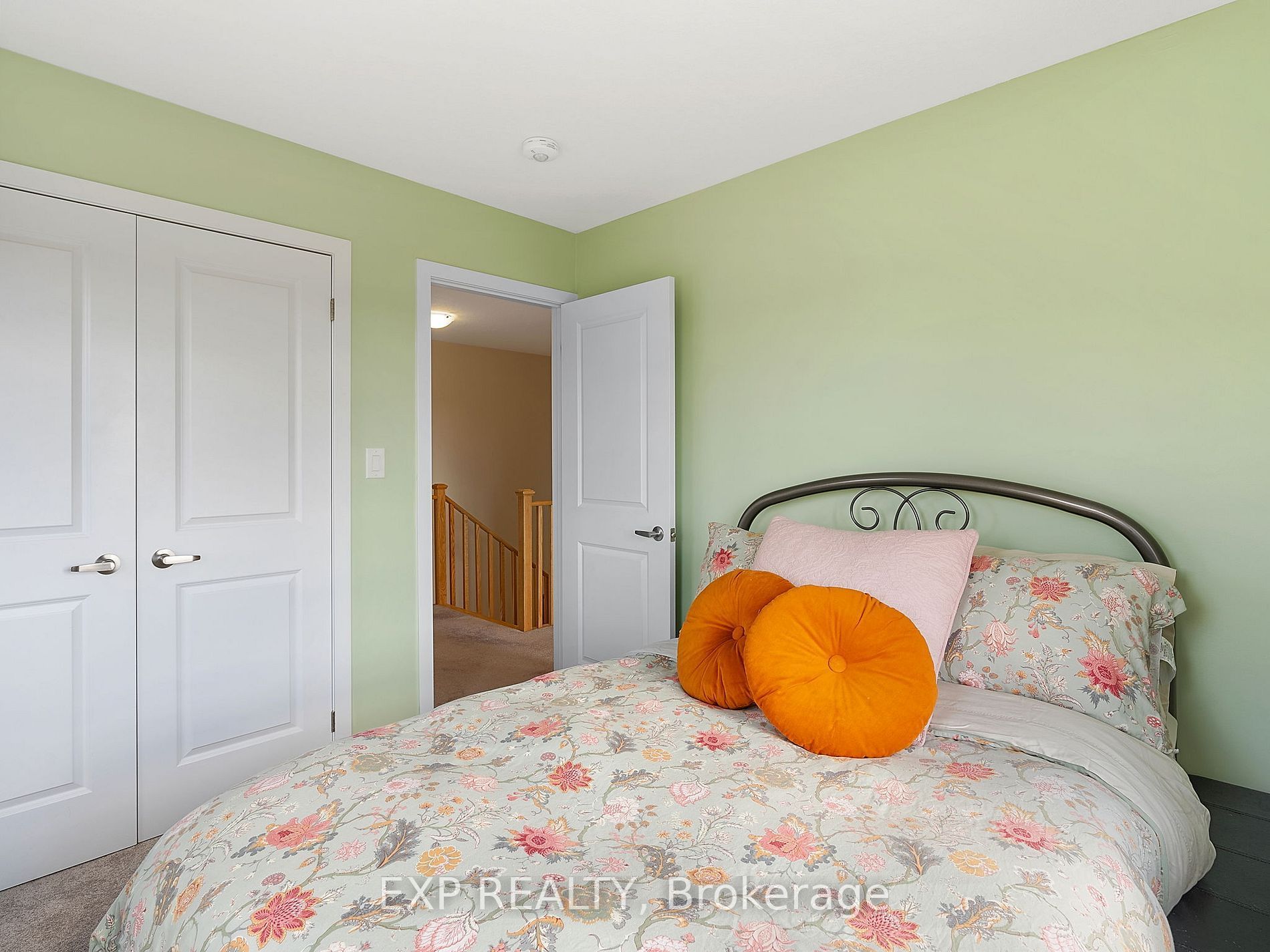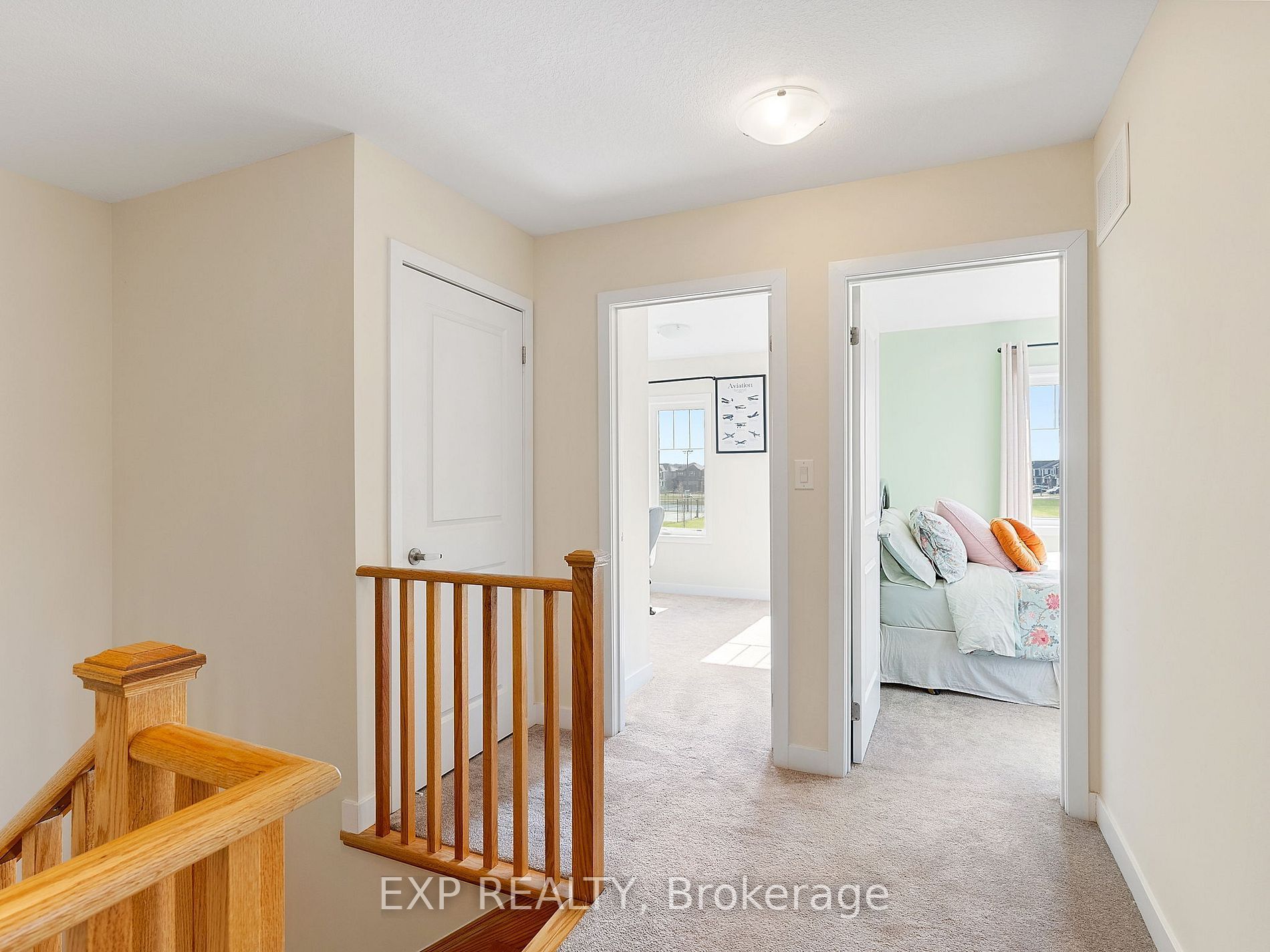 • Elegant oak staircase leads to a comfortable primary bedroom with custom vanity.