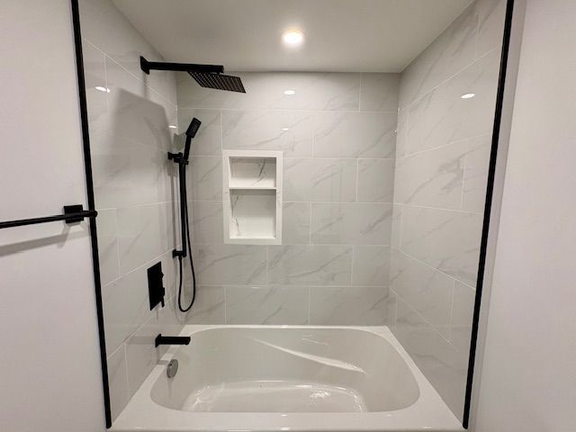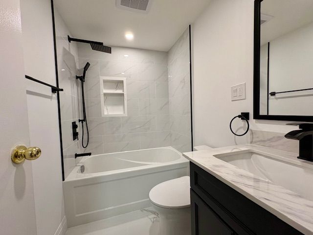 • Spa-inspired bathroom with stylish black hardware and organized storage.