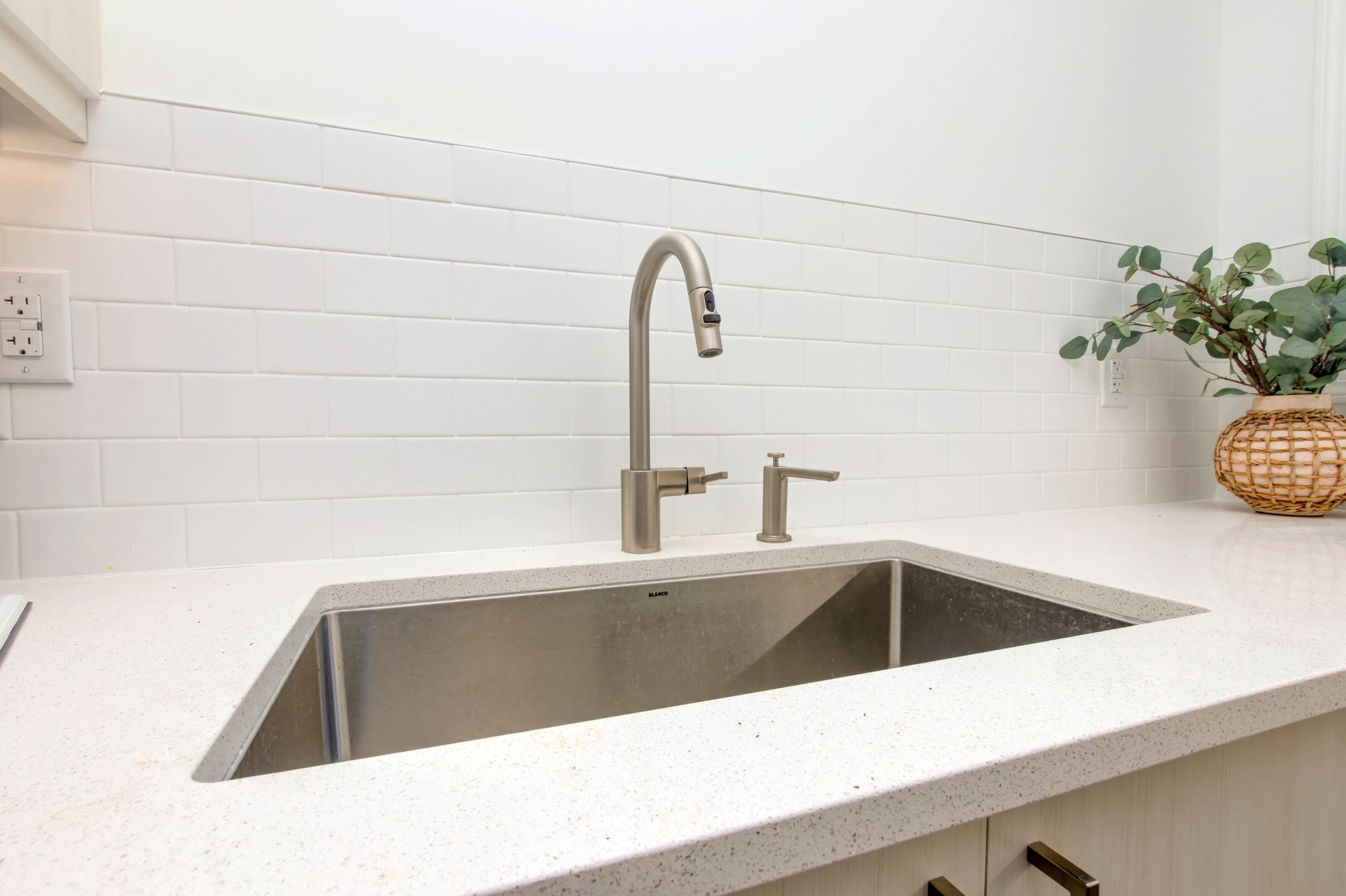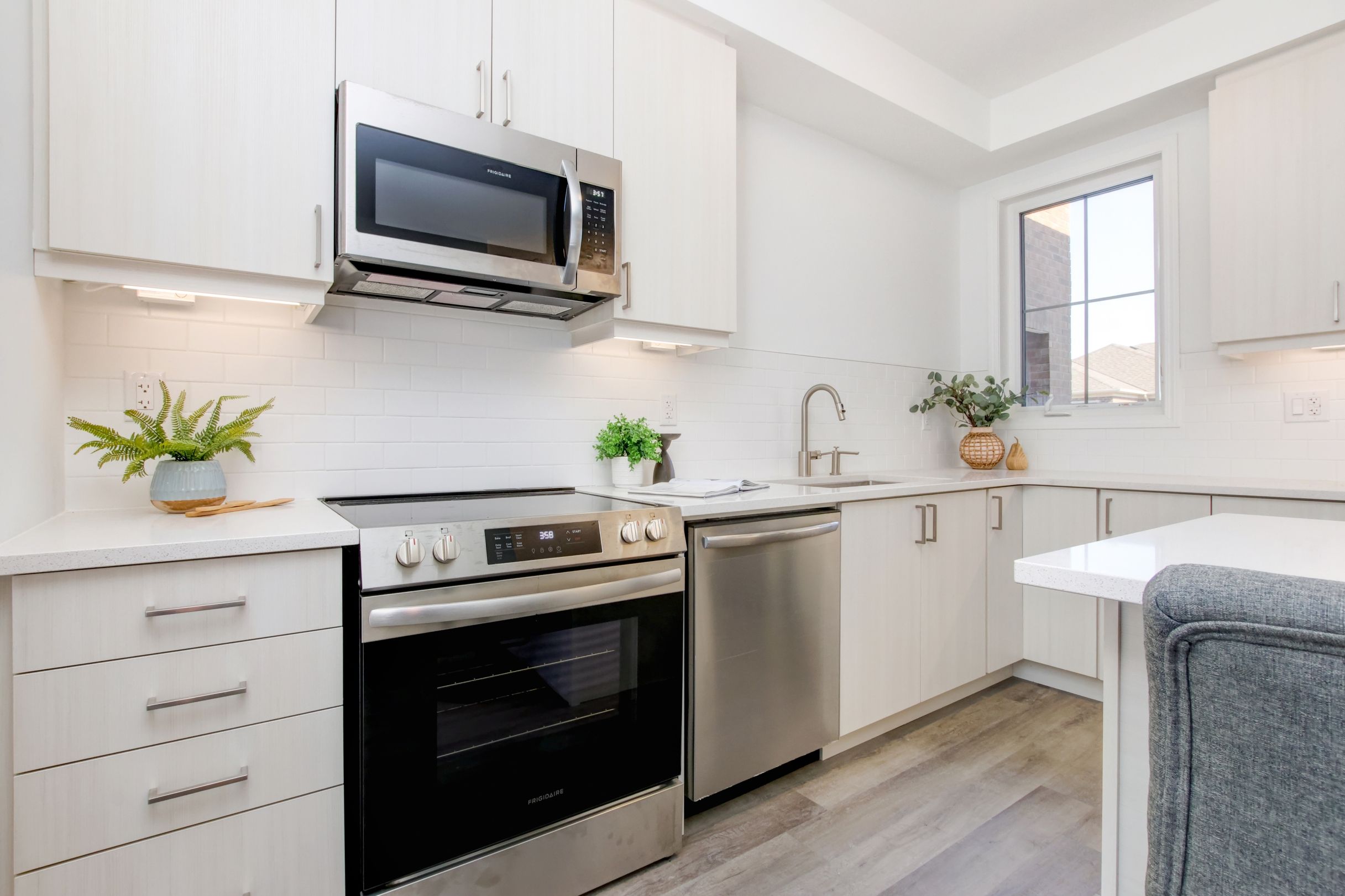• Modern kitchen featuring stainless steel appliances and quartz countertops.