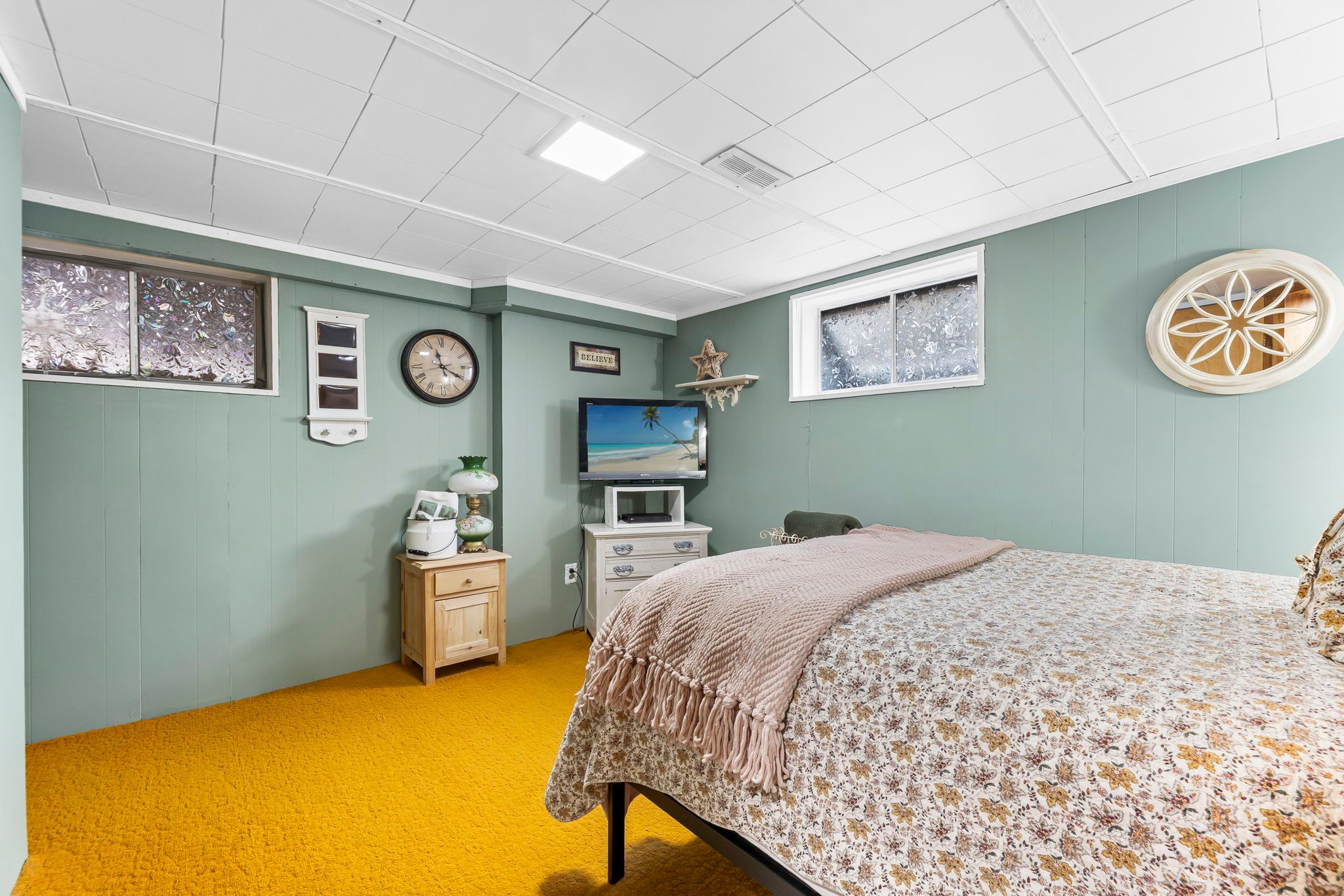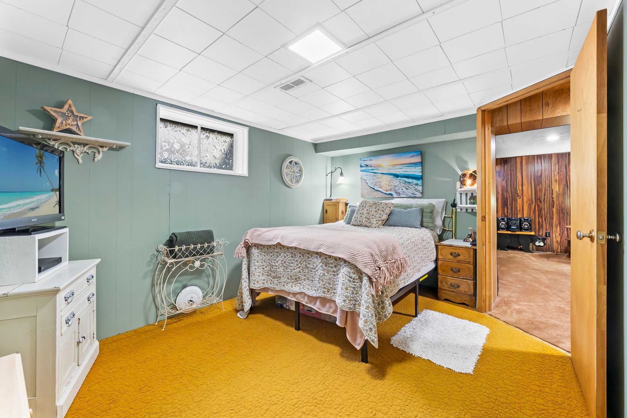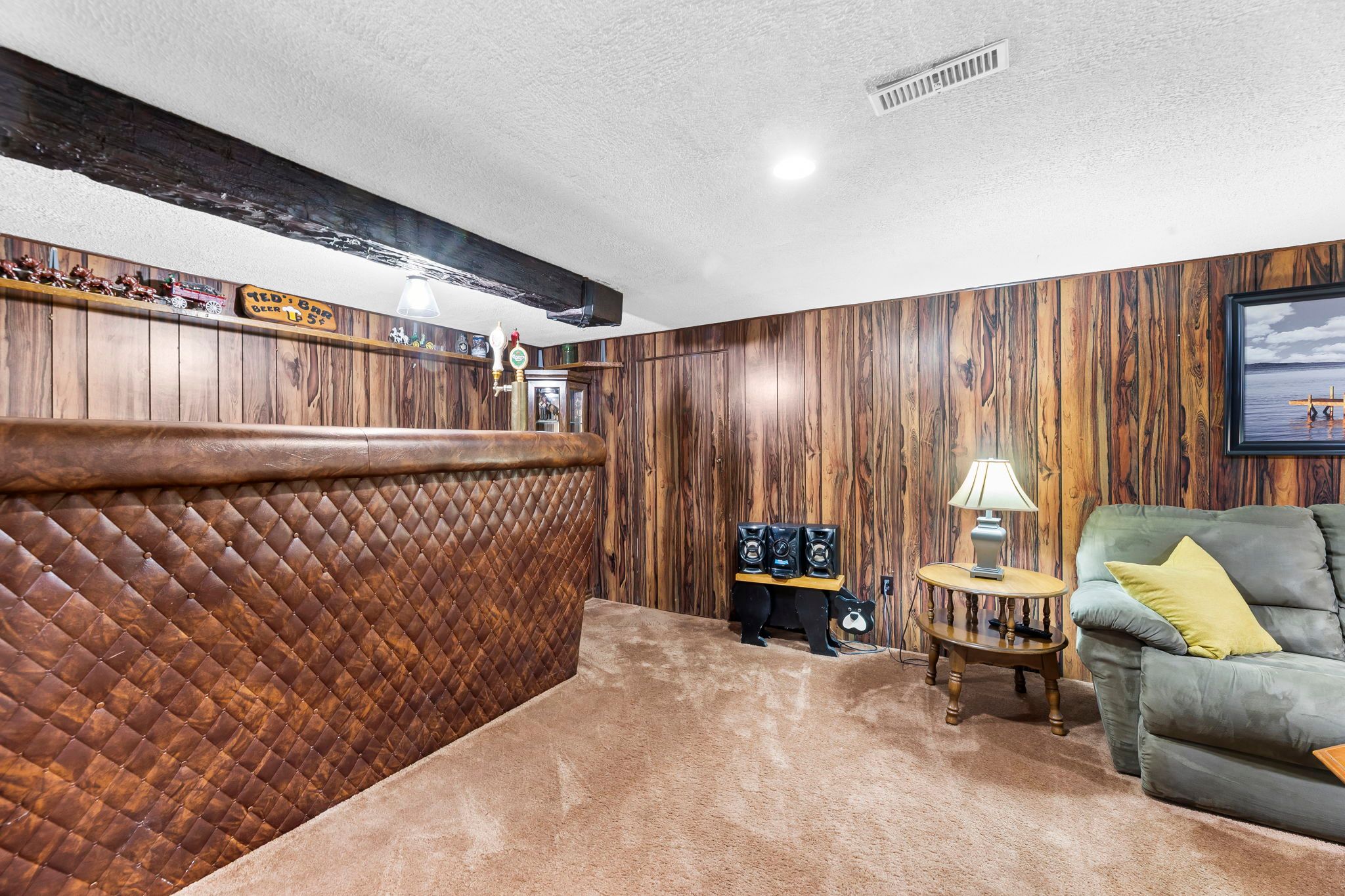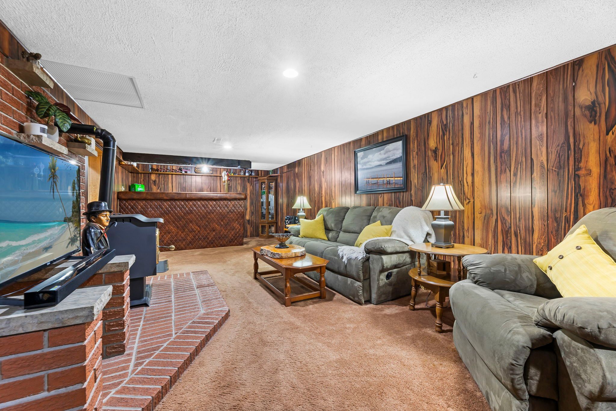 • Finished lower level includes recreational space, bar, and extra bedroom.