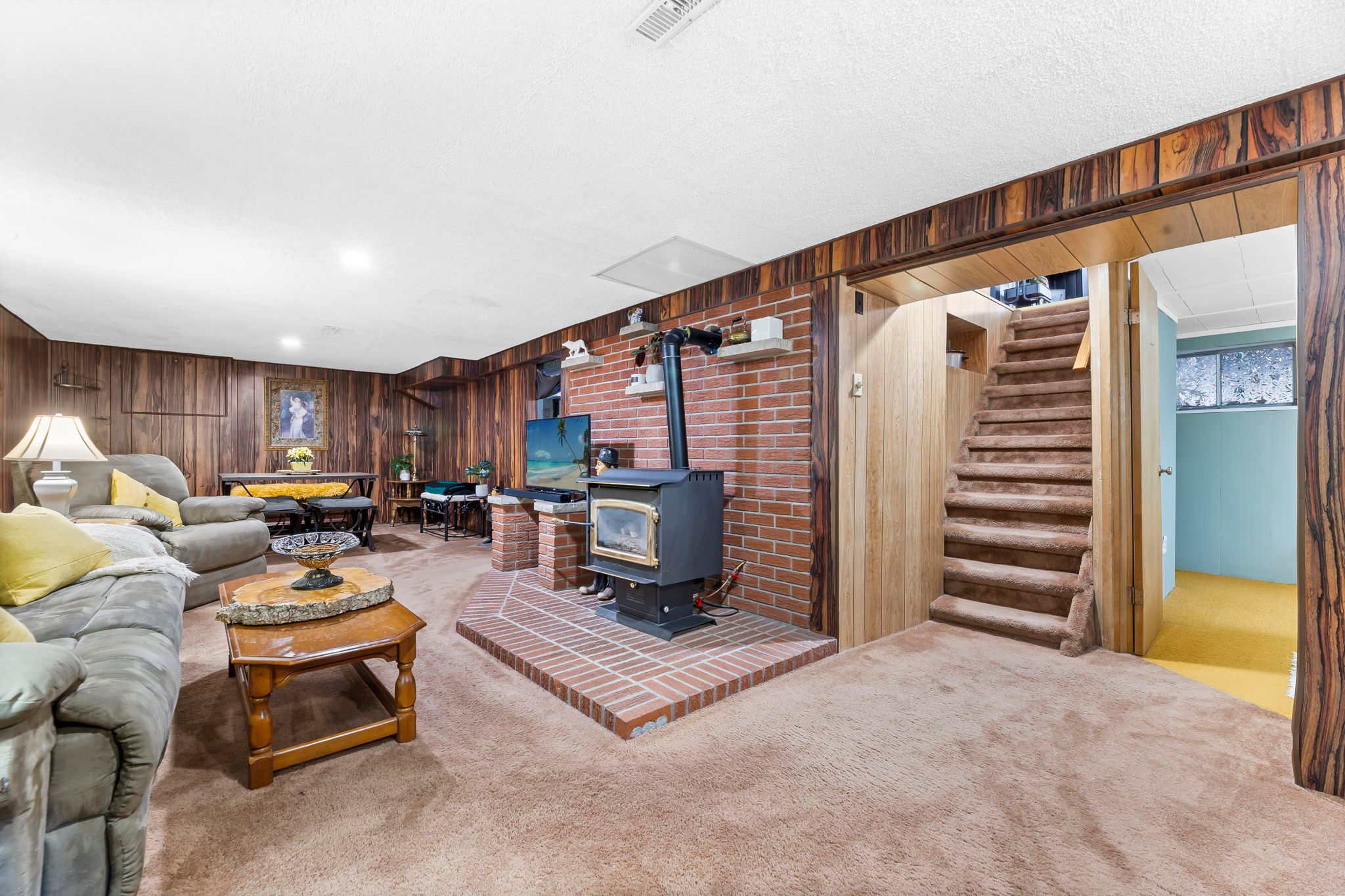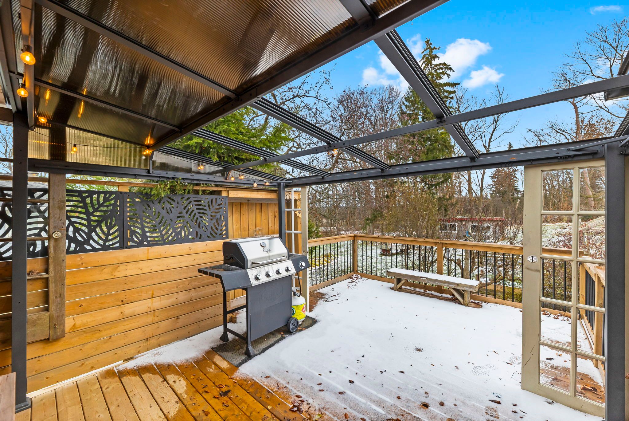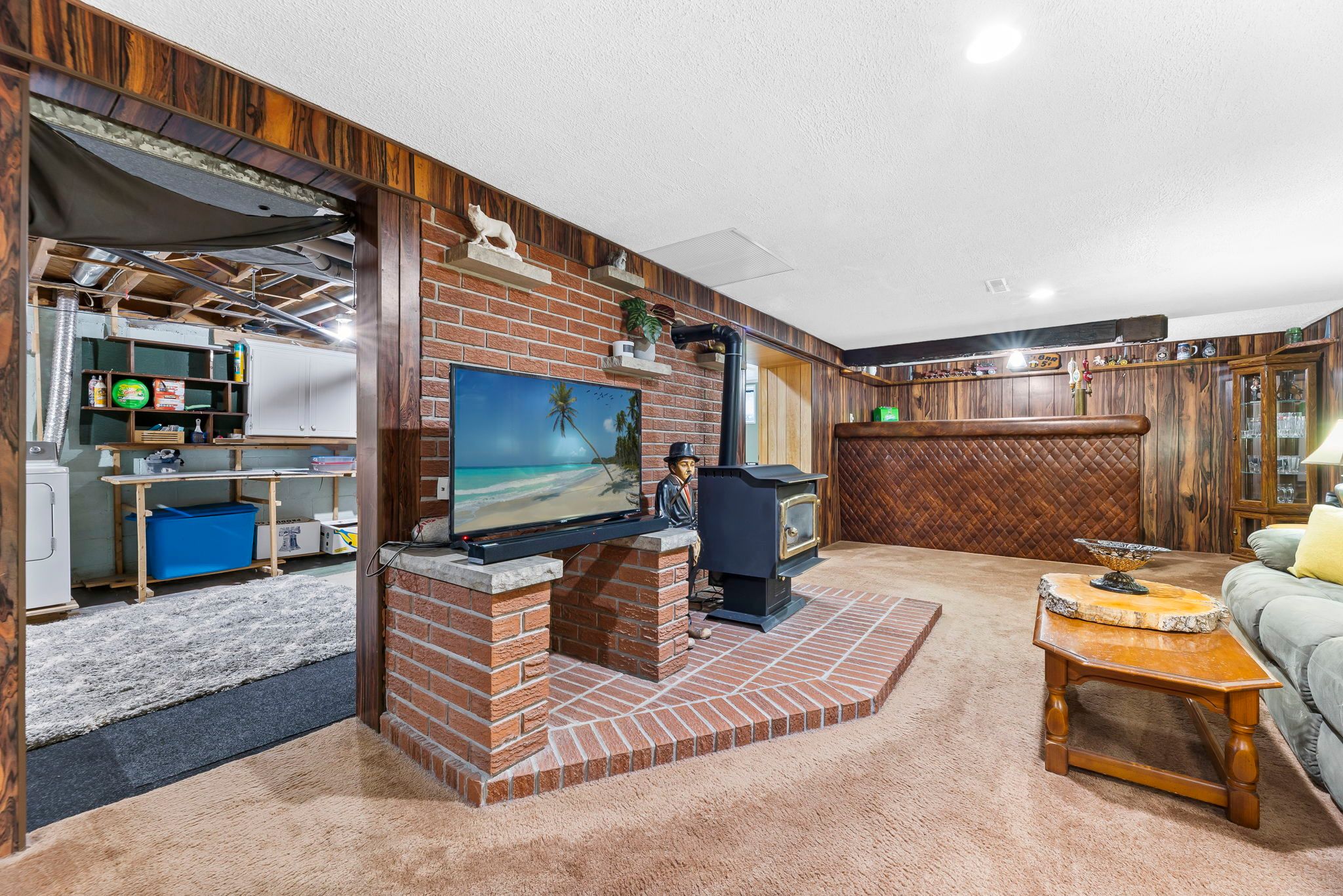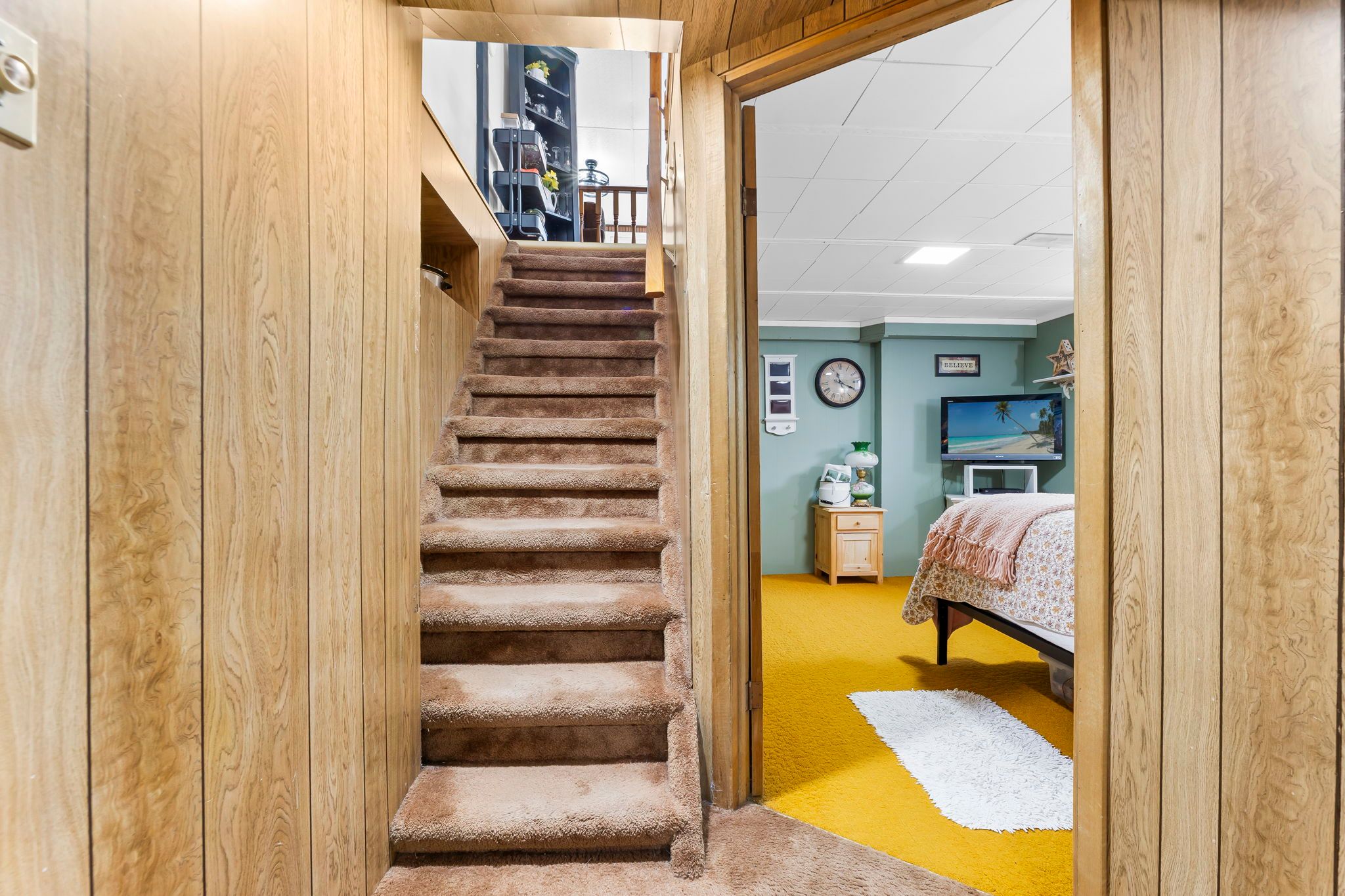 • Finished lower level includes recreational space, bar, and extra bedroom.