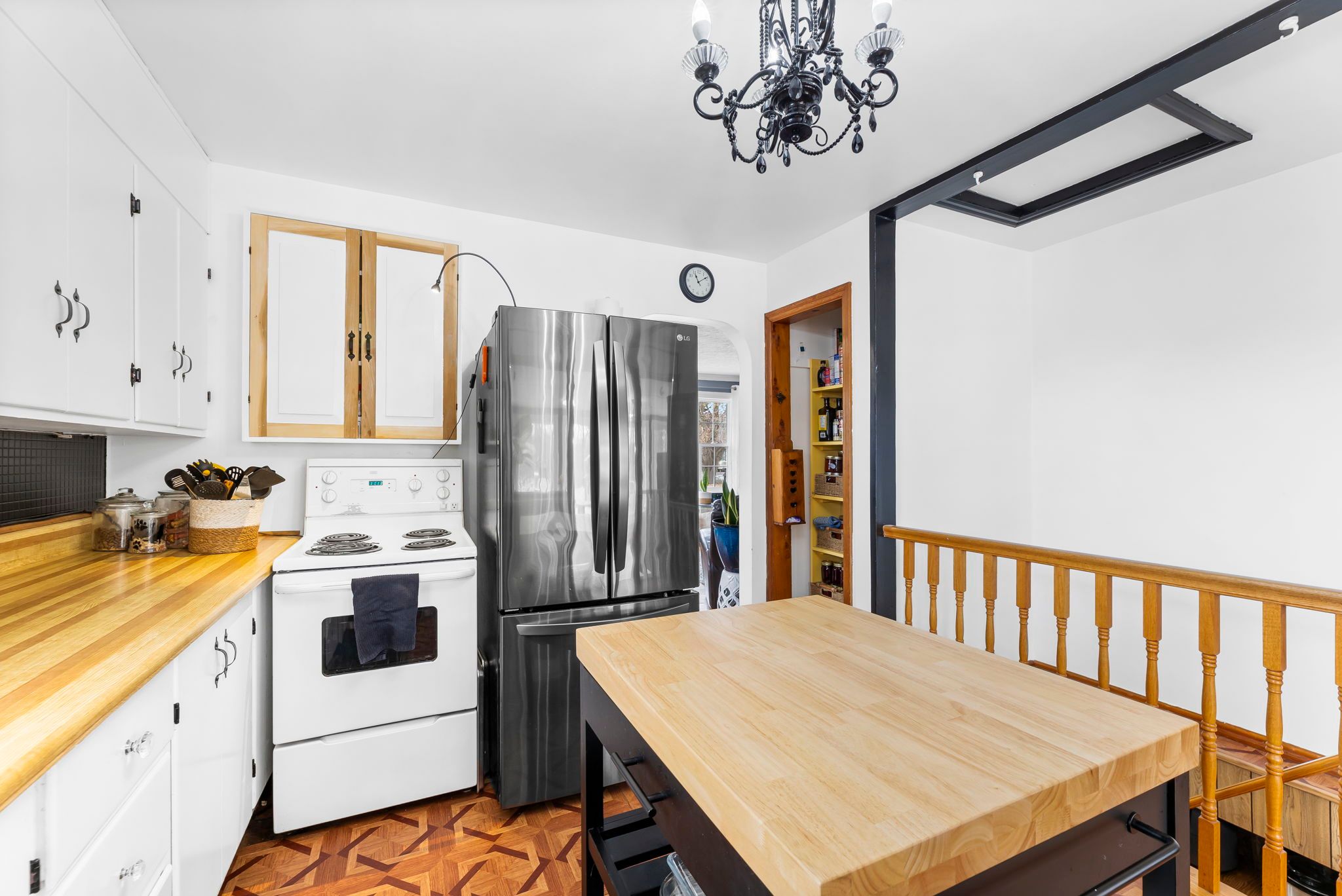 • Bright kitchen opens to dining and living area with hardwood floors.