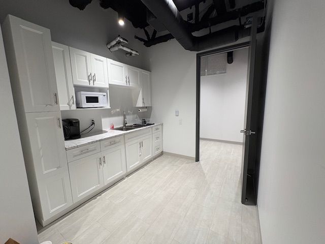 • Includes private offices, kitchenette, and open work areas.