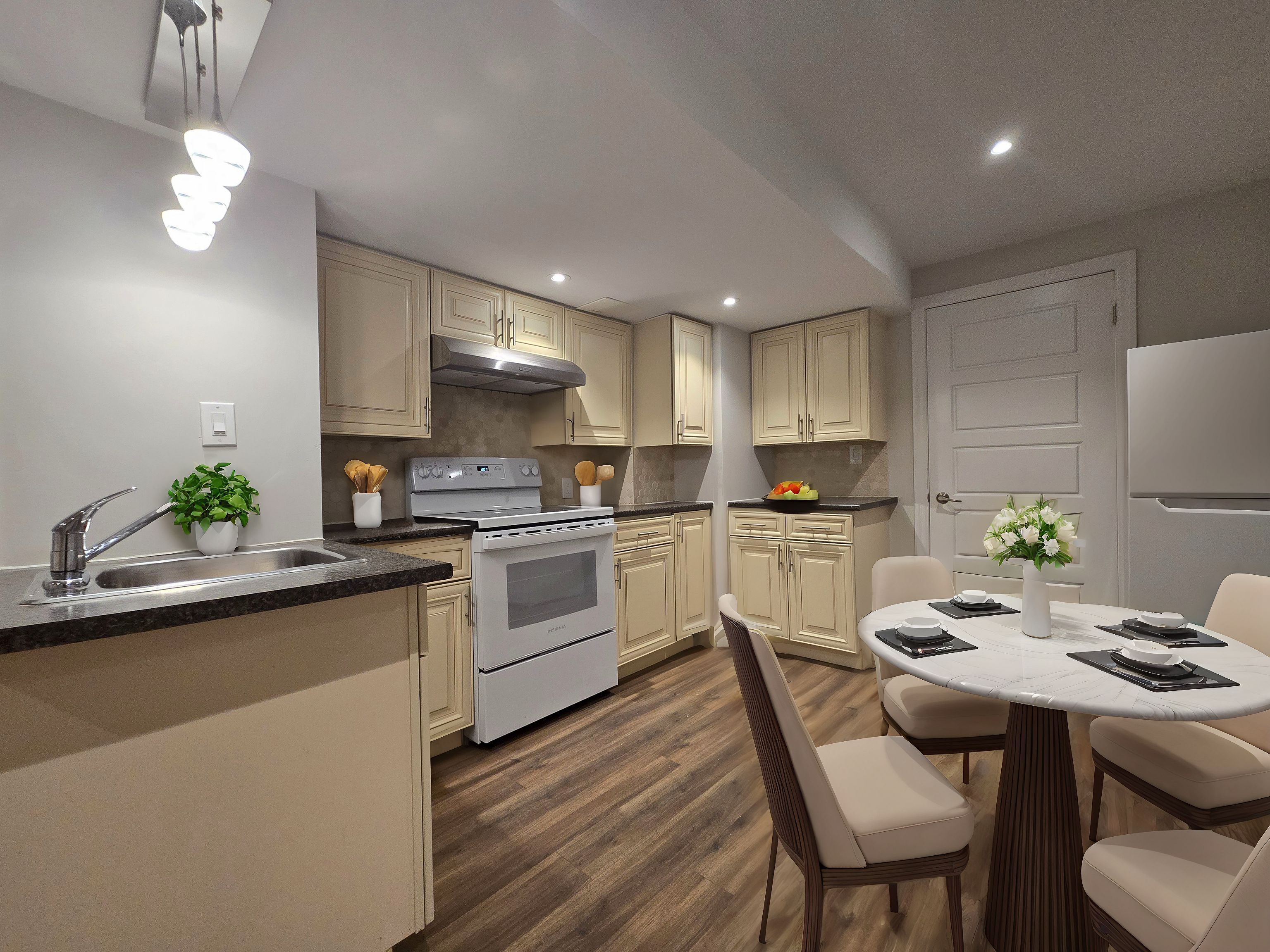 • Modern white kitchen with quartz countertops and two pantries for storage.