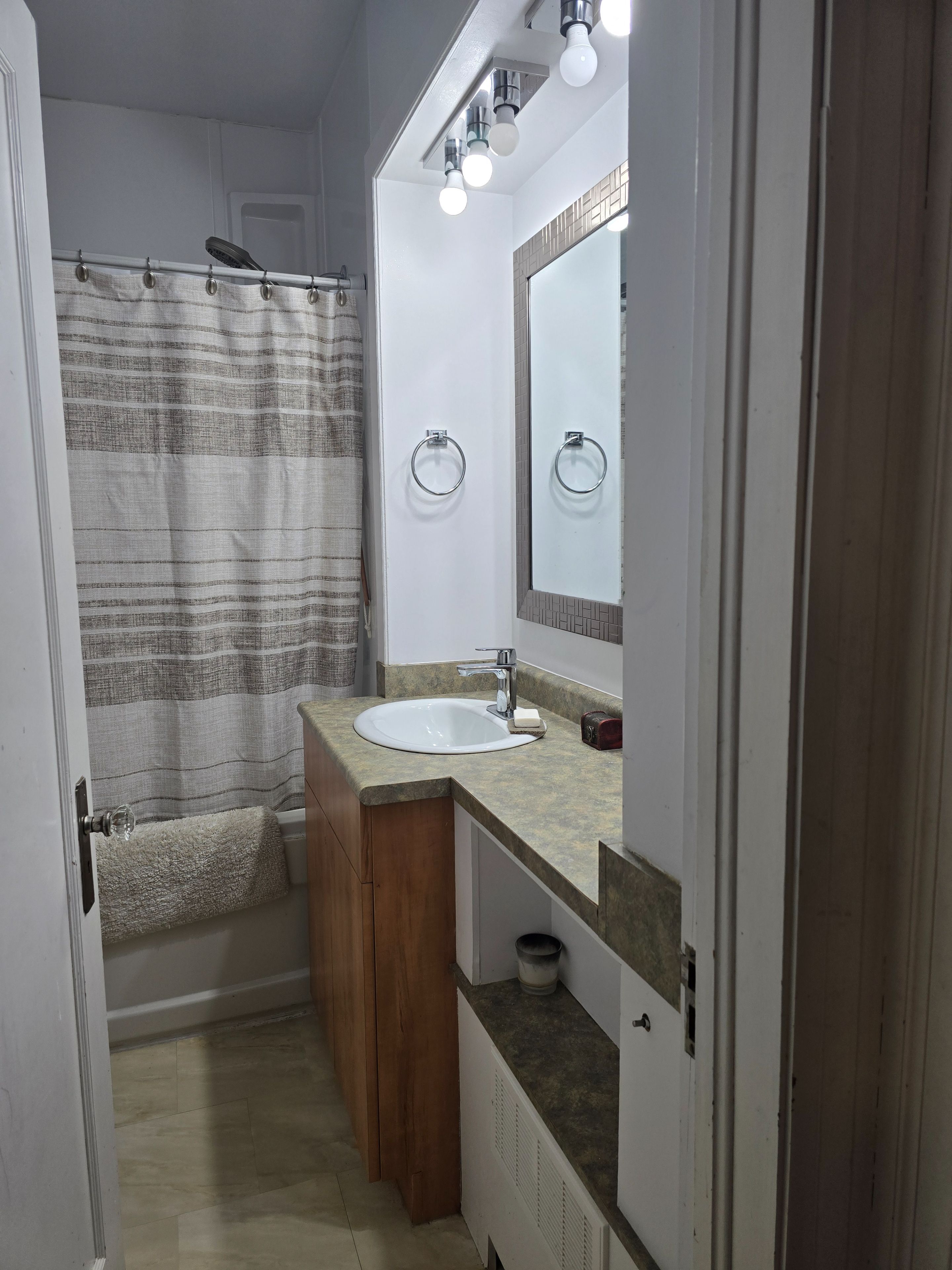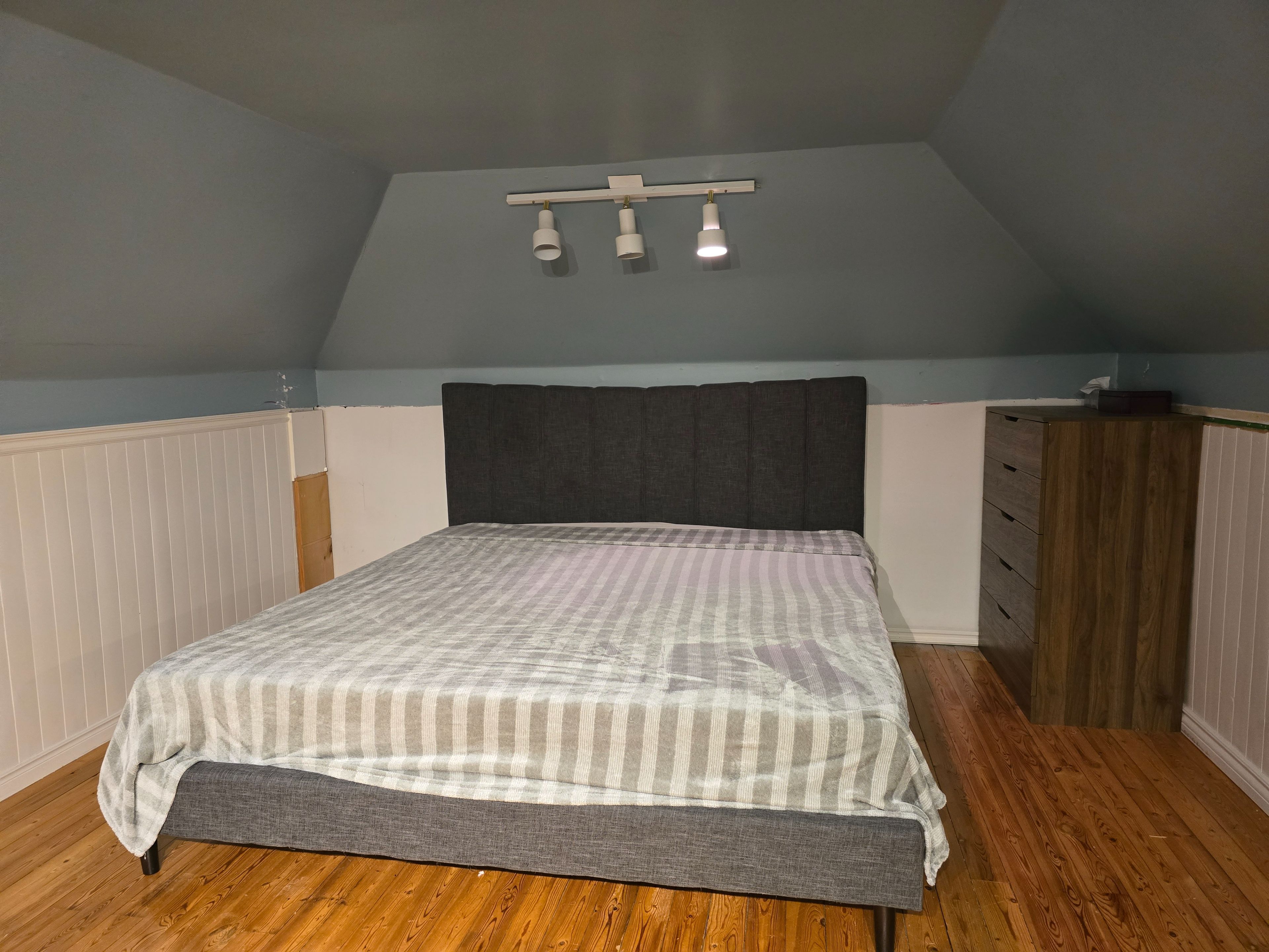 • Spacious loft-style bedroom upstairs with a private bathroom.