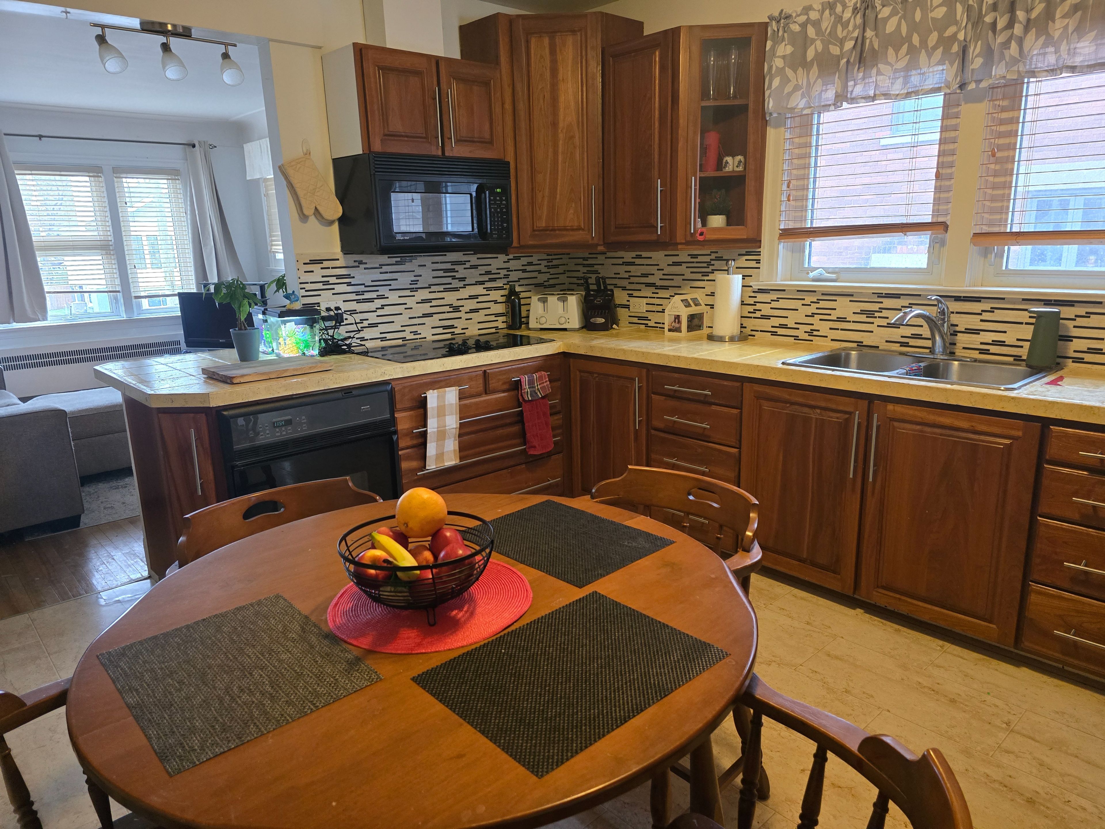 • Large kitchen and dining area leading to a cozy living room.