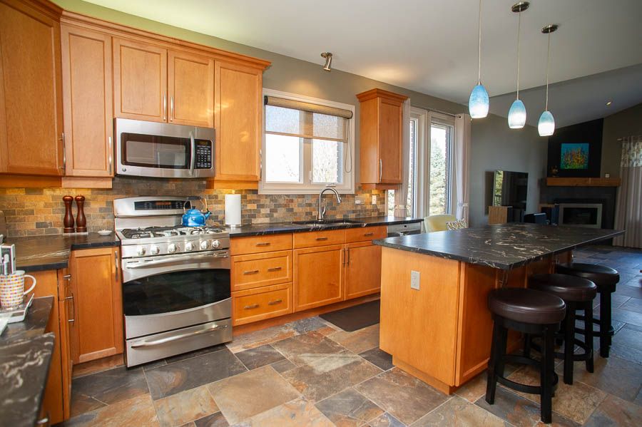 • Functional kitchen featuring stainless-steel appliances and large island with granite.