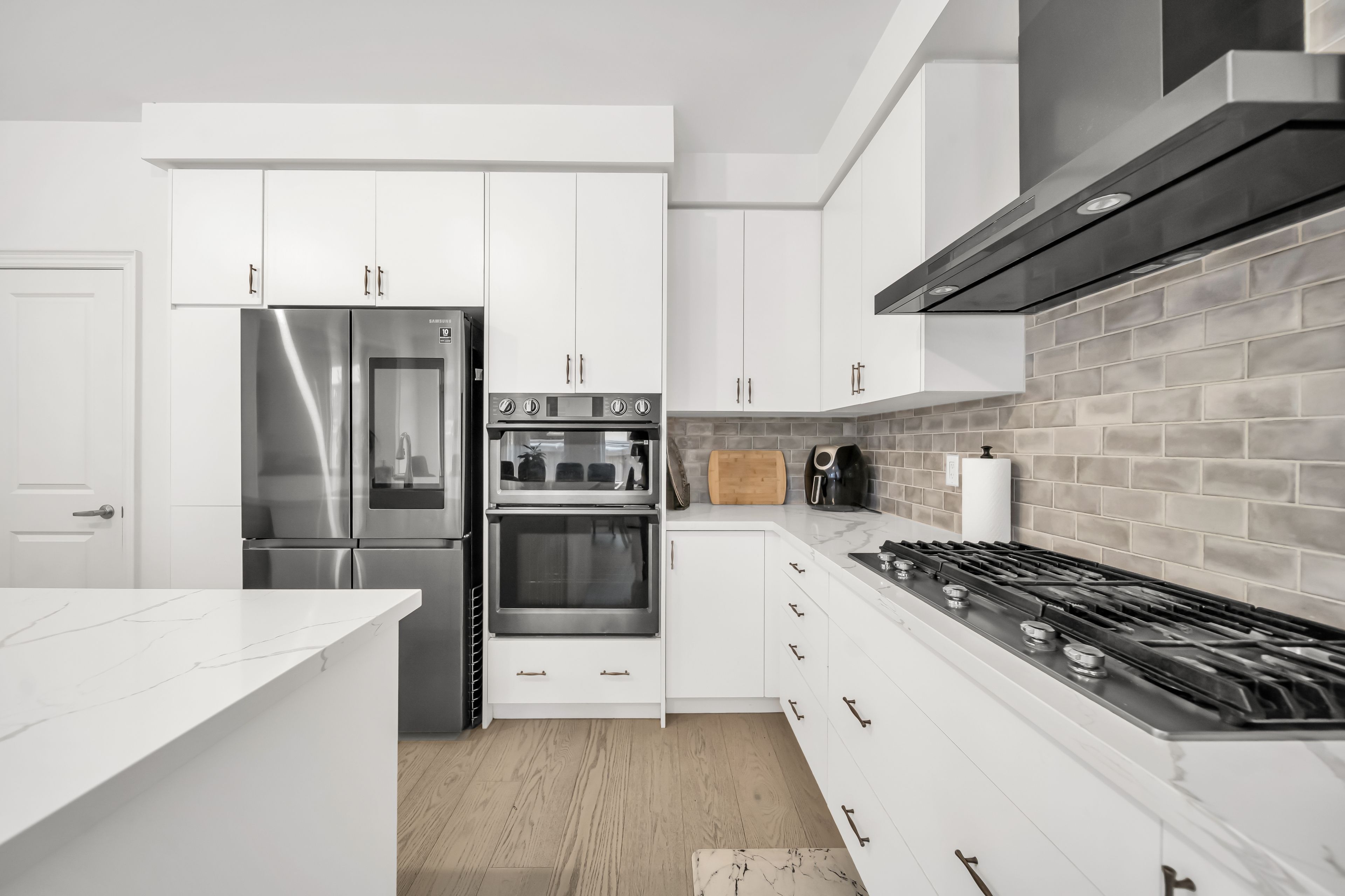 • Chef-inspired kitchen with granite countertops and ample cabinetry space.