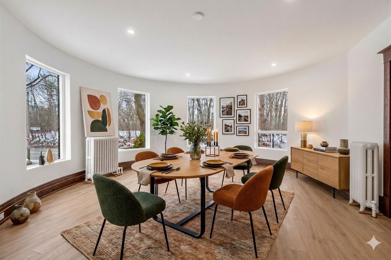 • Unique curved living room with wraparound windows and treetop views.