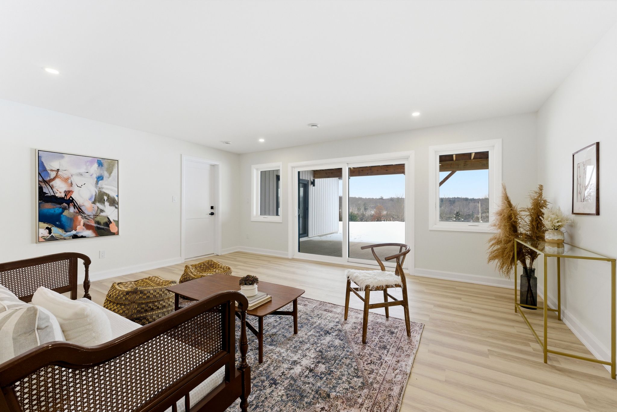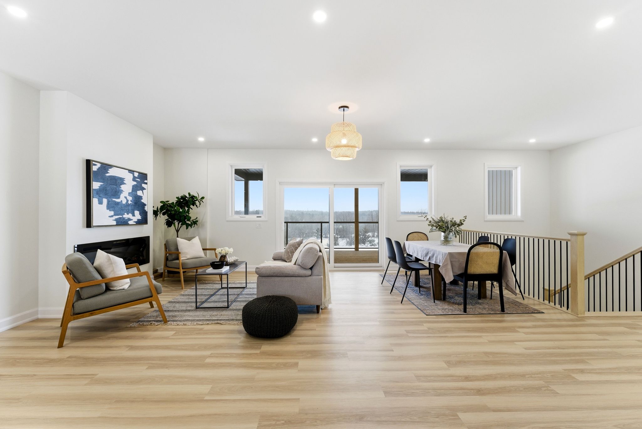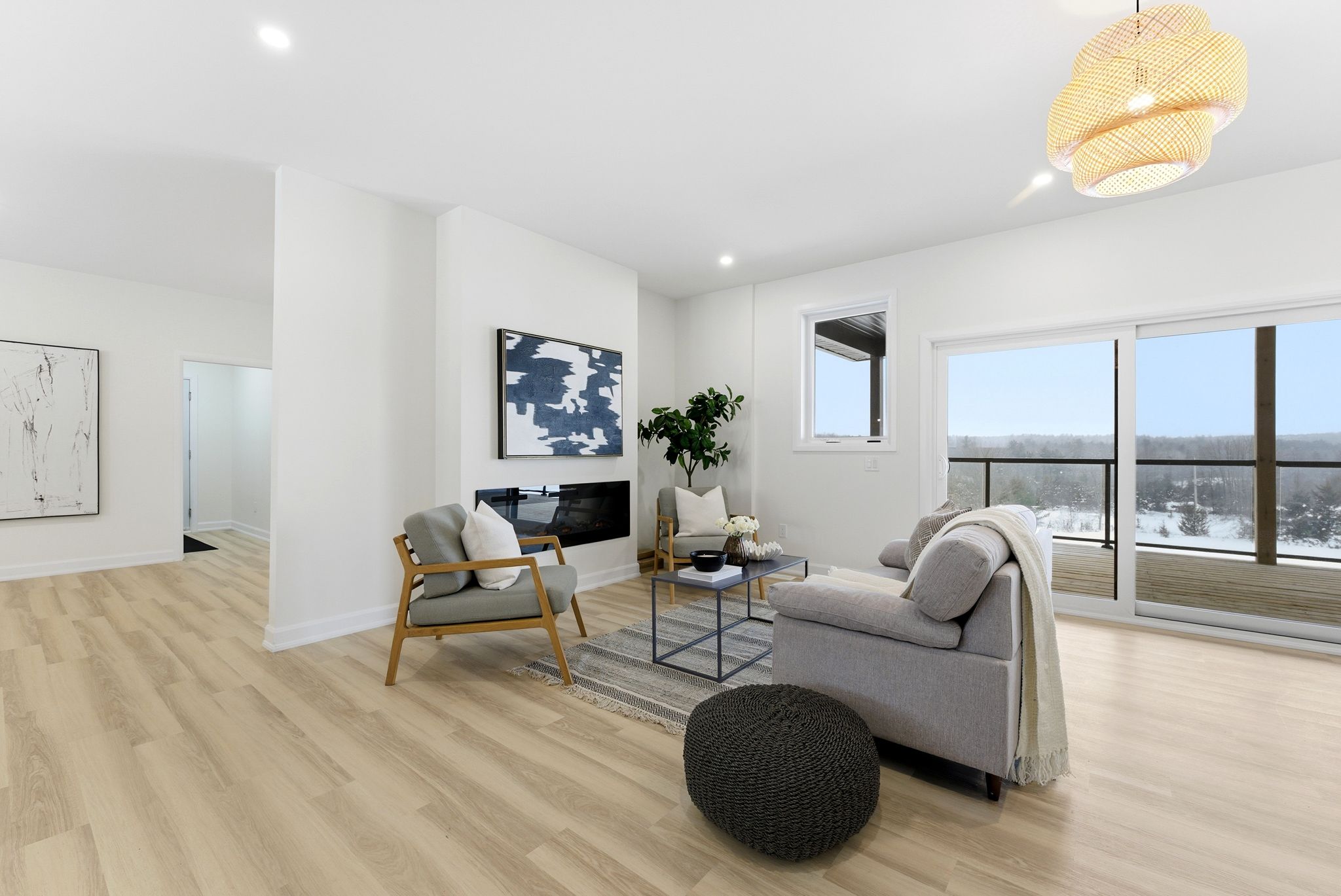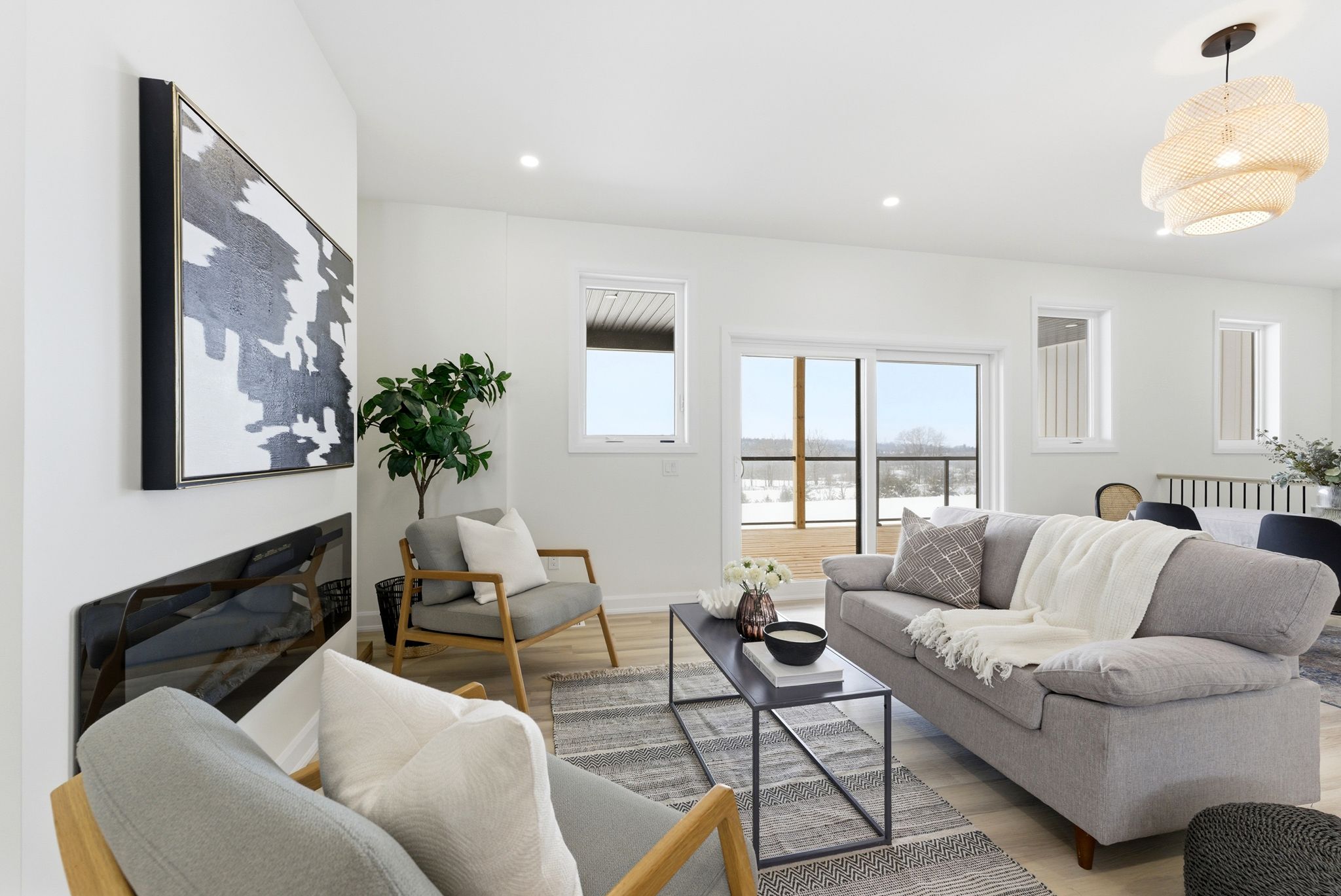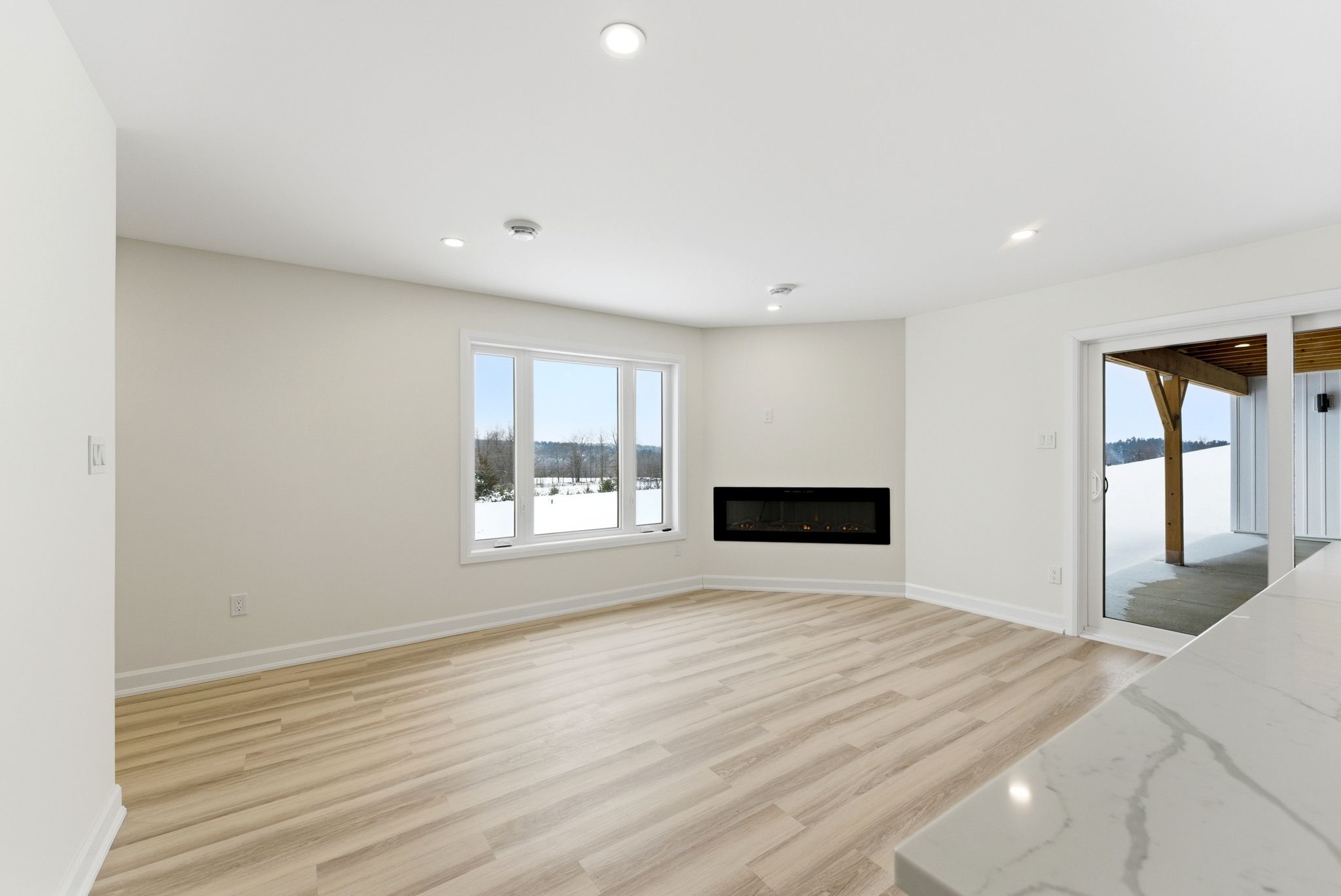 • Bright living room with large windows and a cozy fireplace.