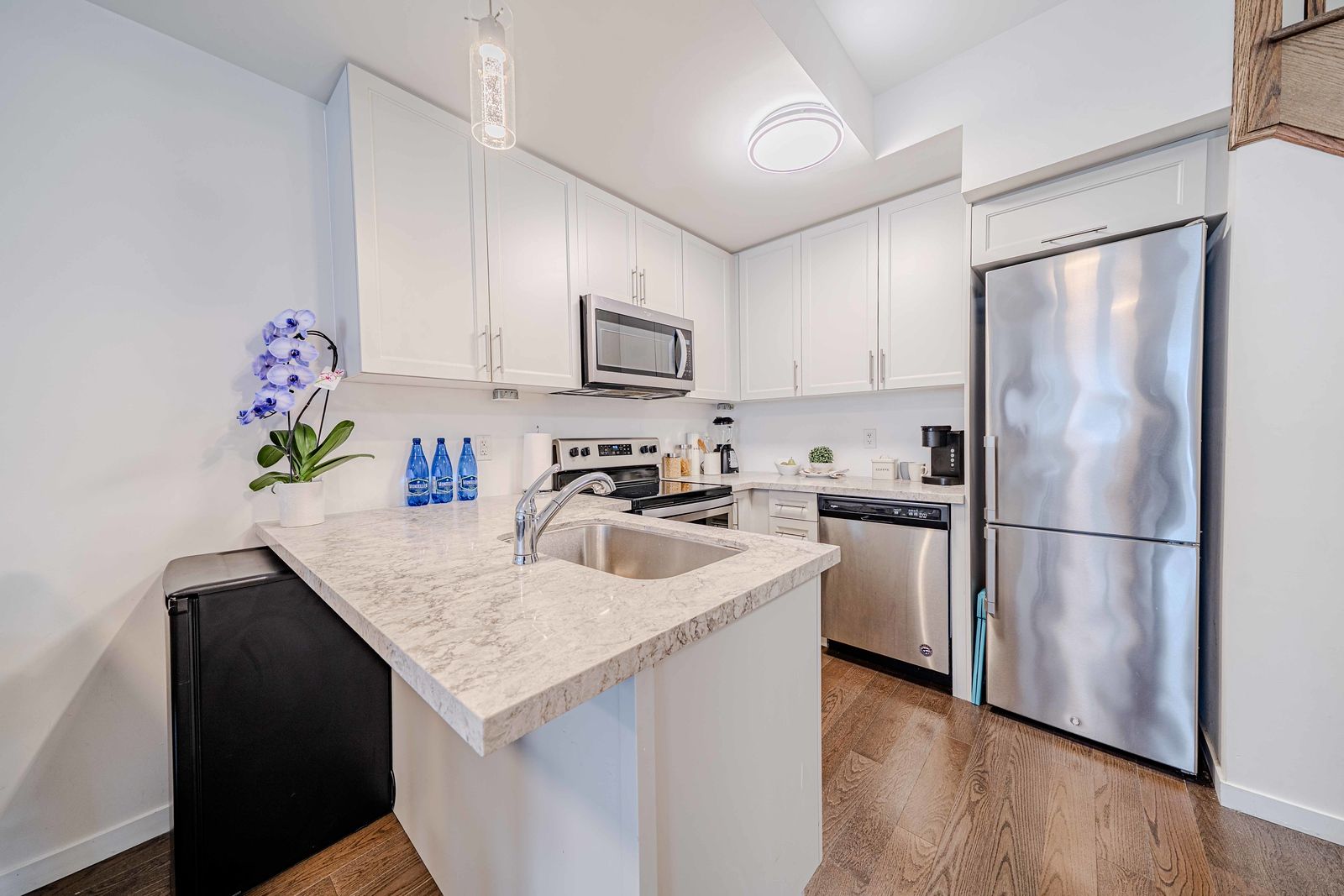 • Modern kitchen features upgraded cabinets, quartz countertops, and stainless steel appliances.