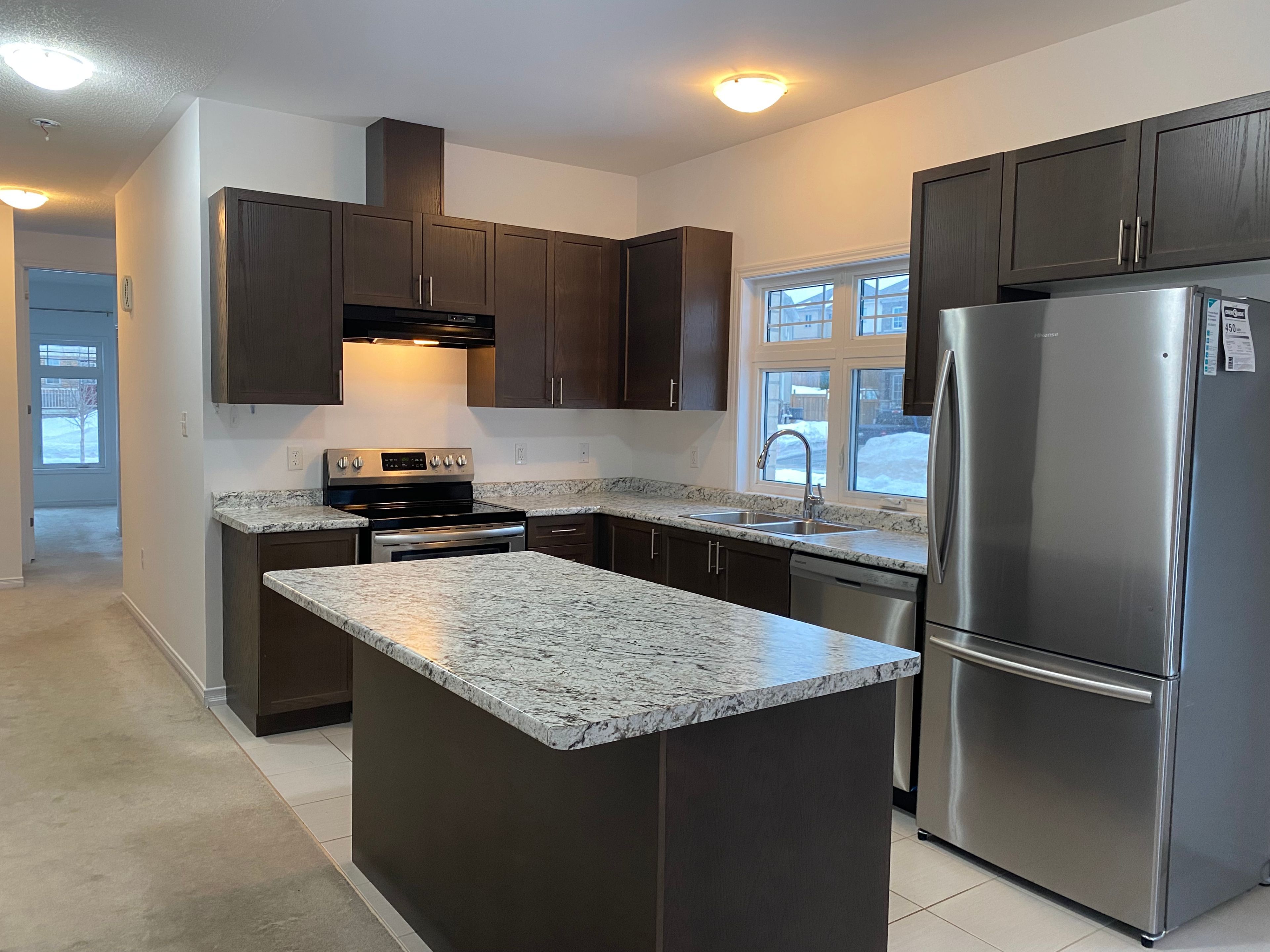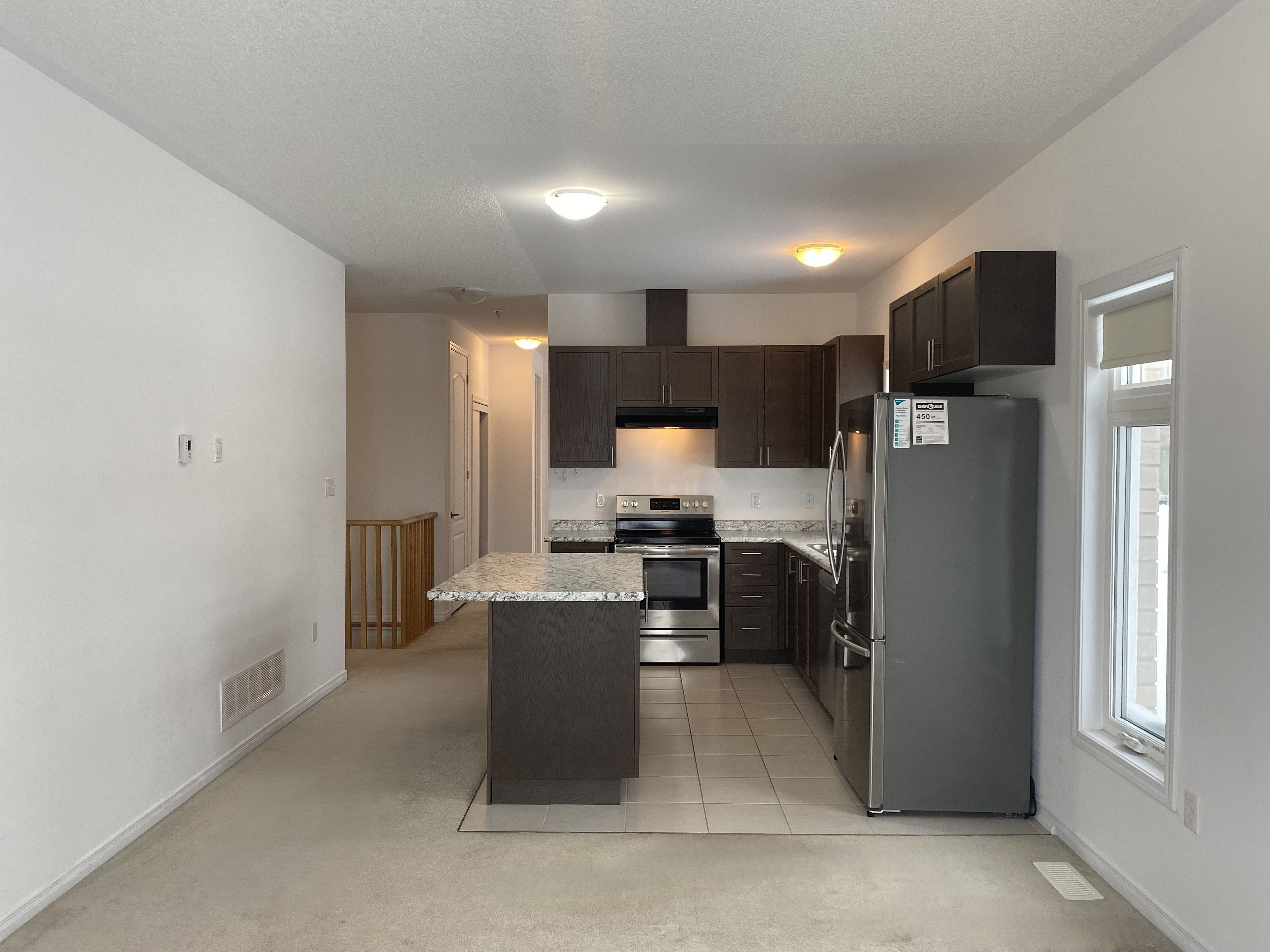 Lives like a detached home, this 5-year-old corner bungalow townhouse is attached only by the garage. Freshly painted, meticulously maintained and exceptionally clean, it offers 3 bedrooms and 2 full bathrooms. The spacious primary bedroom includes an ensuite and a double-sized closet. The bright, lookout unfinished basement is clean and welcoming, featuring a large window-ideal for a future recreation area-along with ample storage space. A walk-out from the family room leads to a generous deck complete with a gas bbq line. Additional features include central air conditioning, a remote garage door opener, and an underground sprinkler system with a rain sensor. The oversized garage with direct entrance to the house fits a full-size truck and provides direct access to the house. Convenient access to the backyard via a side door in the garage. The driveway has no sidewalk and comfortably accommodates two vehicles, offering a total of three parking spaces.