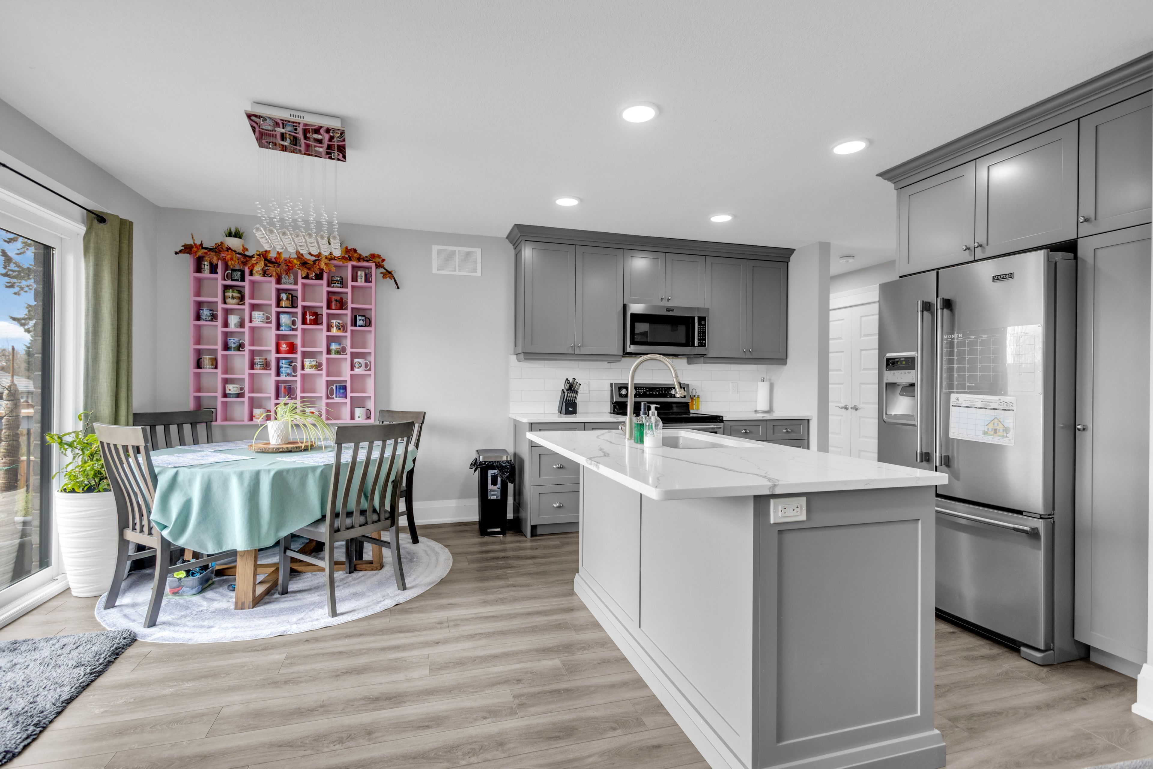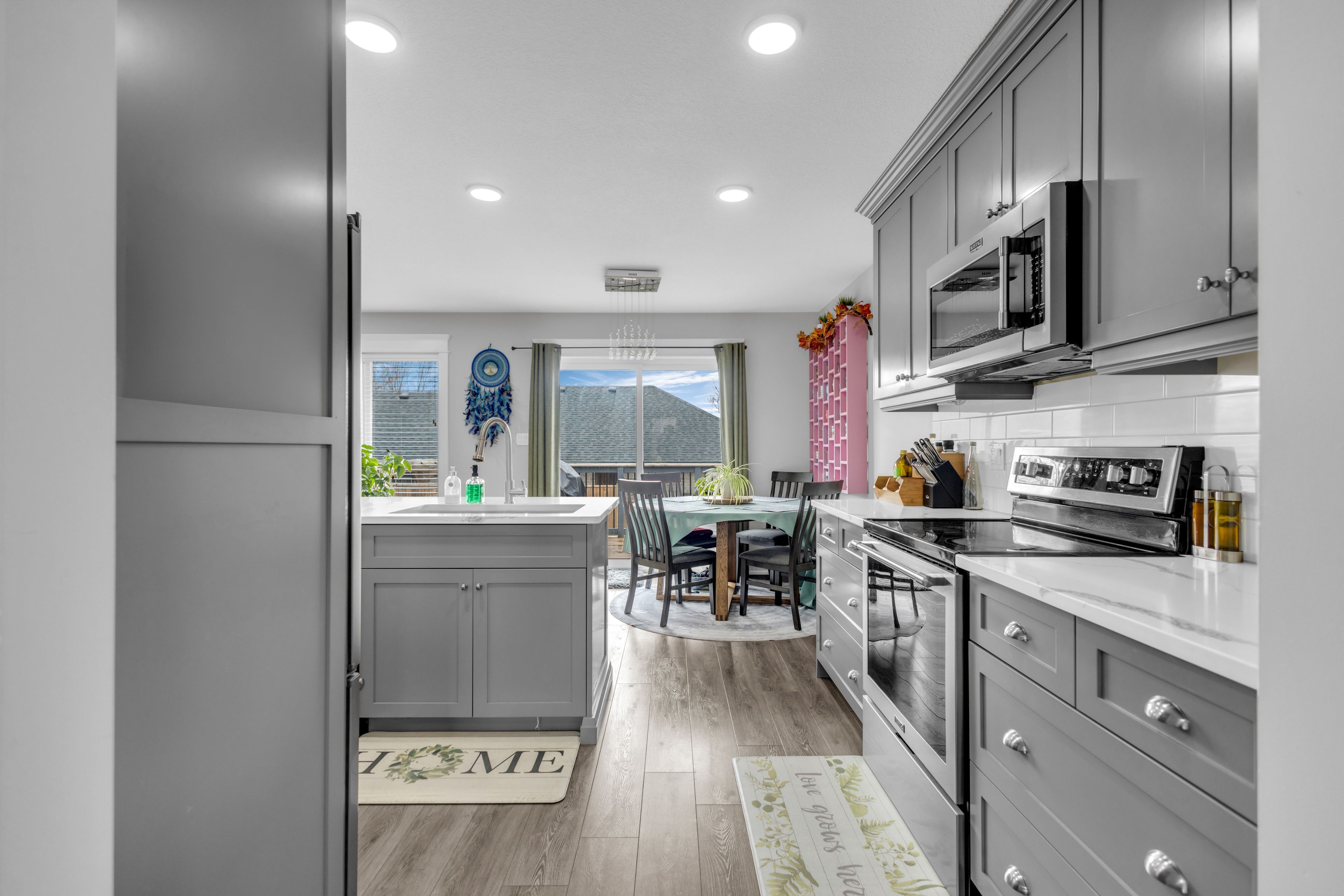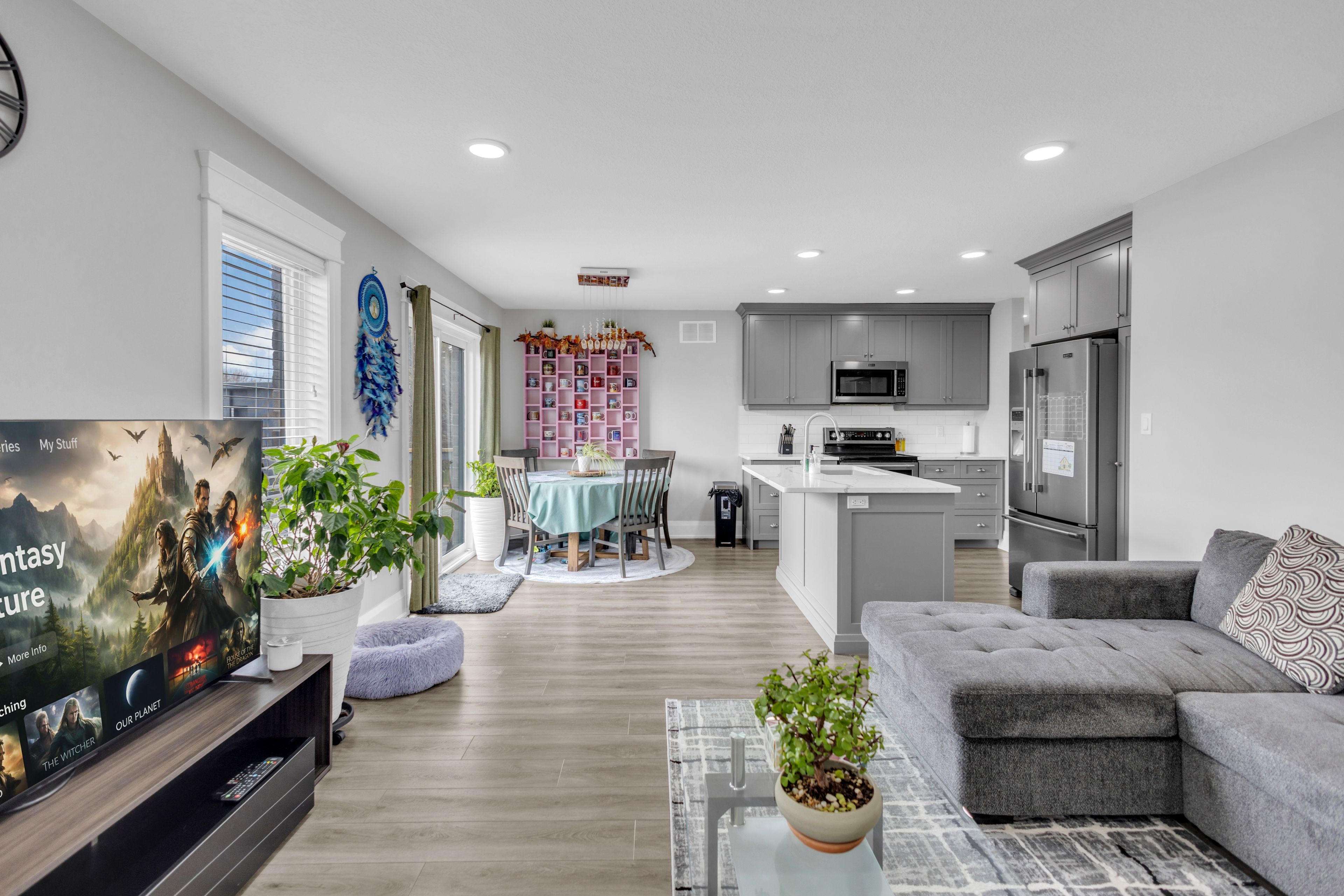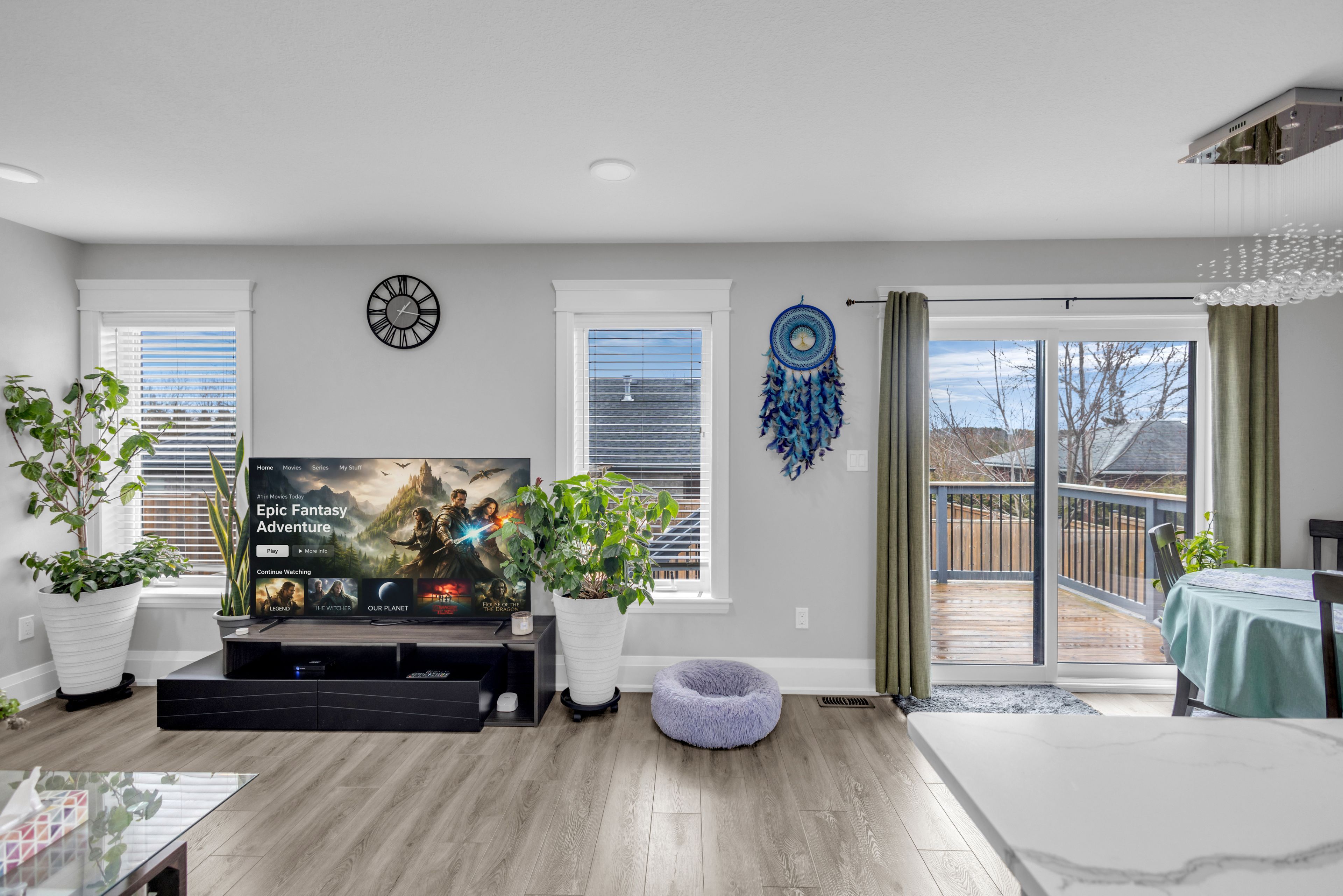 • Bright open-concept main floor with modern kitchen, dining, and living space.