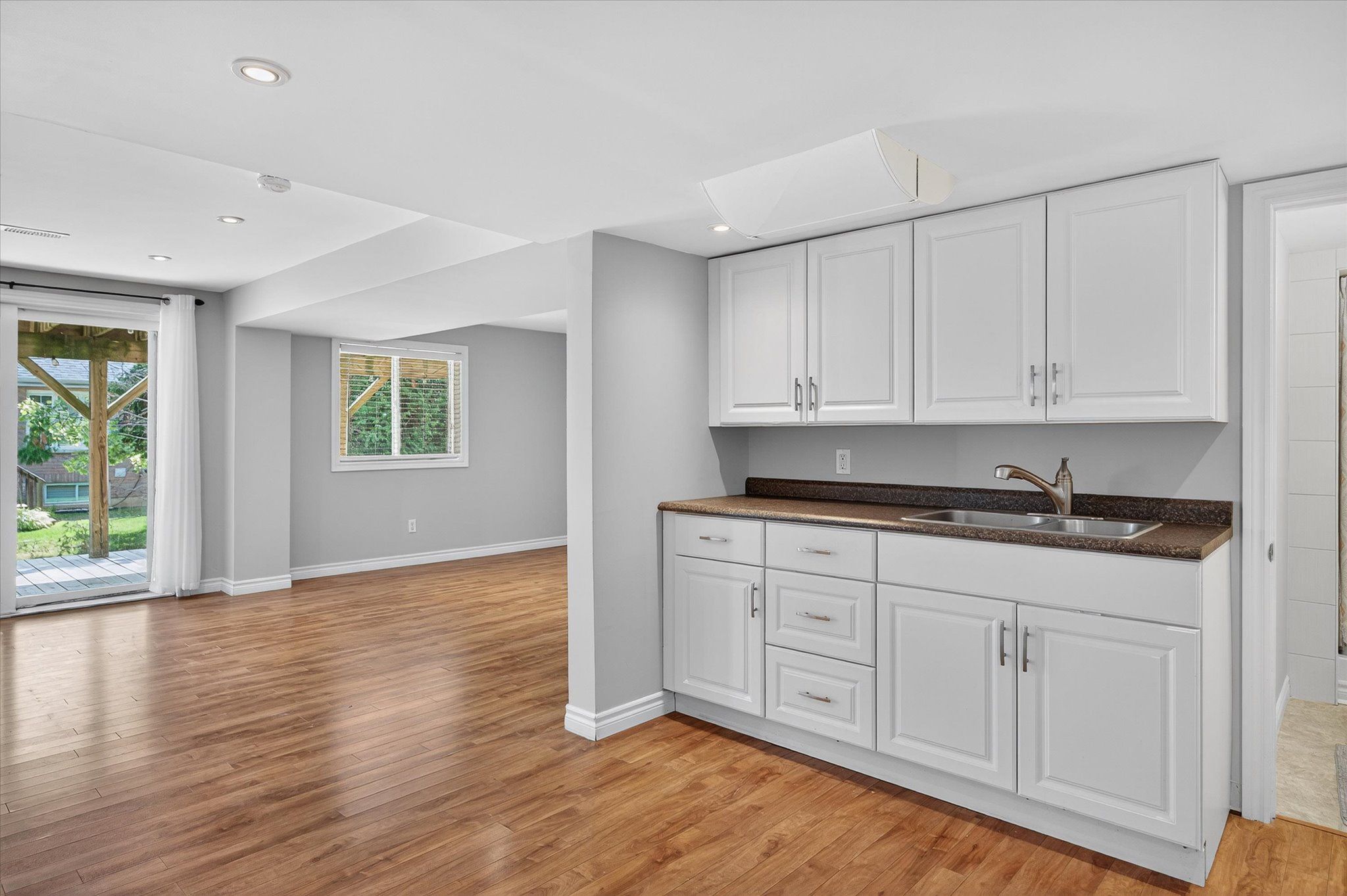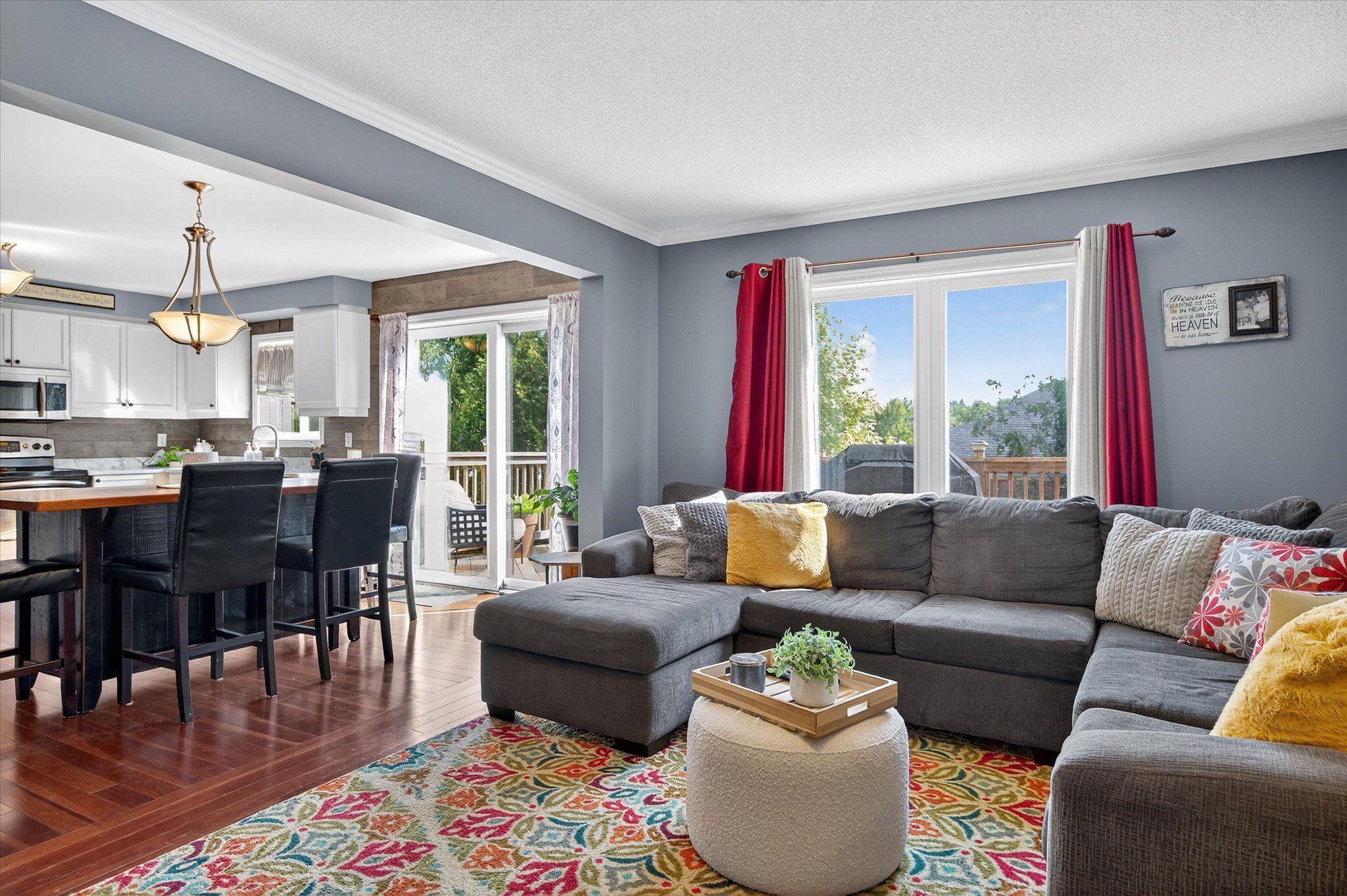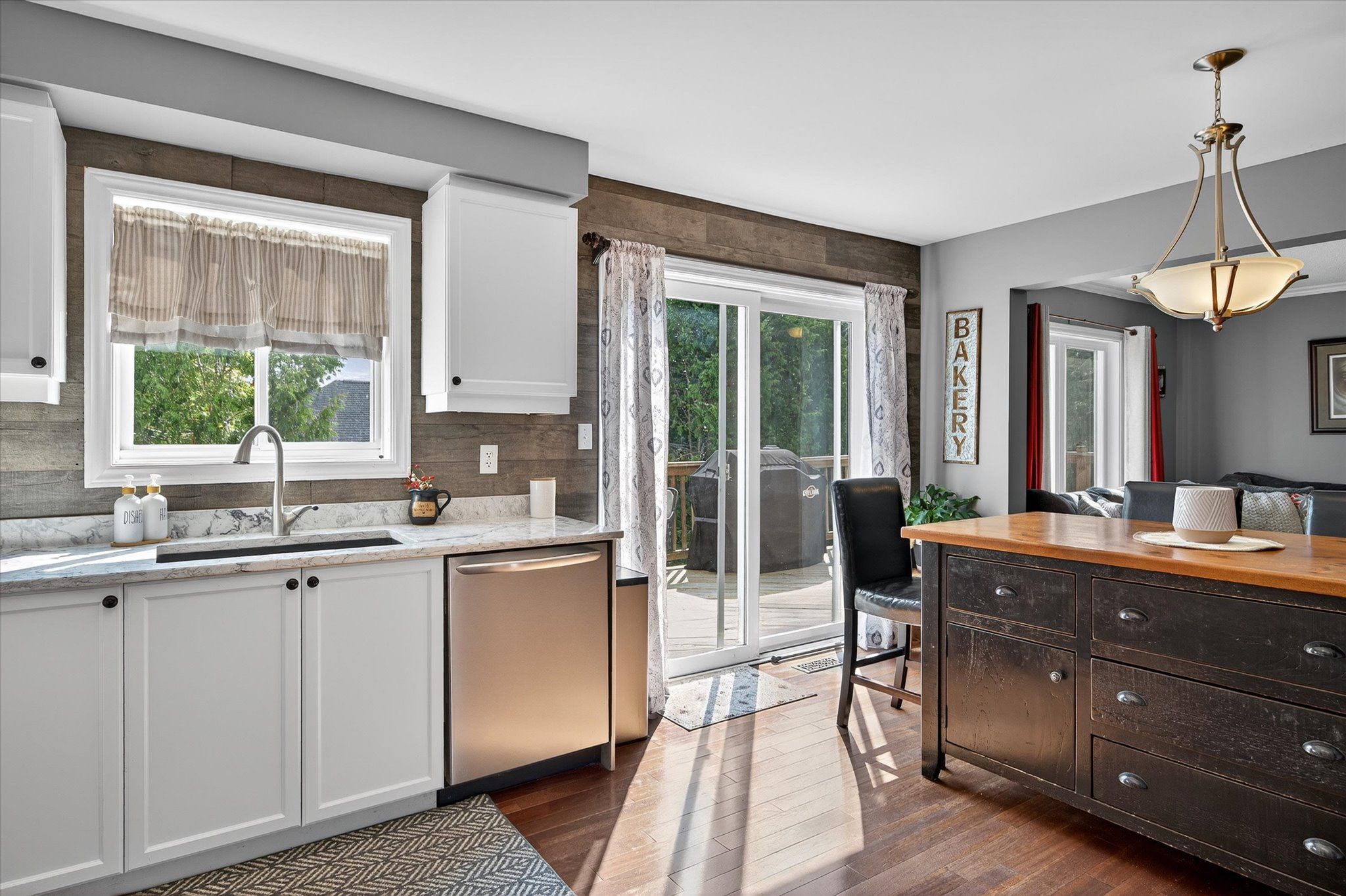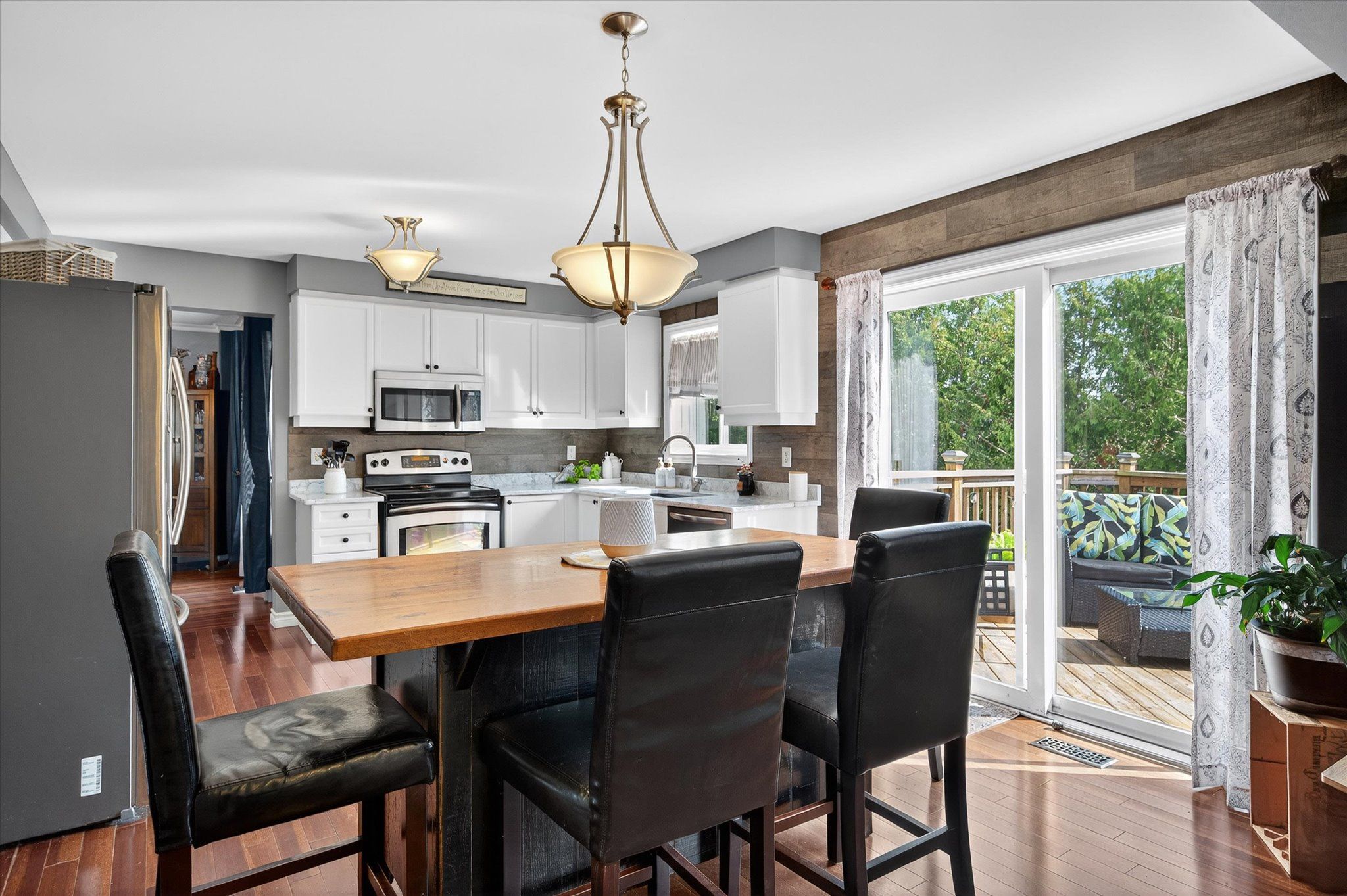 • Spacious open-concept kitchen and bright dining area with deck access.